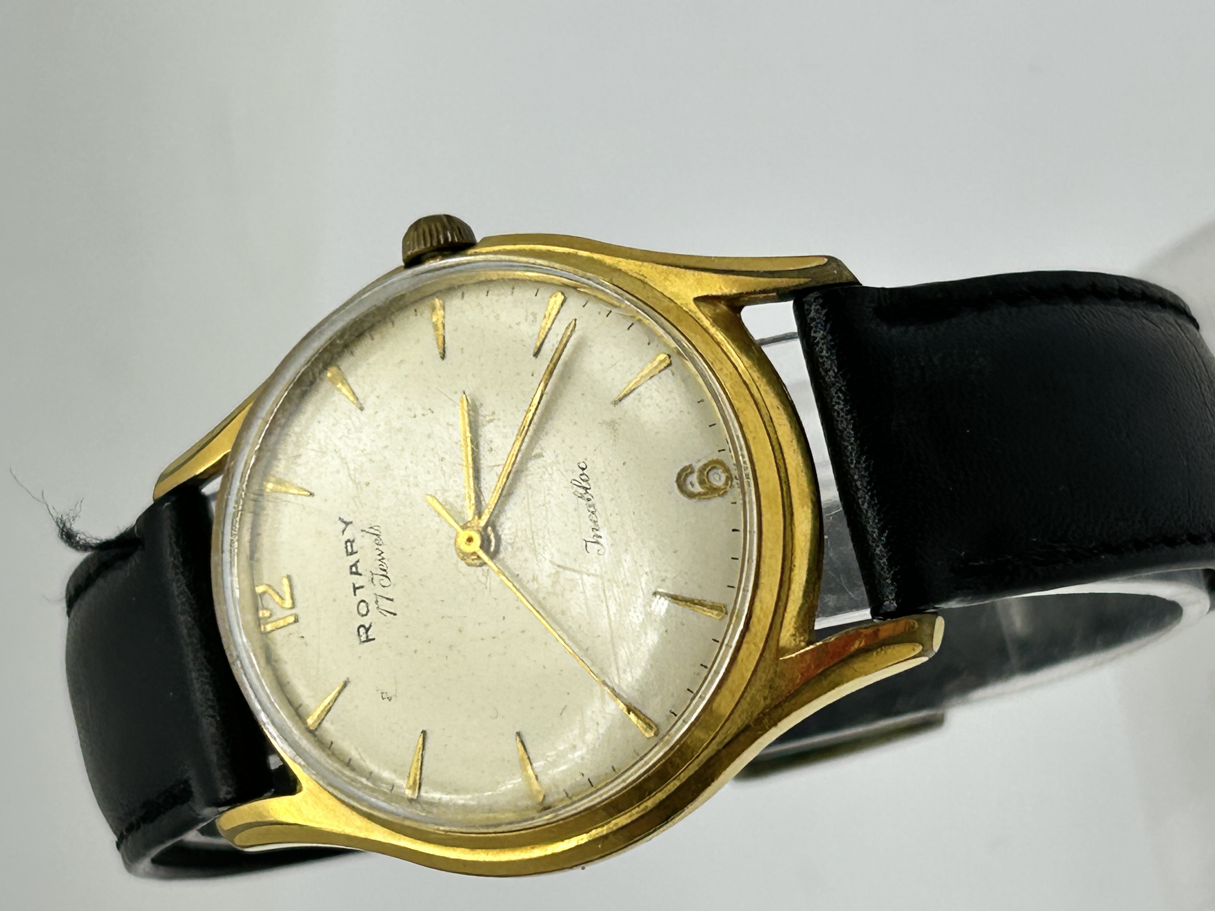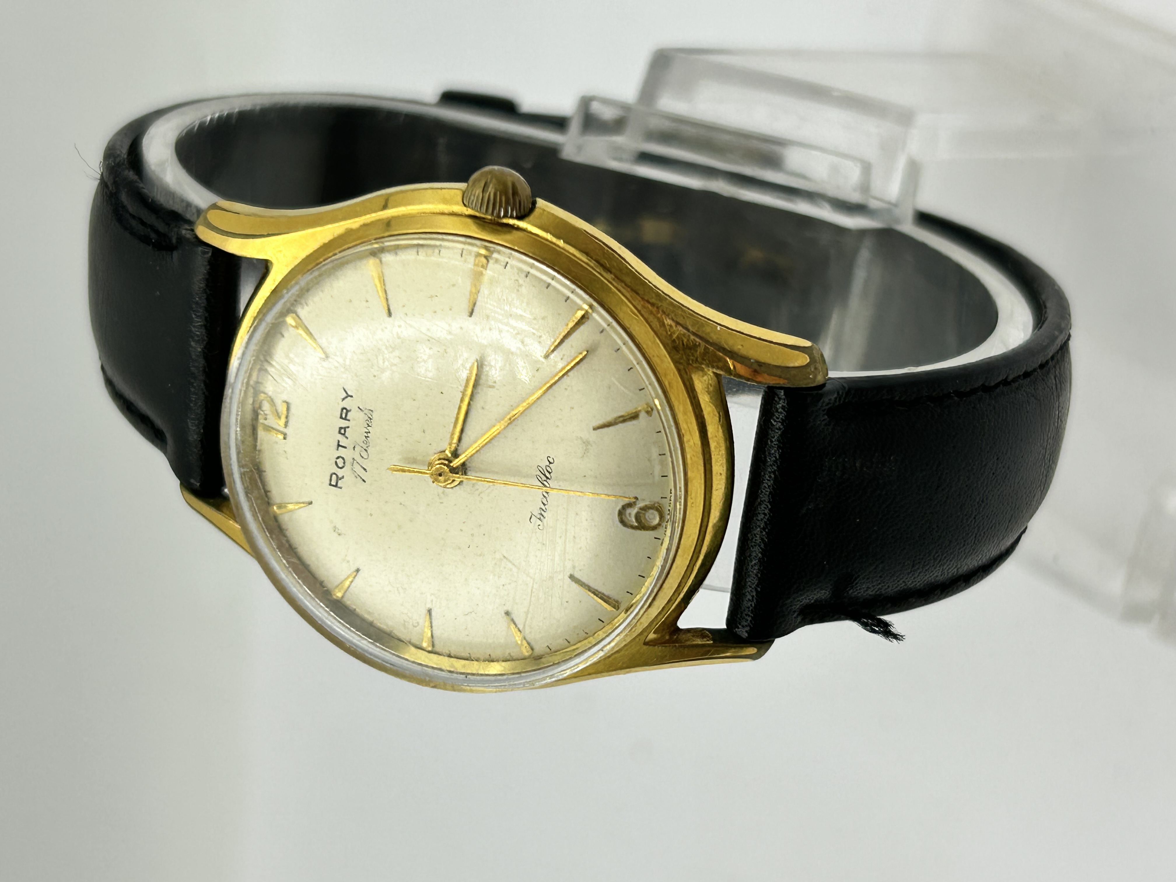A vintage gents mechanical wristwatch by Rotary. The watch features a cream dial with gold-tone baton hour markers and Arabic numerals at the 12 and 6 o’clock positions. The dial is signed ROTARY 17 Jewels below the 12 o’clock position and Incabloc in cursive script above the 6 o’clock position. The case is constructed from gold-plated base metal with tapered lugs and a gold-tone crown. It is powered by a 17 jewel mechanical manual wind movement. The watch is presented on an aftermarket black leather strap with a gold-tone pin buckle.