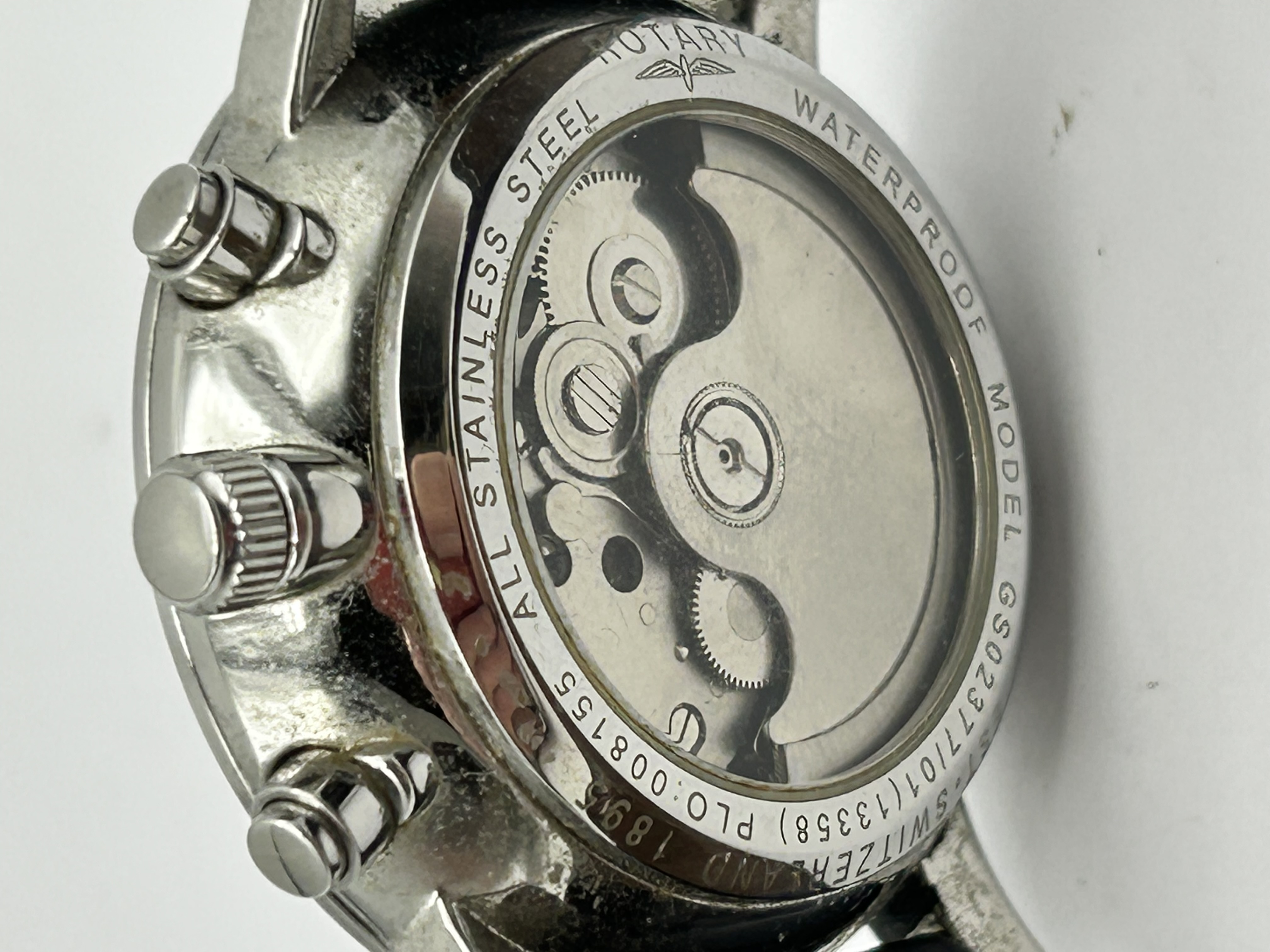 A gentleman’s Rotary automatic wristwatch, model reference GS02377/01 (13358). The timepiece features a polished stainless steel case with an exhibition window to the reverse revealing the self-winding movement. The silvered dial is set with applied silver-tone Roman numeral hour markers and a printed outer minute track. Complications include a date aperture at the 12 o’clock position, a month sub-dial at 9 o’clock, a day-of-the-week sub-dial at 6 o’clock, and a combined 24-hour and moonphase indicator at 3 o’clock. The case is fitted with a fluted crown and two function pushers. The watch is mounted on a black embossed leather strap with a crocodile pattern and a stainless steel pin buckle. The case back is inscribed Rotary, Waterproof, Model GS02377/01 (13358), Switzerland 1895, PLO:008155, and All Stainless Steel. The dial is marked Rotary with the winged logo and Est. Switzerland.