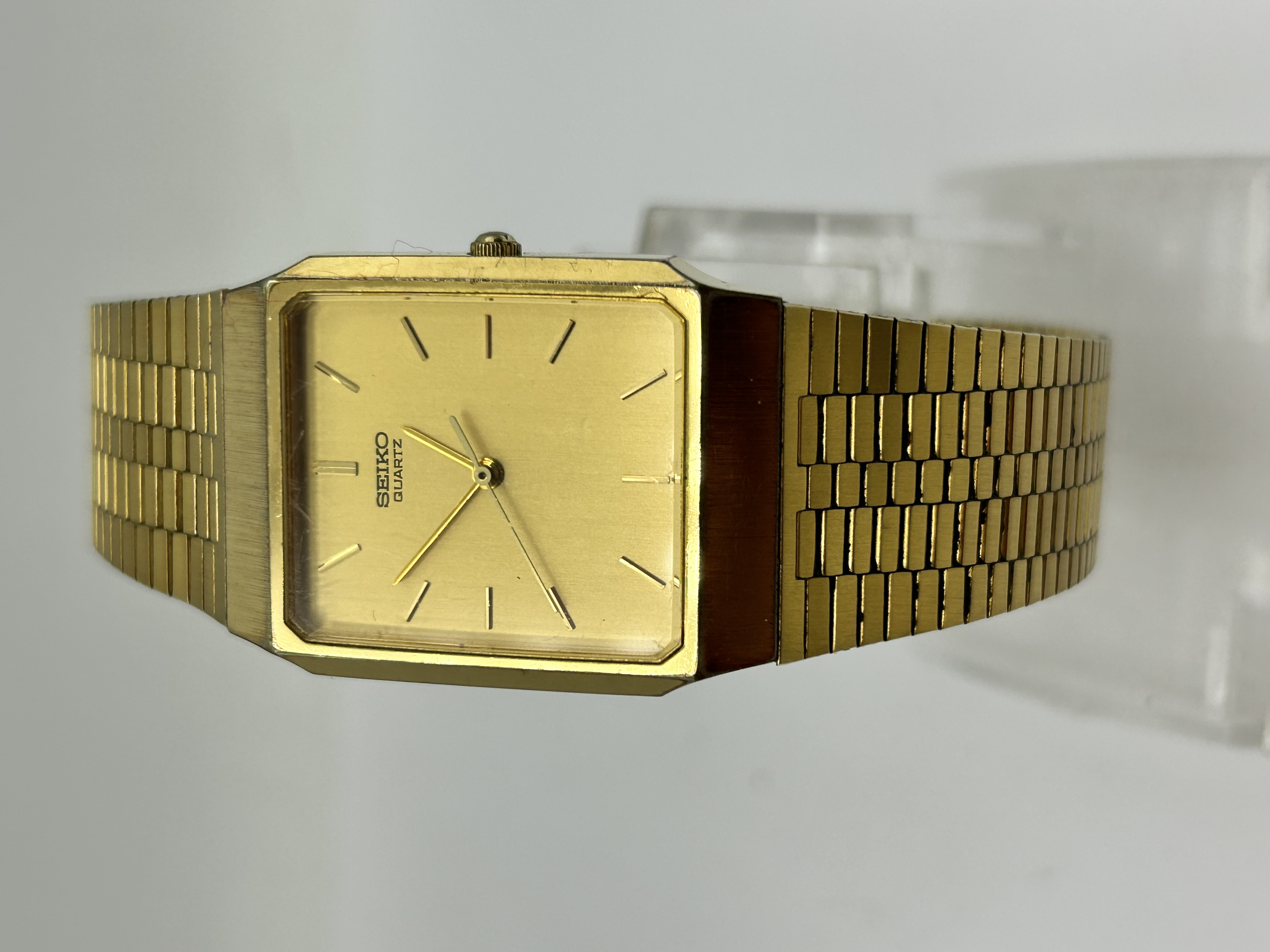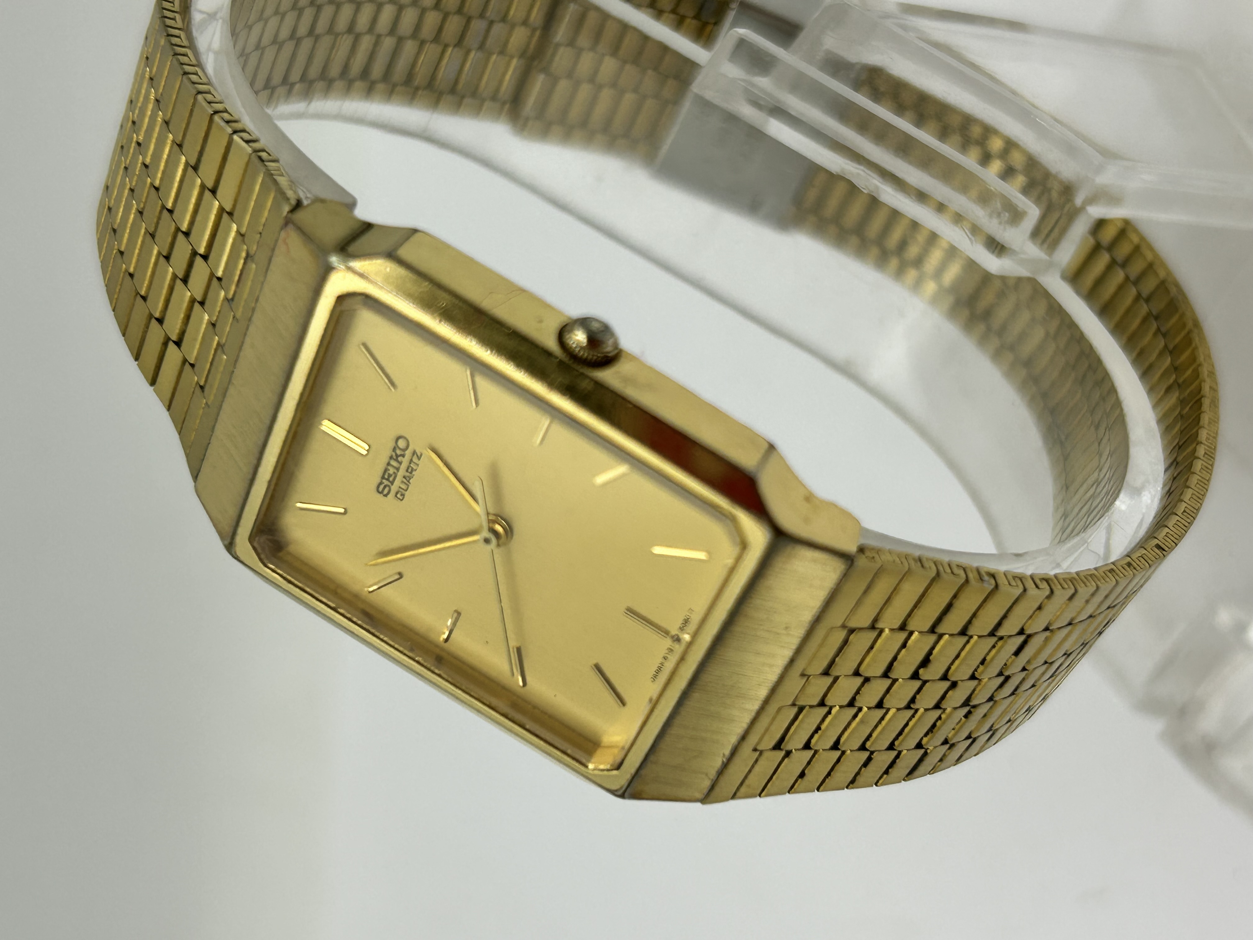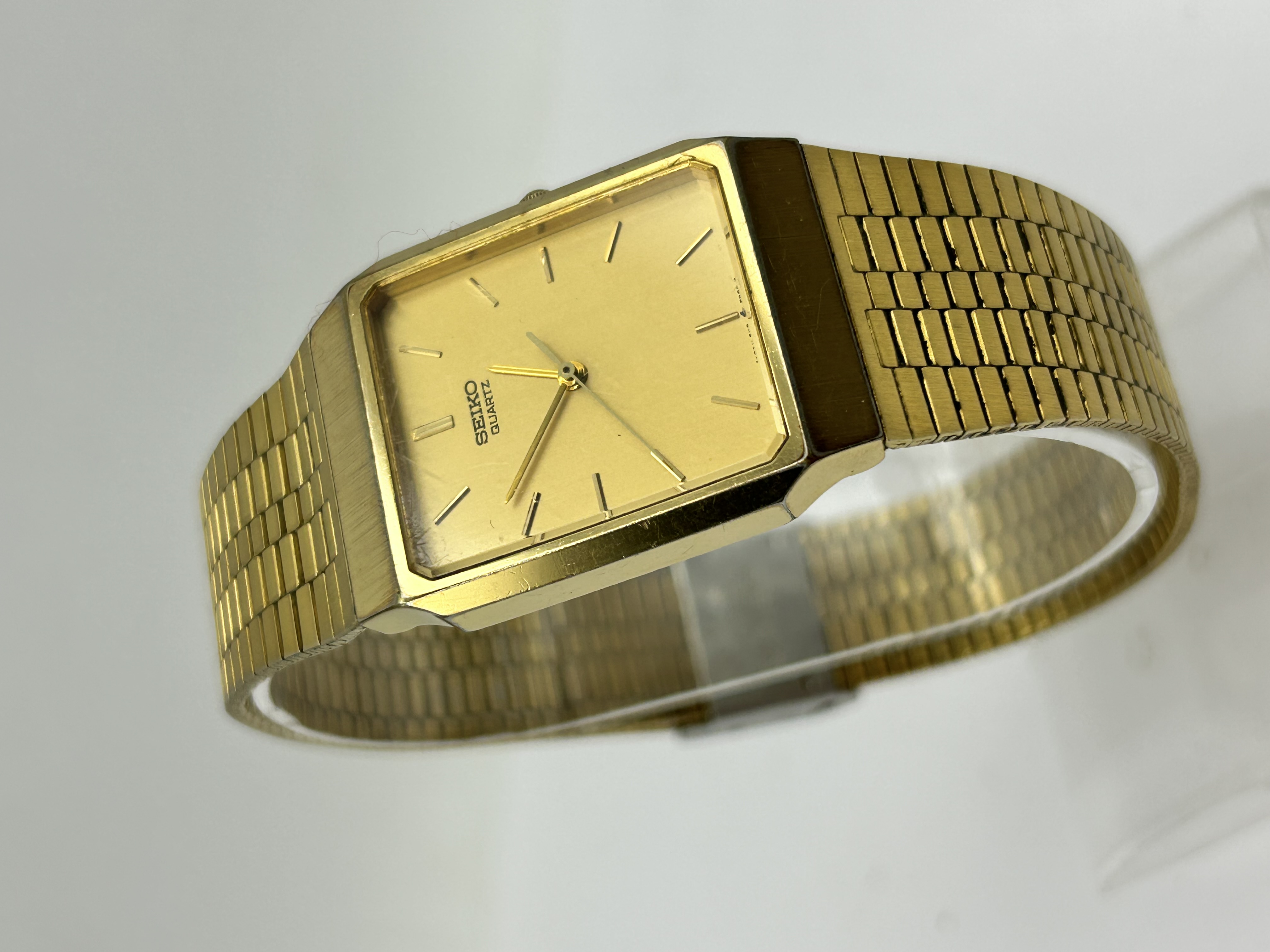 A vintage Seiko quartz dress watch featuring a rectangular gold-tone plated case with bevelled corners. The champagne dial is set with applied gold-tone baton hour markers and matching sword hands. The dial is signed Seiko Quartz above the centre and Japan 8191-5030T below the six o’clock position. The timepiece is powered by a caliber 8191 quartz movement and is presented on an integrated, multi-link textured bracelet in a matching gold-tone finish with a fold-over clasp. No box or papers are present. Serial number is not visible.