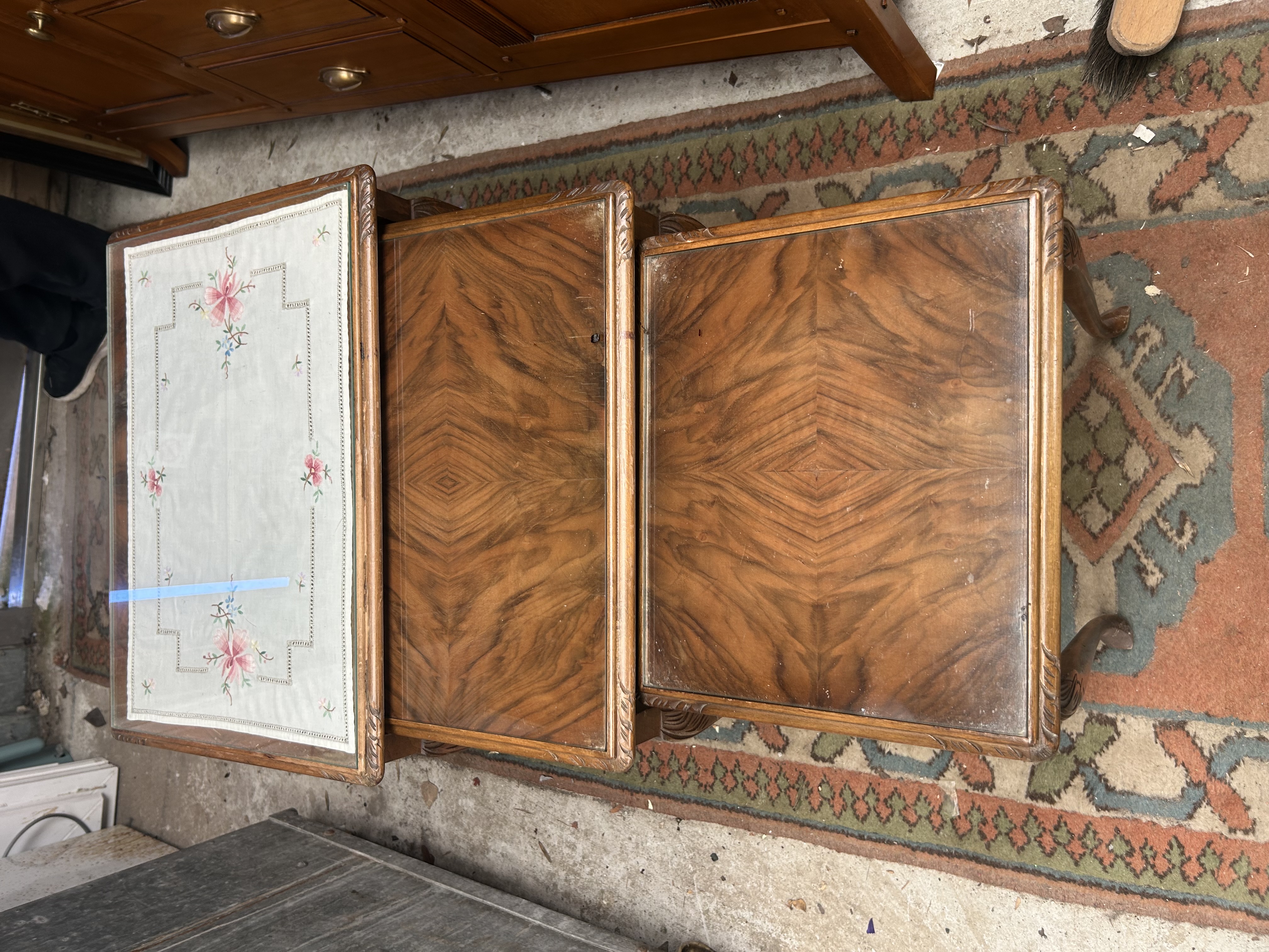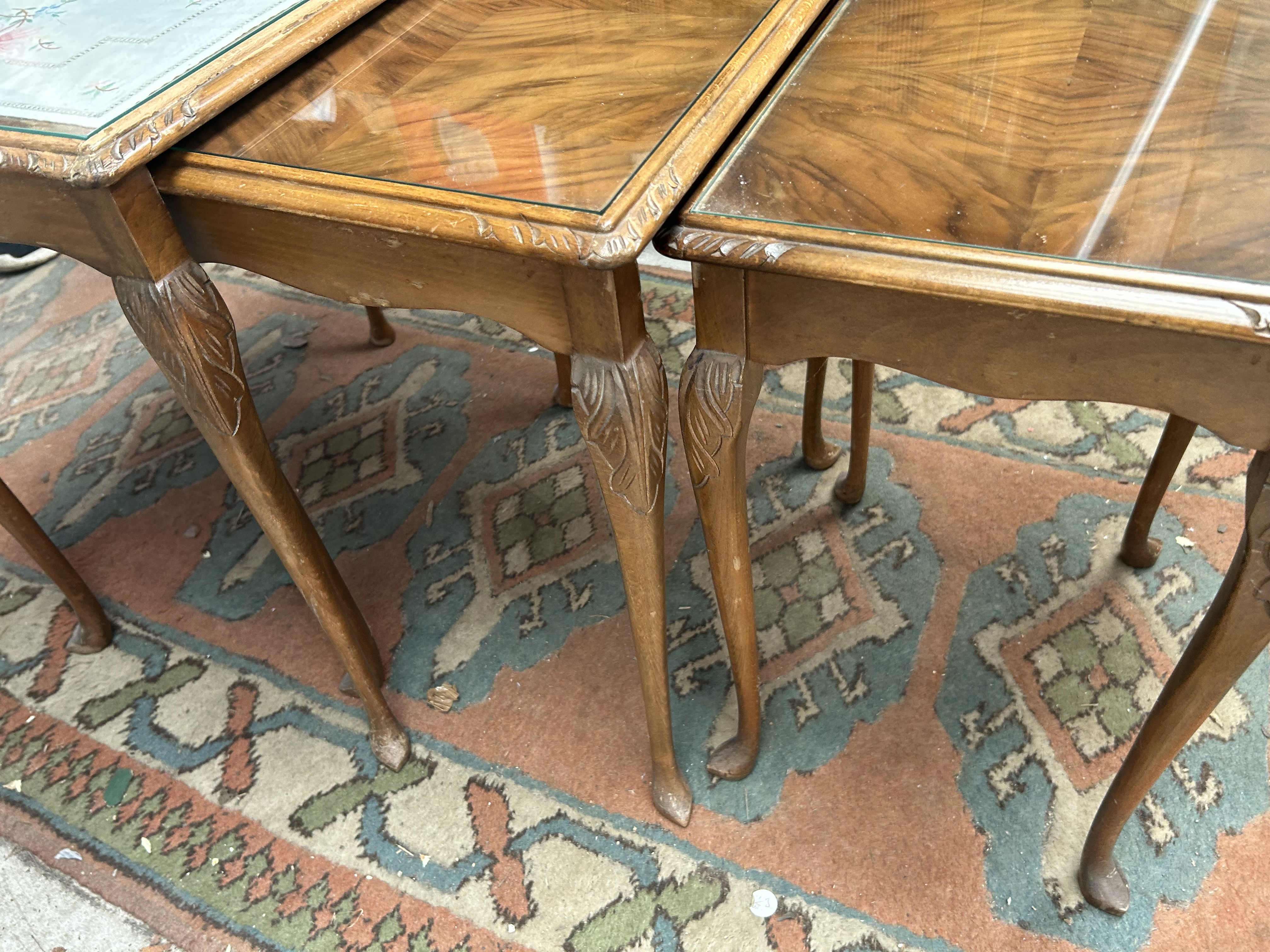 A trio of nesting side tables in the Queen Anne revival style, dating from the mid-20th century. The construction features walnut veneer tops on stained hardwood frames. Each table is fitted with a glass-inset top. The largest table contains a cream-coloured textile panel with an embroidered floral design positioned beneath the glass. The two smaller tables feature book-matched walnut veneers in a diamond pattern. The edges of the tops are finished with a carved gadrooned or feathered border. Each table is supported on four cabriole legs with foliate-carved knees, terminating in pad feet. No maker’s marks, labels, or inscriptions are visible on the surfaces.