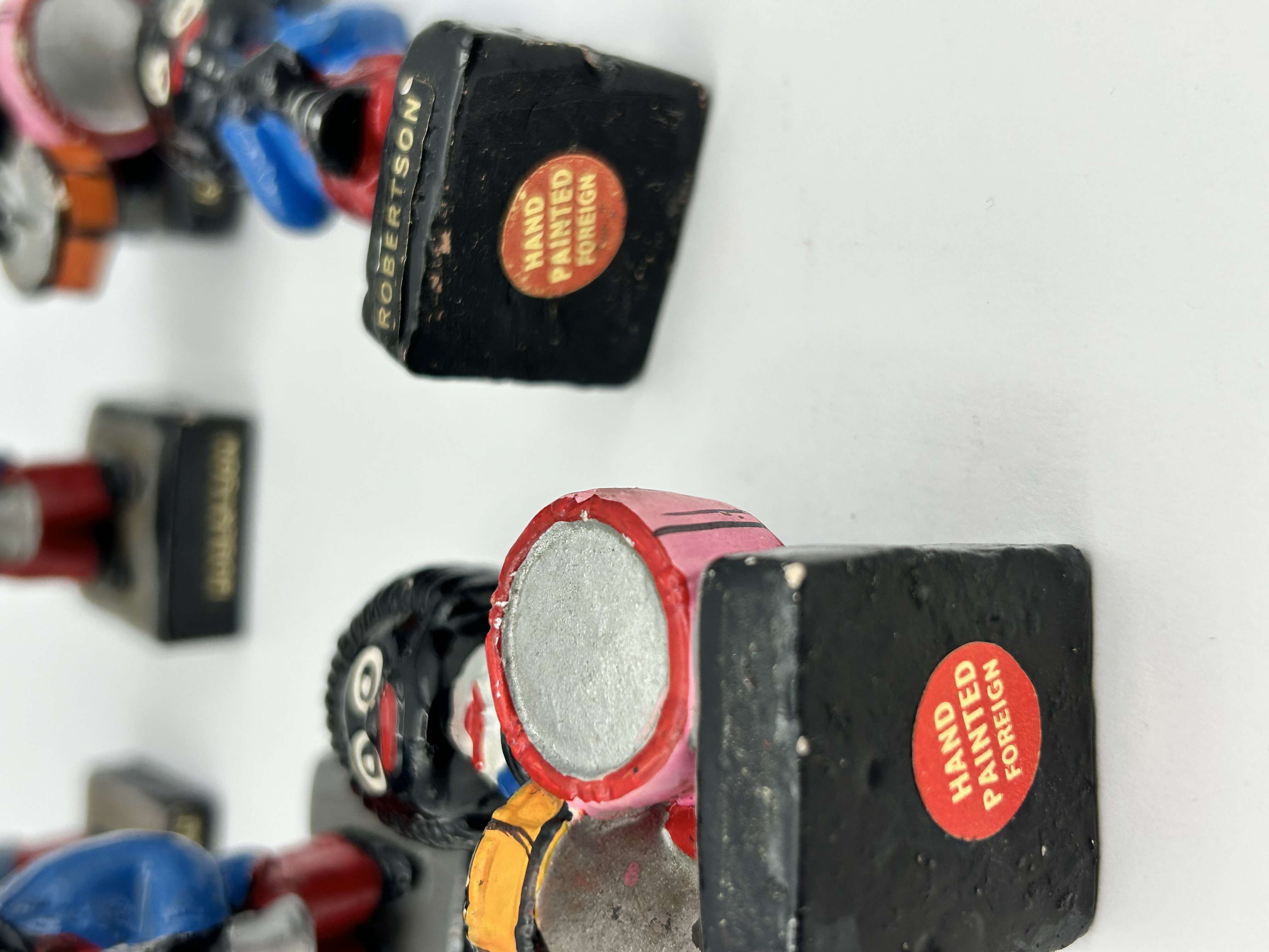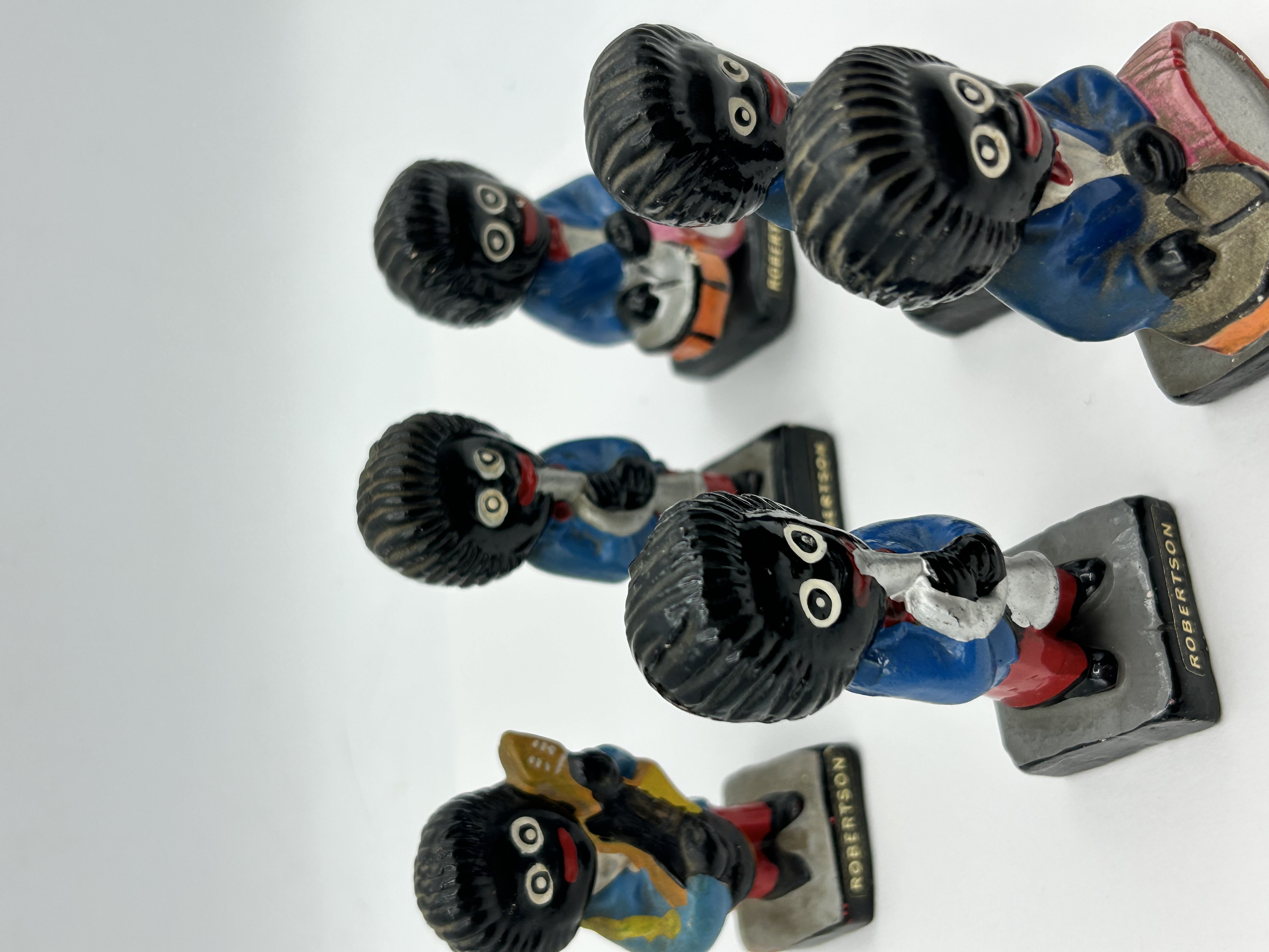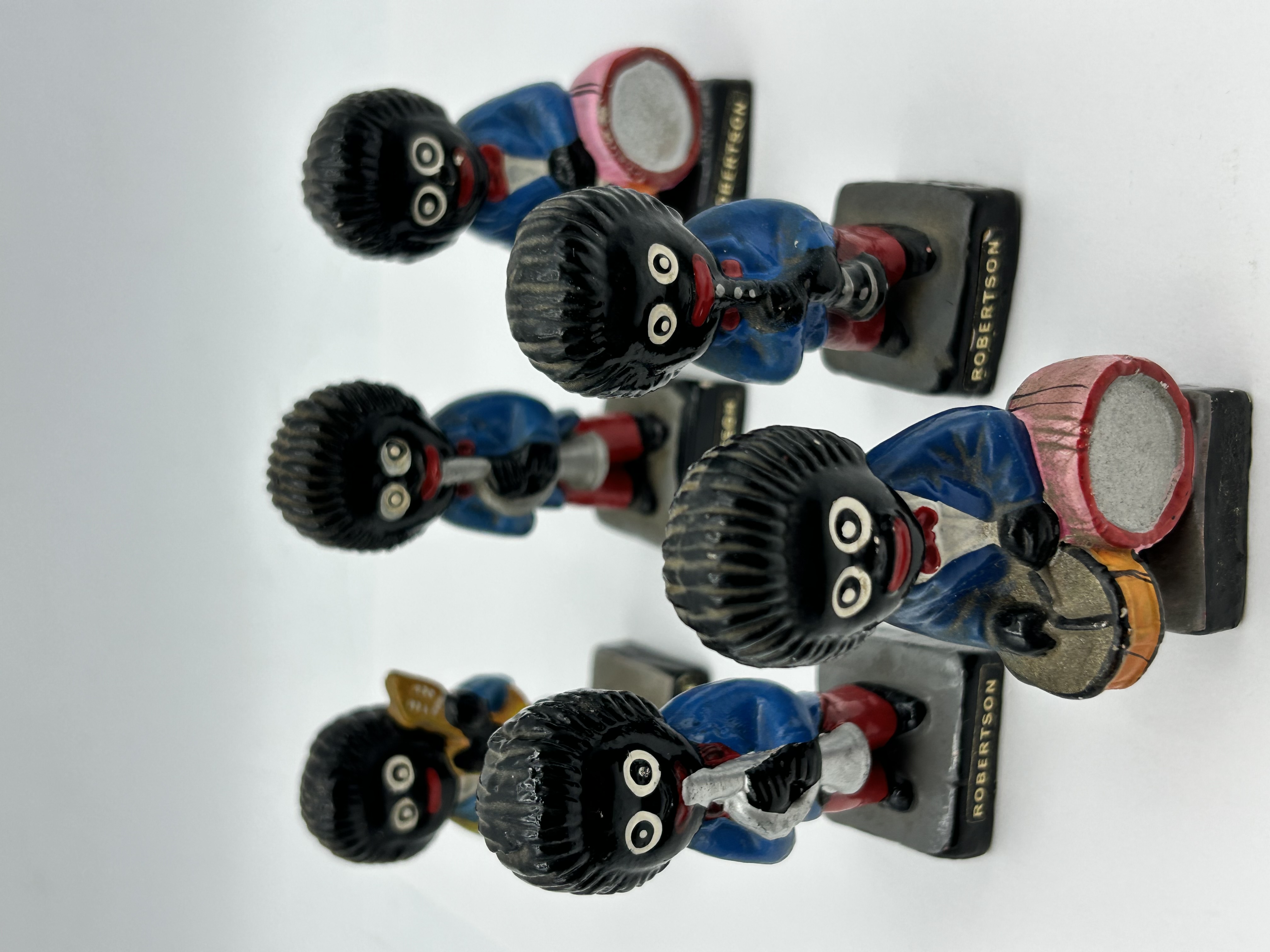 This set of six promotional figurines was produced for James Robertson and Sons. The collection depicts a jazz band, with each figure playing a different musical instrument including a guitar, saxophone, drums, and trumpets. The figures are constructed from painted plaster or composition material. Each character is dressed in a blue tuxedo jacket, white shirt, red bow-tie, and red trousers, standing on square black bases. The name ROBERTSON is printed in gold-toned characters on the side of each base. The underside of the bases features a circular red and white adhesive label printed with HAND PAINTED and FOREIGN. These mascots were used as promotional items for Robertson’s preserves during the mid-20th century.