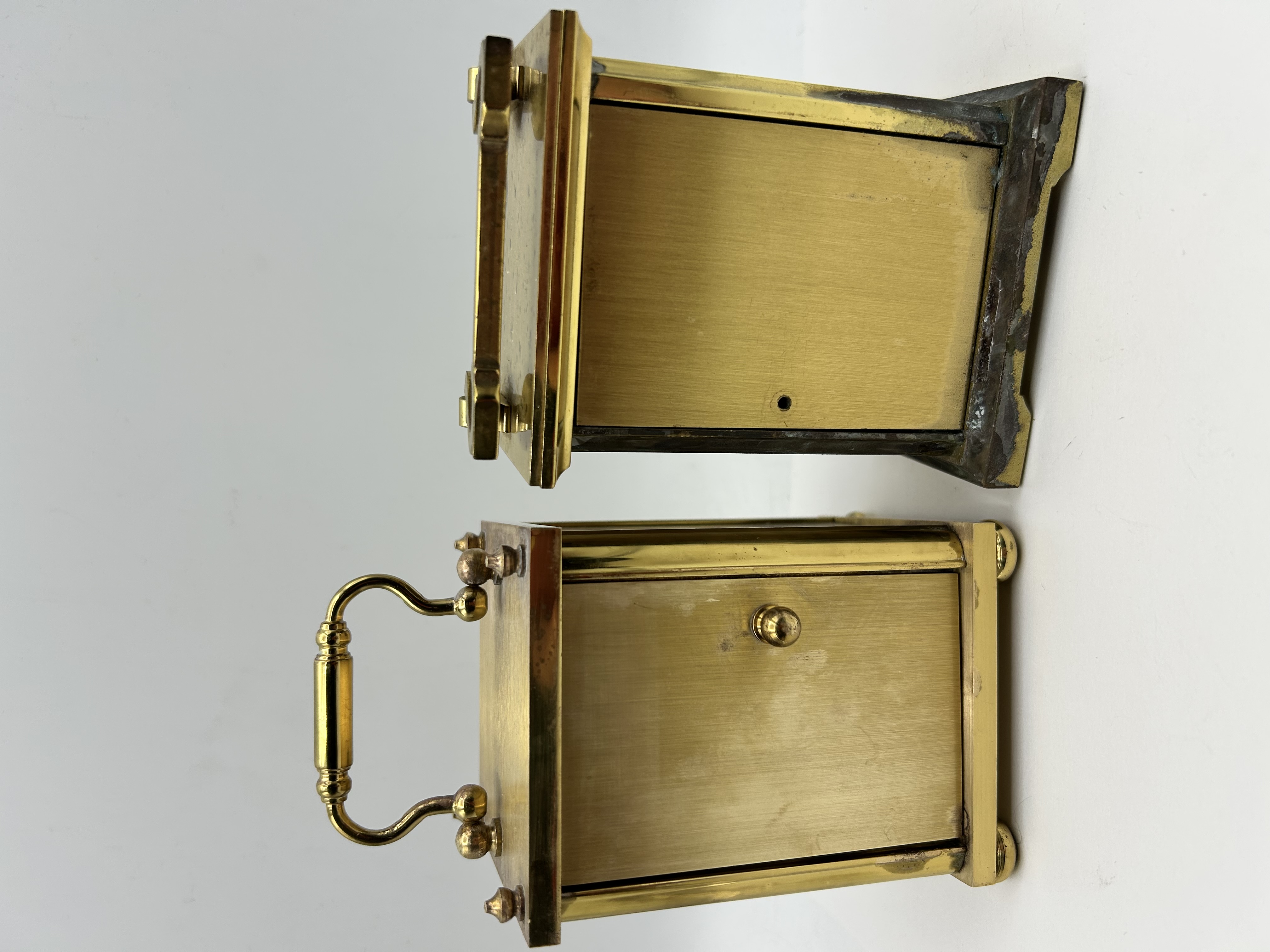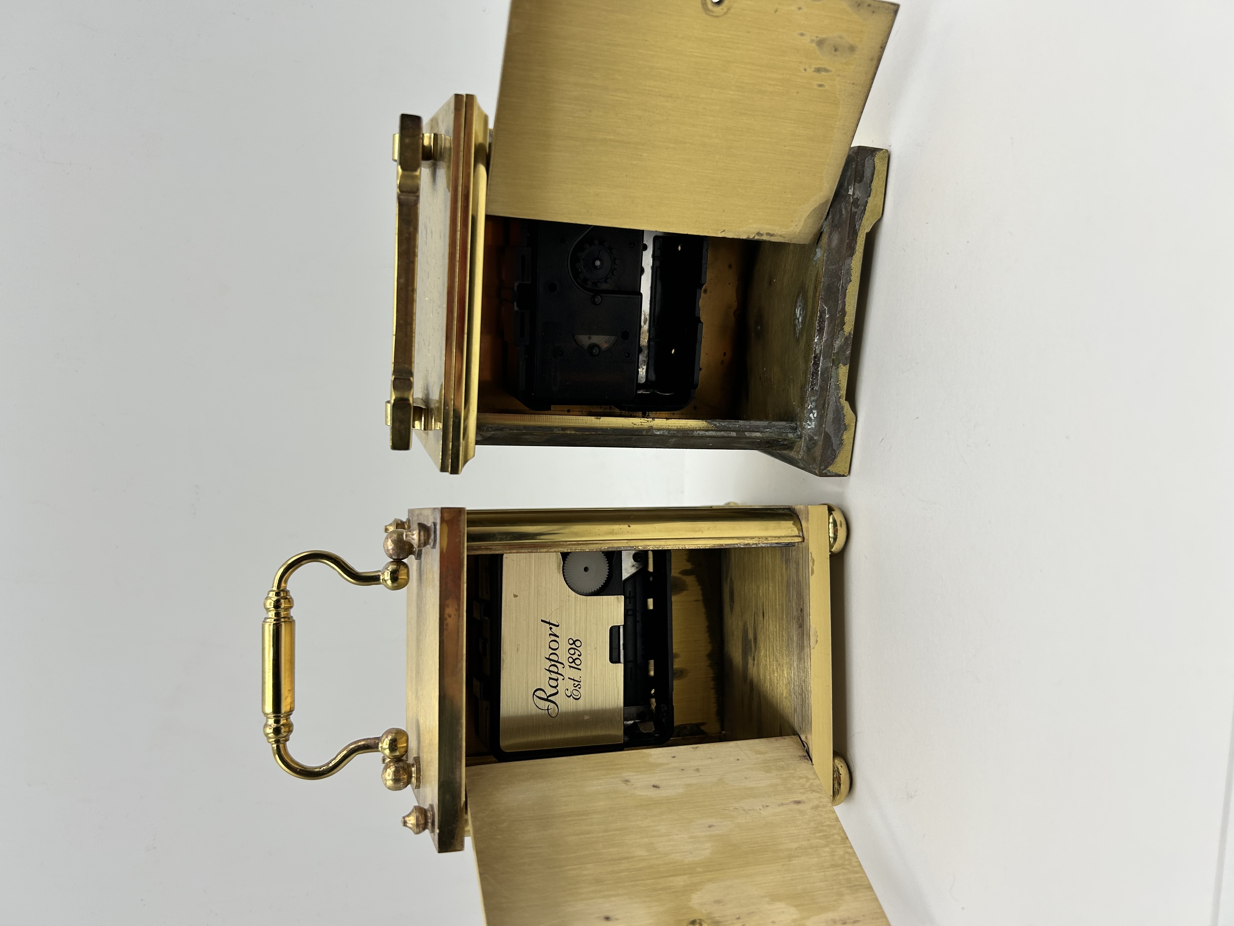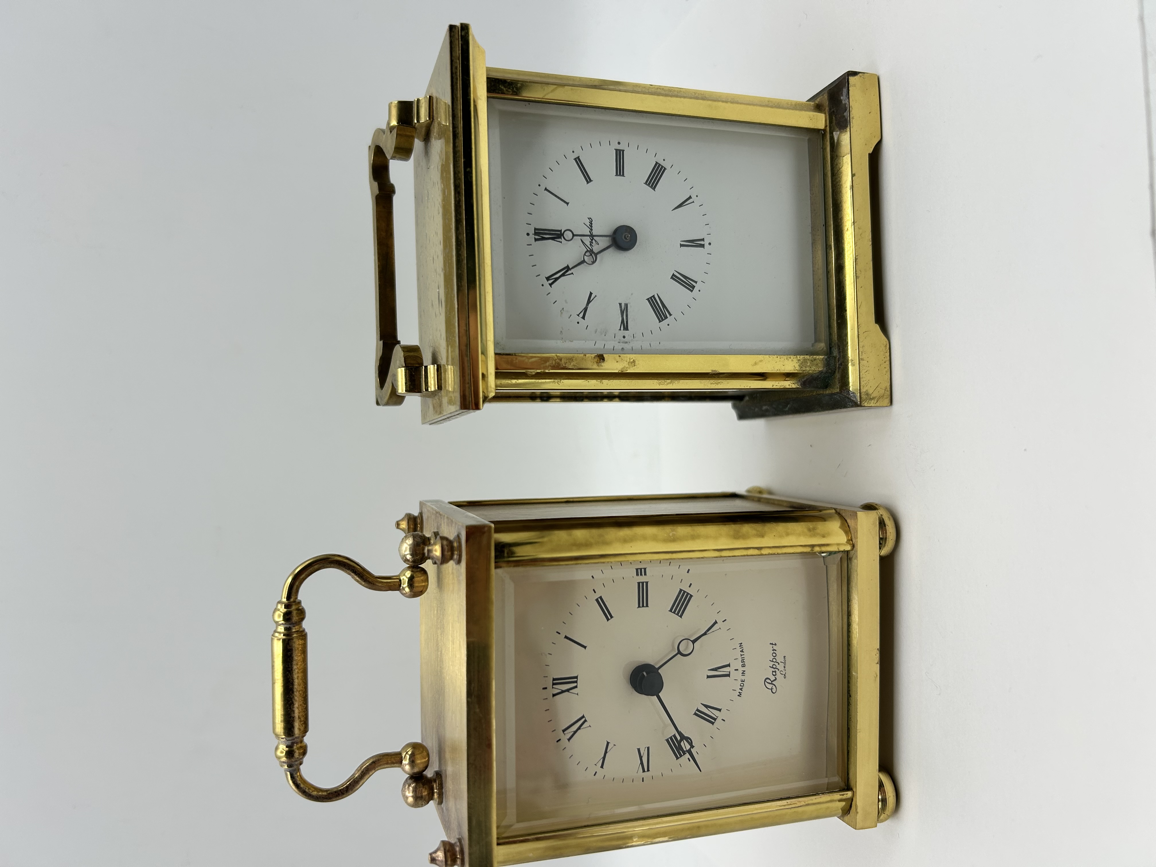 This lot comprises two modern brass cased carriage clocks of varying designs. The first clock, by Angelus, features a rectangular brass case with a flat top and a fixed style handle. The white dial is set with black Roman numeral hour markers and ornate black hands. Access to the movement is via a rear door, which reveals a black plastic quartz movement housing. The second clock is by Rapport, London, and is marked Made in Britain. This item features a polished brass case with a swinging carrying handle and is supported by four bun feet. The cream coloured dial displays black Roman numeral hour markers and black Breguet style hands. The interior movement cover has a brass effect finish and bears the inscription Rapport Est. 1898. Both clocks utilize quartz movements.
