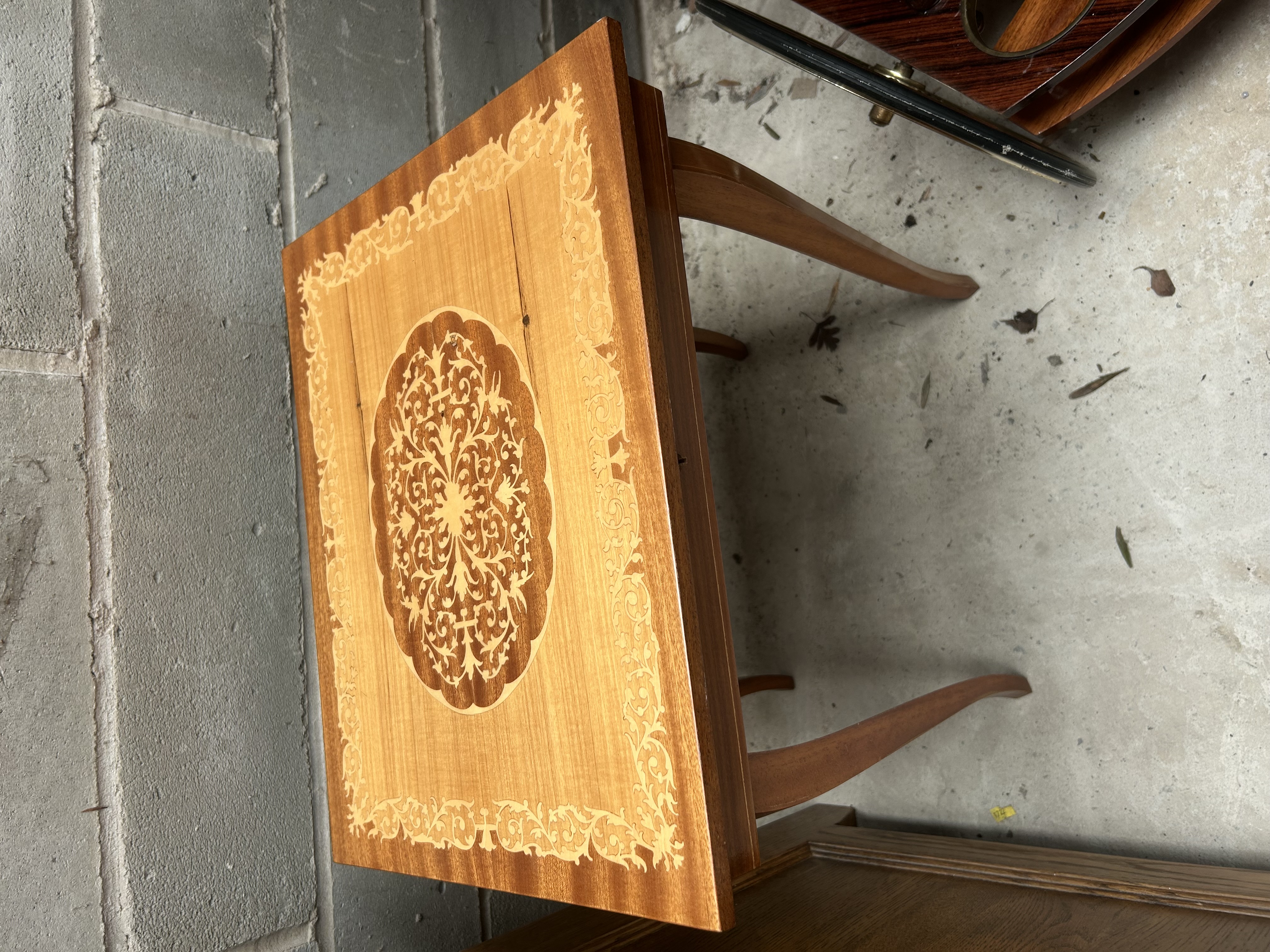 An Italian occasional side table in the Sorrento style. The rectangular top is finished with a polished wood veneer and features intricate light-wood marquetry inlays. The decoration consists of a central scalloped medallion with a dense scrolling foliate pattern, mirrored by a matching decorative border. The top is supported by four slender, solid wood cabriole legs. This form is characteristic of mid-century Italian musical tables. No maker’s marks or signatures are visible on the surfaces.