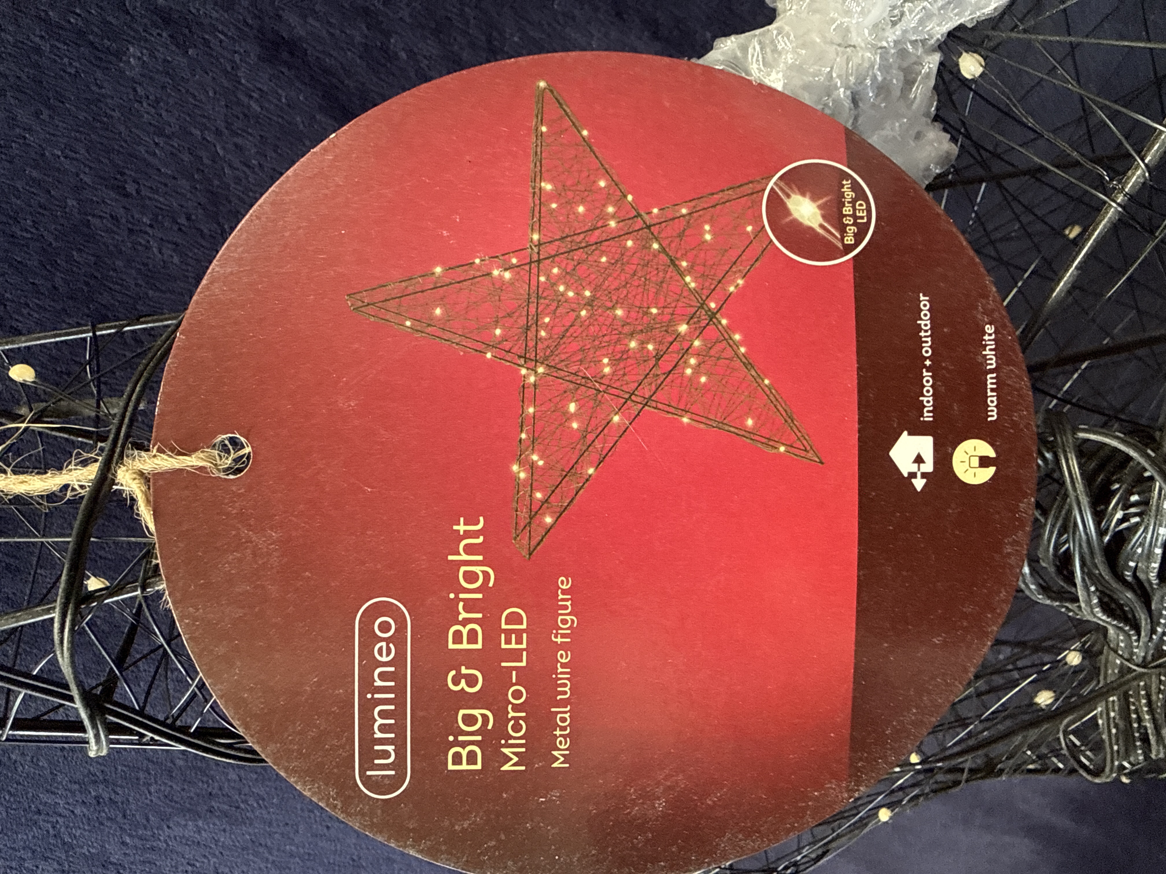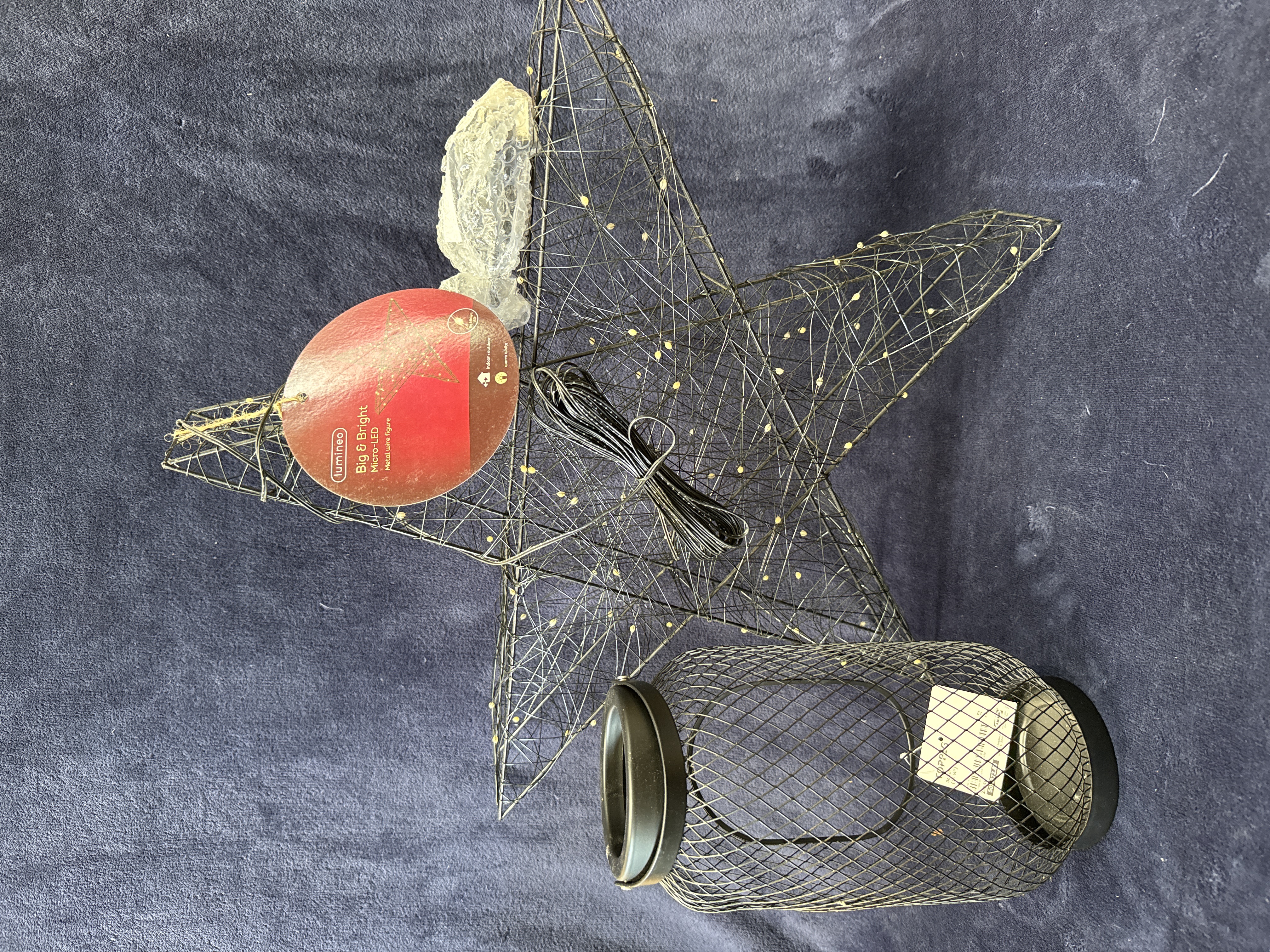 This lot comprises two contemporary decorative metal items. The first is a Lumineo Big & Bright micro-LED metal wire star figure. The star features a black wire frame construction with integrated warm white micro-LED lights, designed for both indoor and outdoor use. It retains its original retail tag and partial protective bubble wrap. The second item is an IKEA Toppig mesh lantern, featuring a cylindrical form constructed from black-coated metal wire mesh. The lantern includes its original cardboard retail tag with product number 503.272.89.