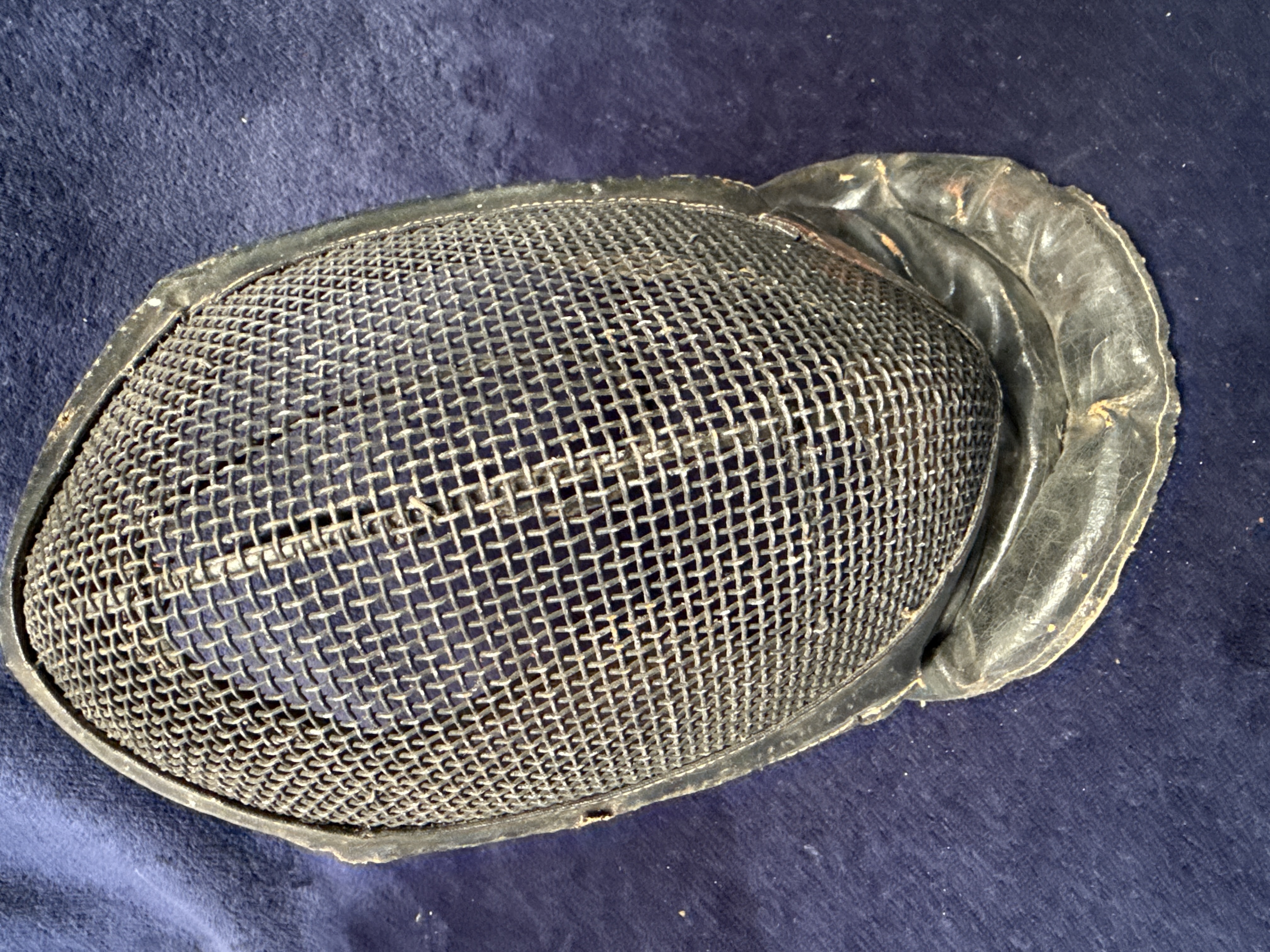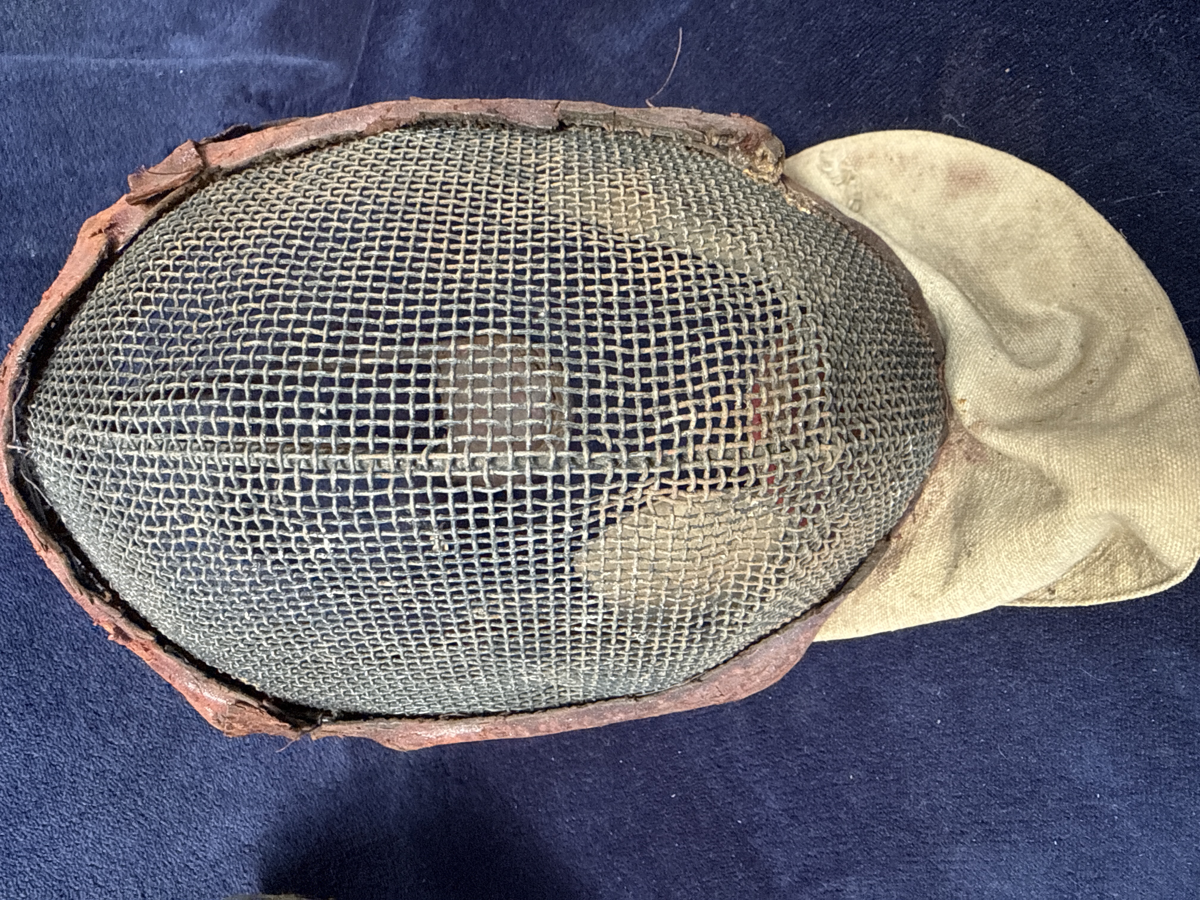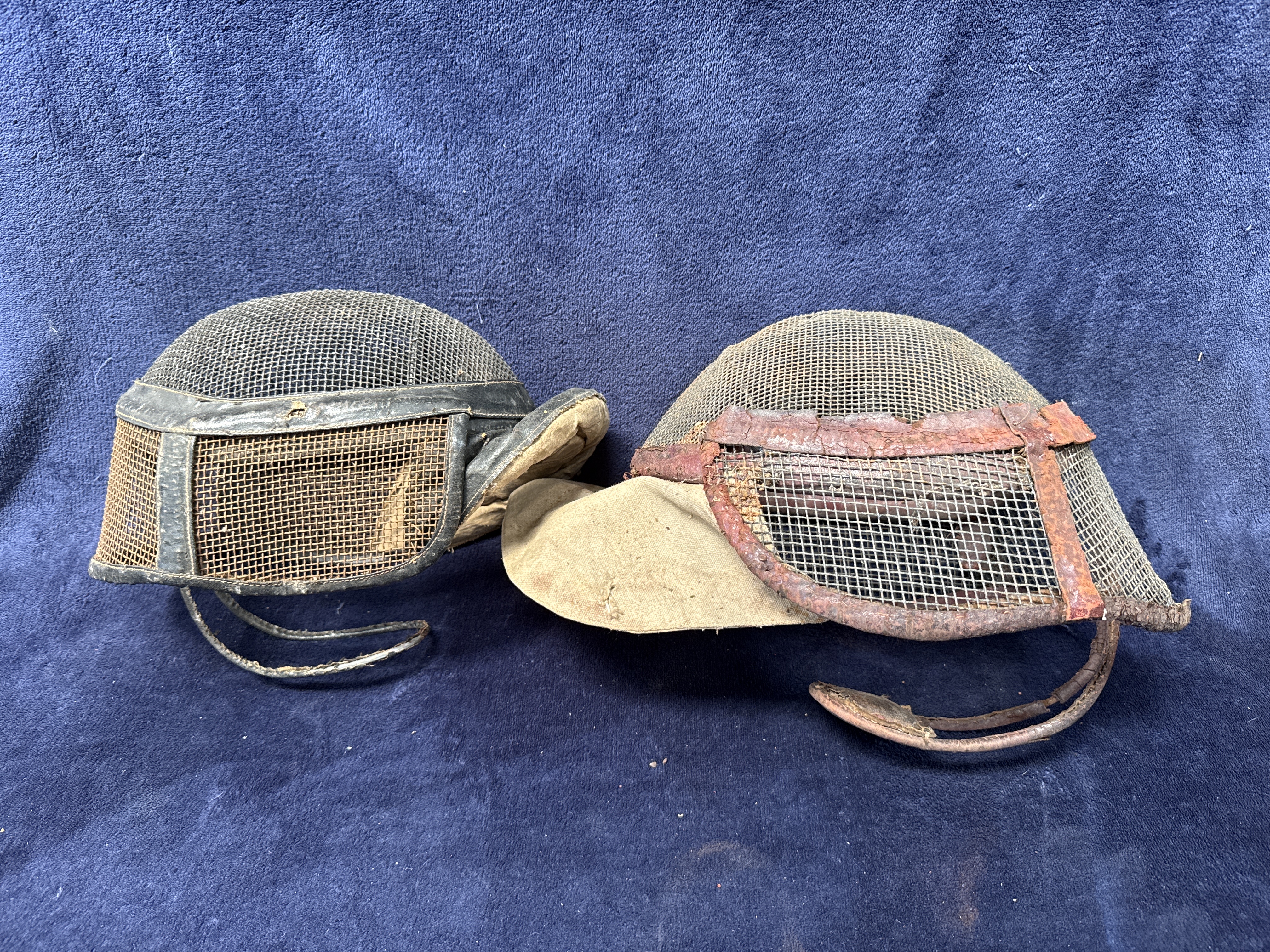 This lot consists of two vintage fencing masks dating from the early to mid-20th century. The first mask features a dark-finished wire mesh face guard bordered by black leather or leatherette trim with a matching black padded bib for neck protection. A curved metal support bar is attached at the chin area. The second mask is constructed with a lighter-coloured metal wire mesh guard and a tan or beige canvas fabric bib. It features a reddish-brown trim material around the face guard and a similar curved metal support bar at the base. Both masks are characteristic of traditional European fencing equipment from the first half of the 20th century, often used for sport or military bayonet training. No maker’s marks or signatures are visible on the exterior of either item.