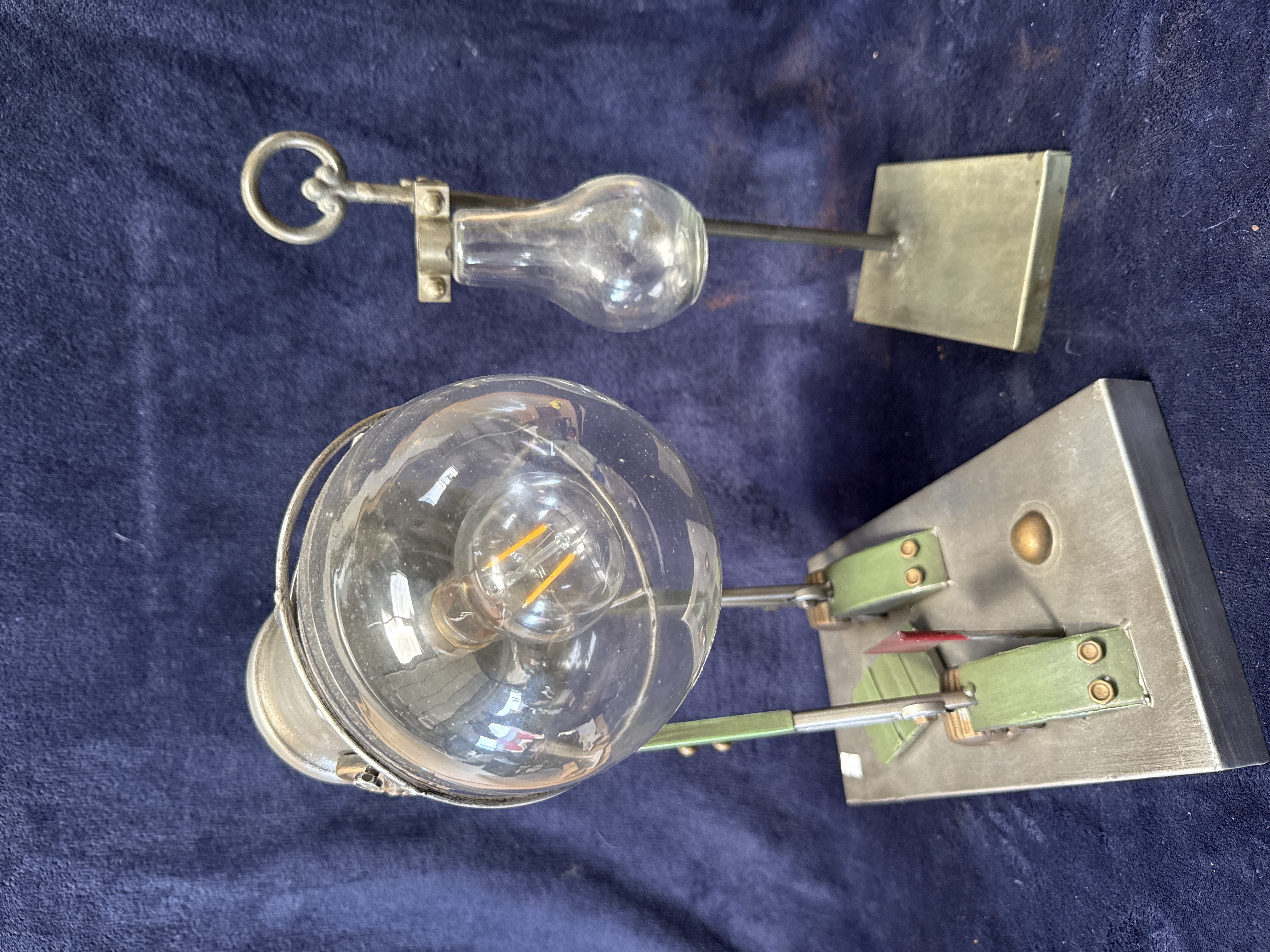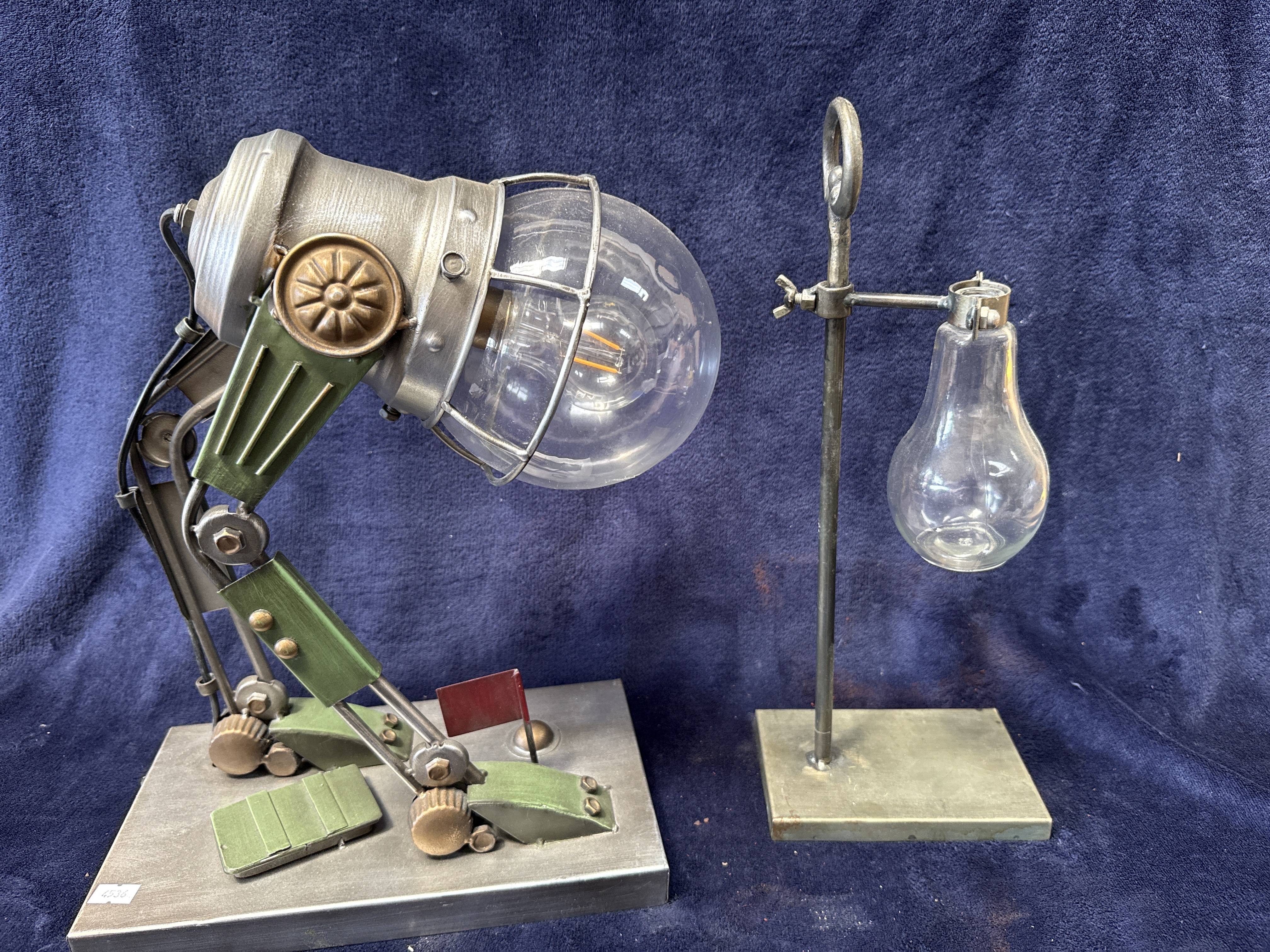 A lot of two contemporary decorative items designed in an industrial aesthetic. The first item is a sculptural table lamp in the form of a mechanical figure, constructed from metal with a sage green and brushed steel finish and brass-toned accents. The lamp features a large clear glass bulbous shade, resembling an early incandescent bulb in the style of those by Swan or Edison, with an external wire cage and contains a modern LED filament bulb. The figure is mounted on a rectangular brushed metal base featuring a small red metal flag. The second item is a laboratory-style decorative ornament featuring a clear glass pear-shaped vessel suspended from a metal stand by an adjustable wing-nut clamp on a rectangular base. No maker marks are present.