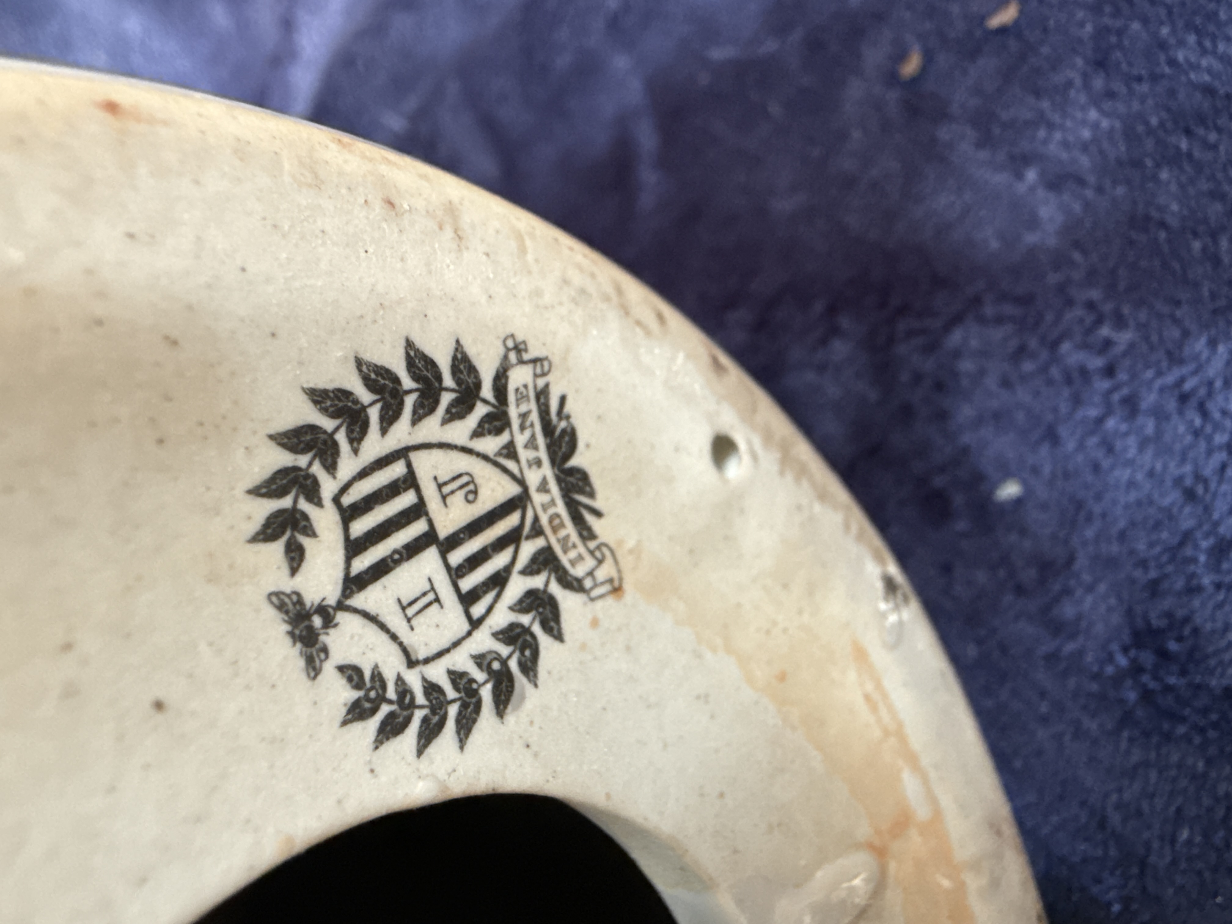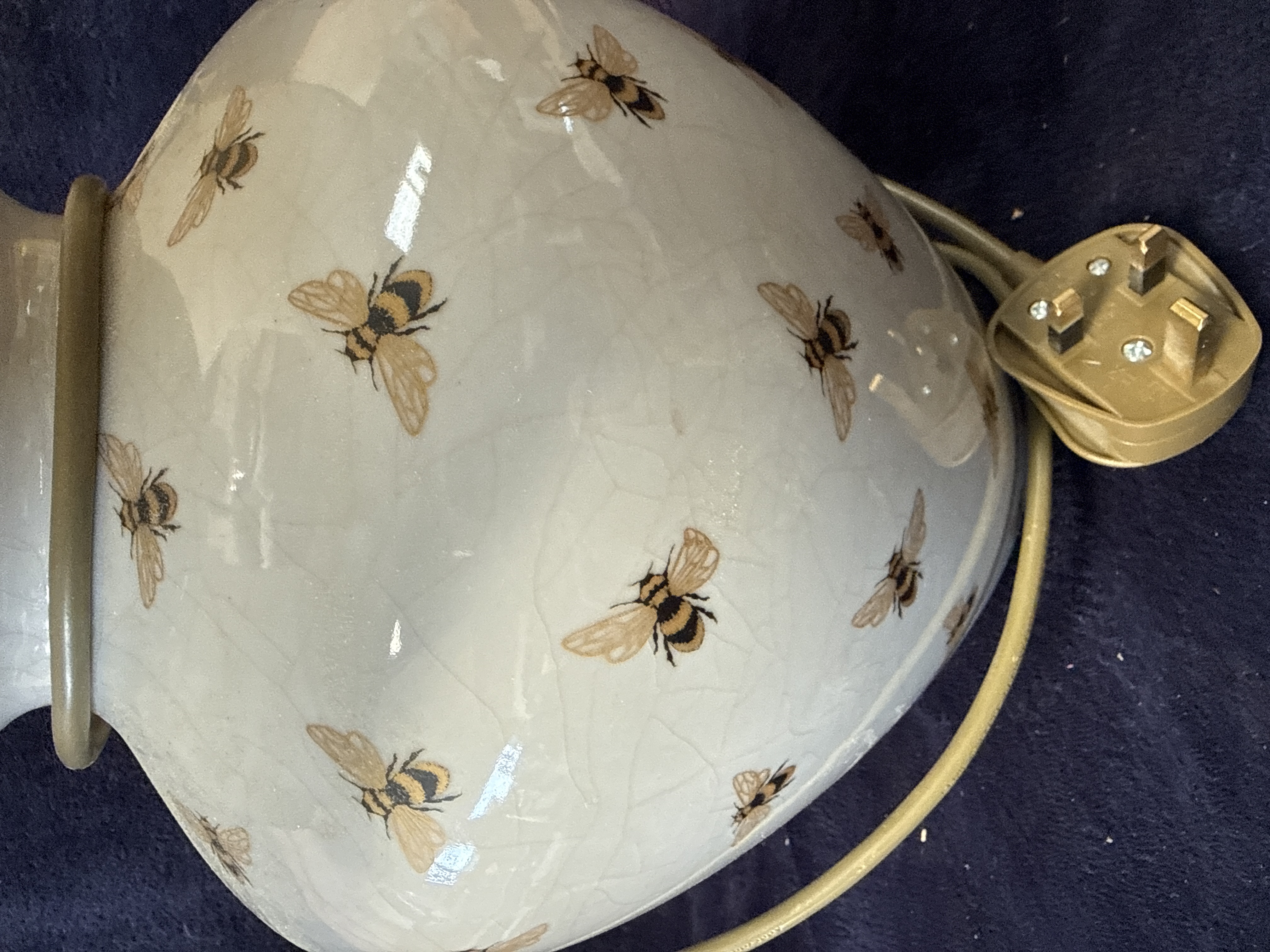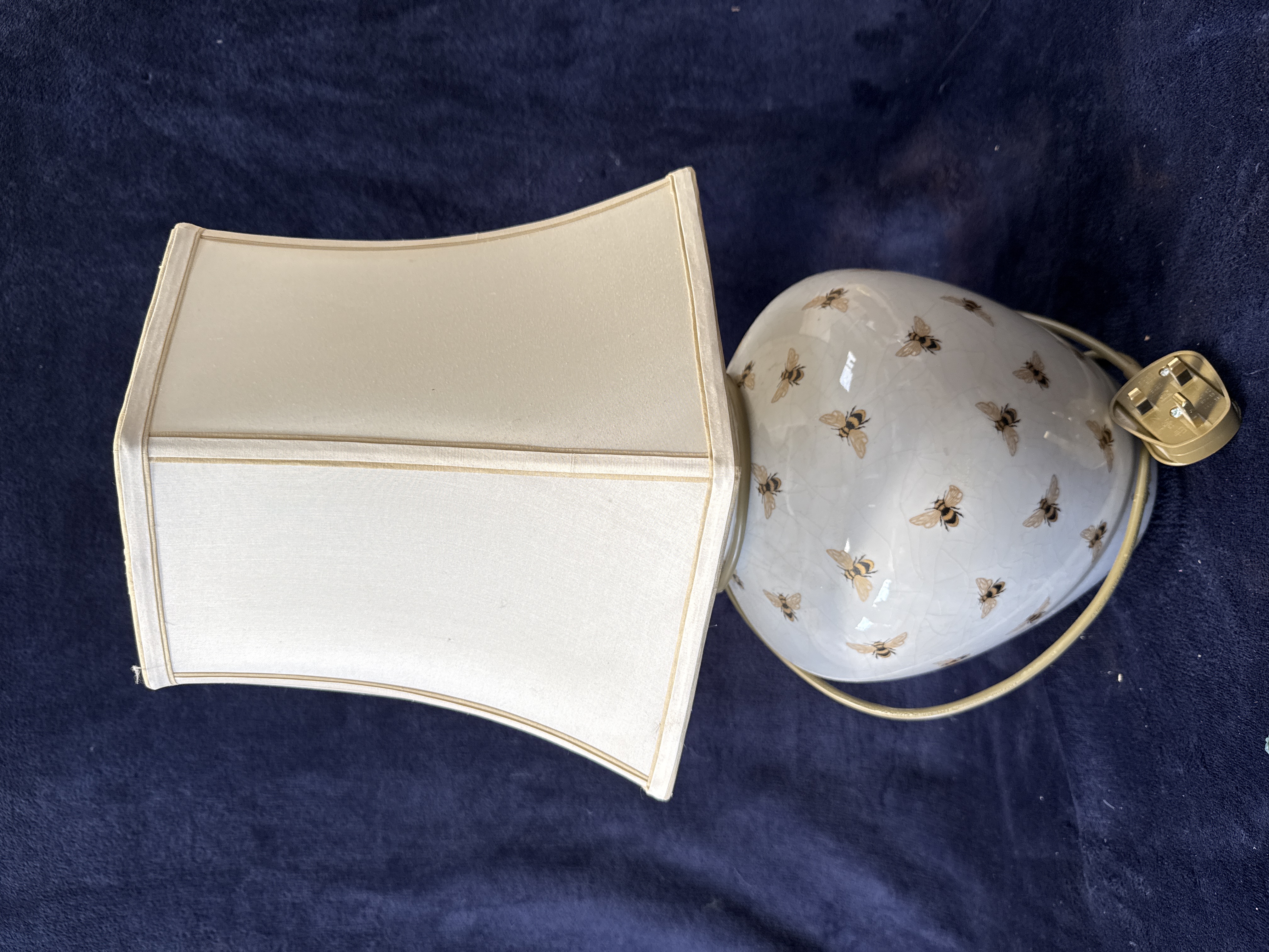 A ceramic table lamp by India Jane featuring a baluster-form base. The ceramic body is finished in a cream crackle glaze and is hand painted with bumblebee motifs. The lamp is paired with a rectangular, tapered fabric shade in a cream colour, accented with gold-toned corded trim. The electrical cord is a gold-toned plastic-coated flex terminating in a standard United Kingdom three-pin plug. The underside of the base displays a printed black manufacturer mark featuring a laurel wreath, a shield with the letters I and J, and a banner inscribed INDIA JANE.