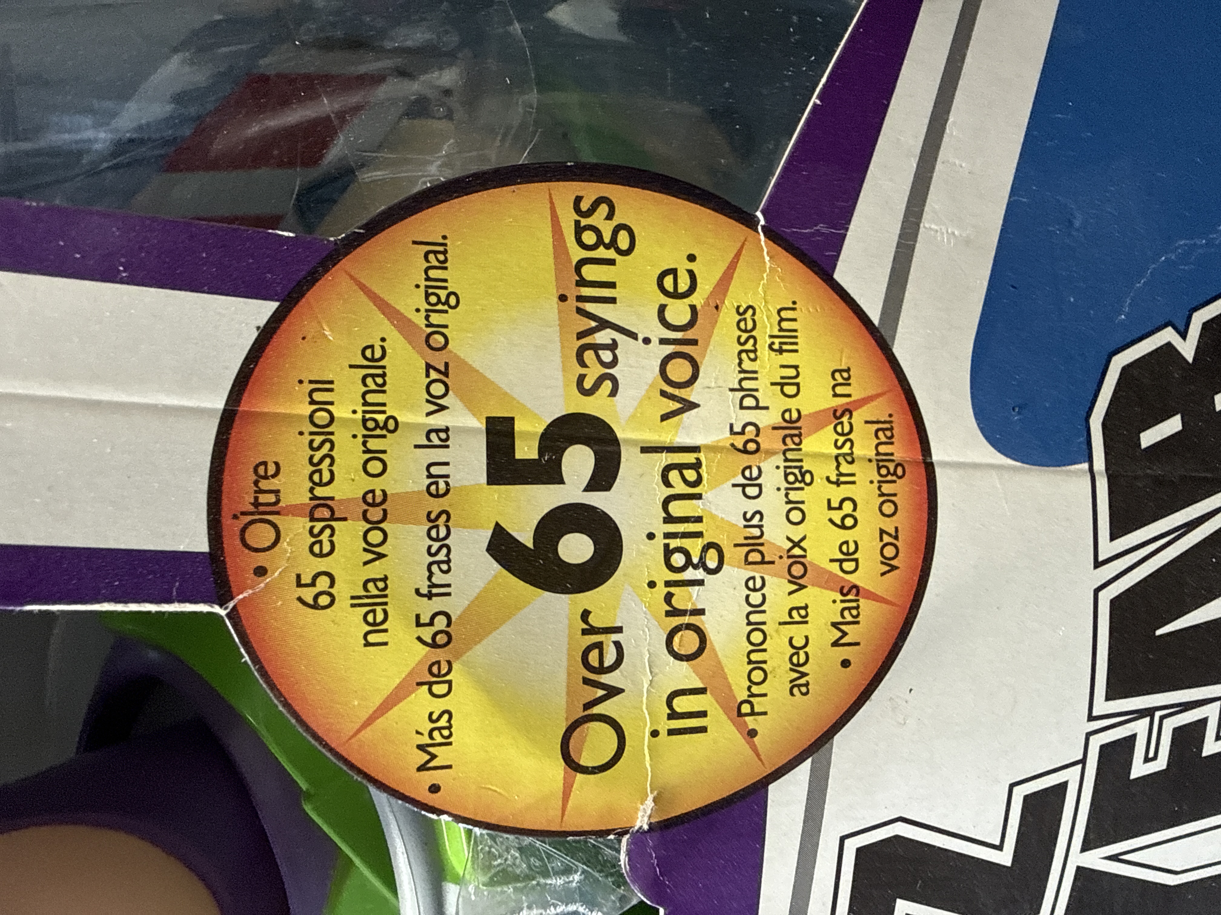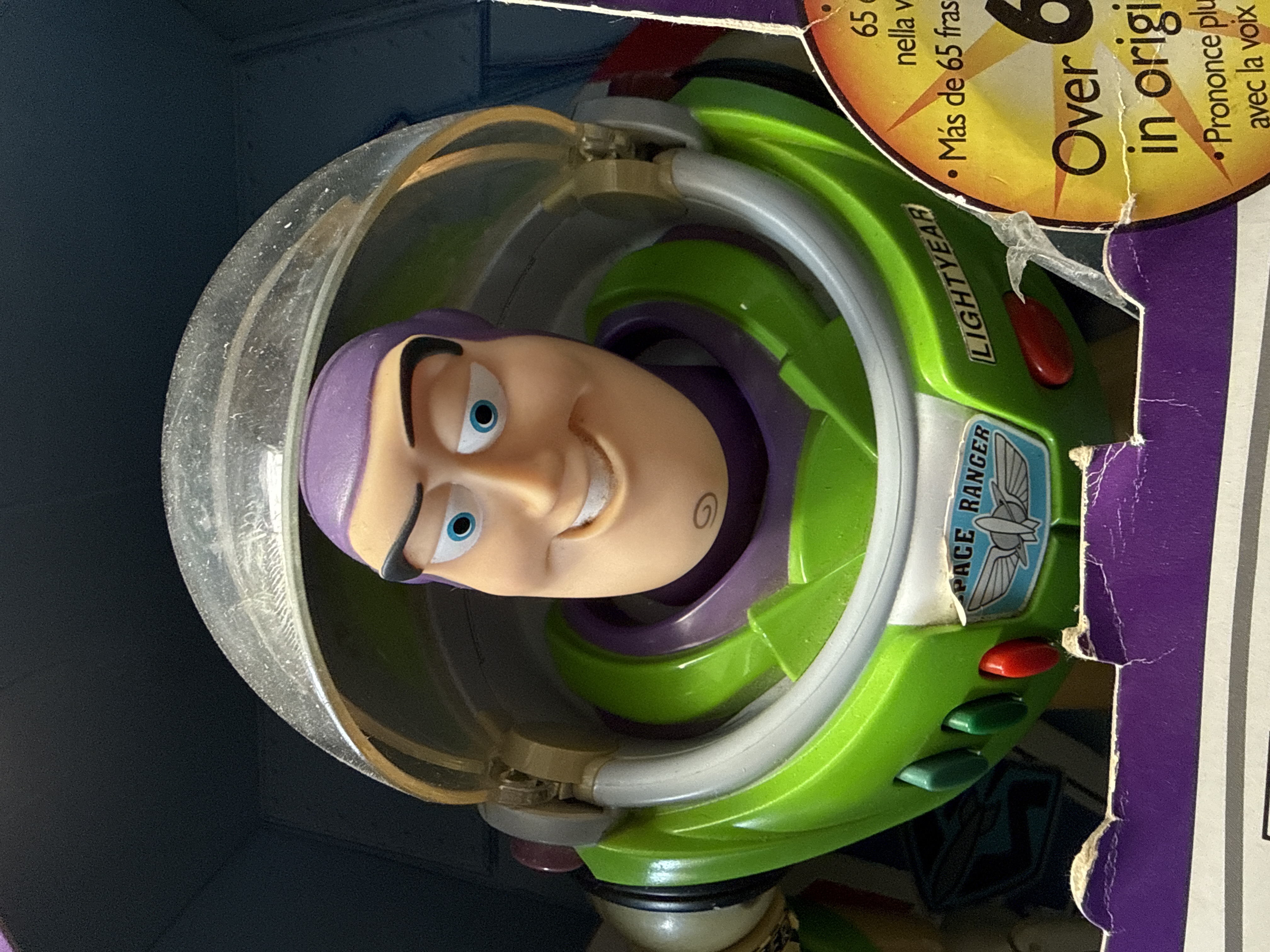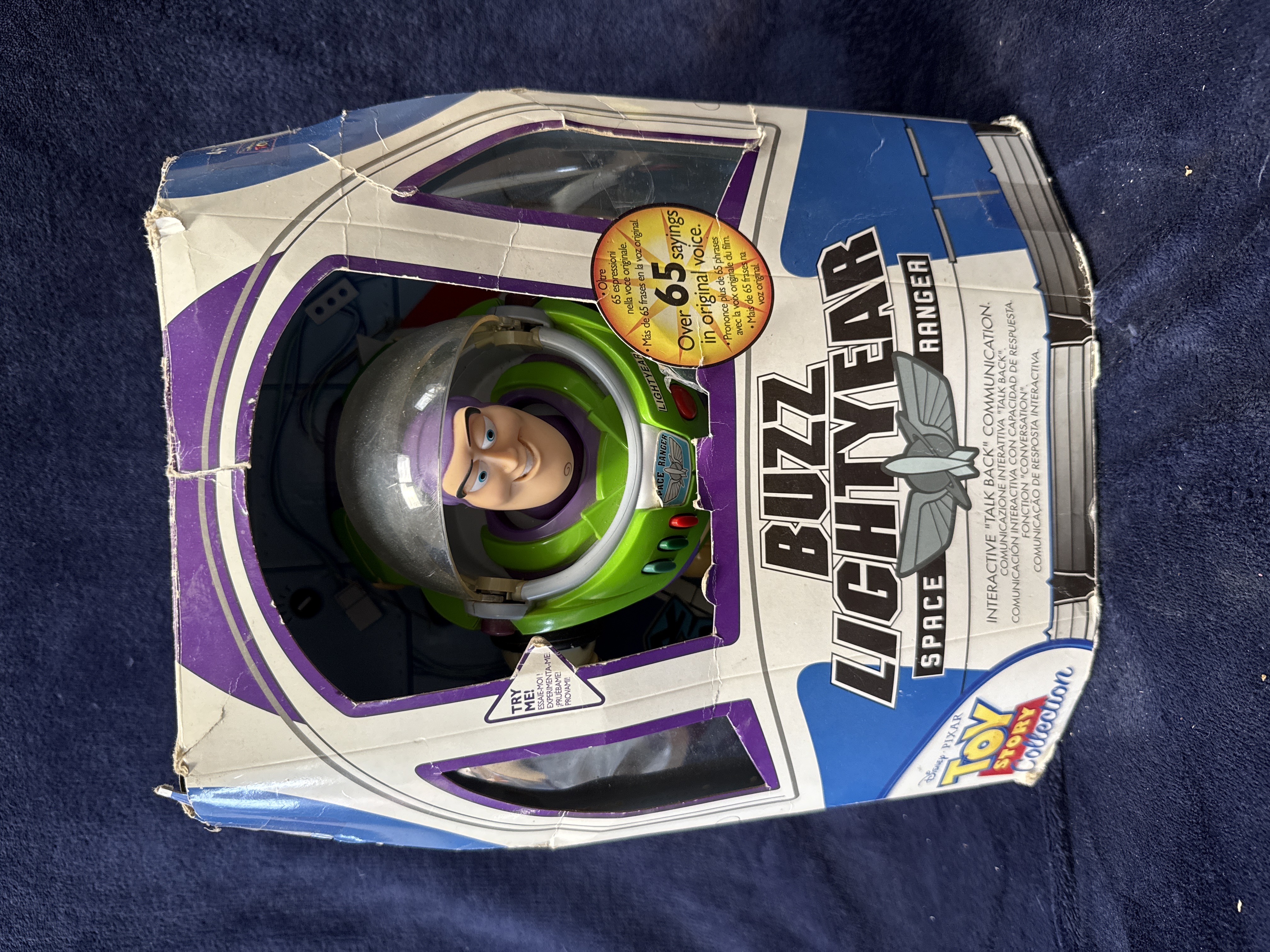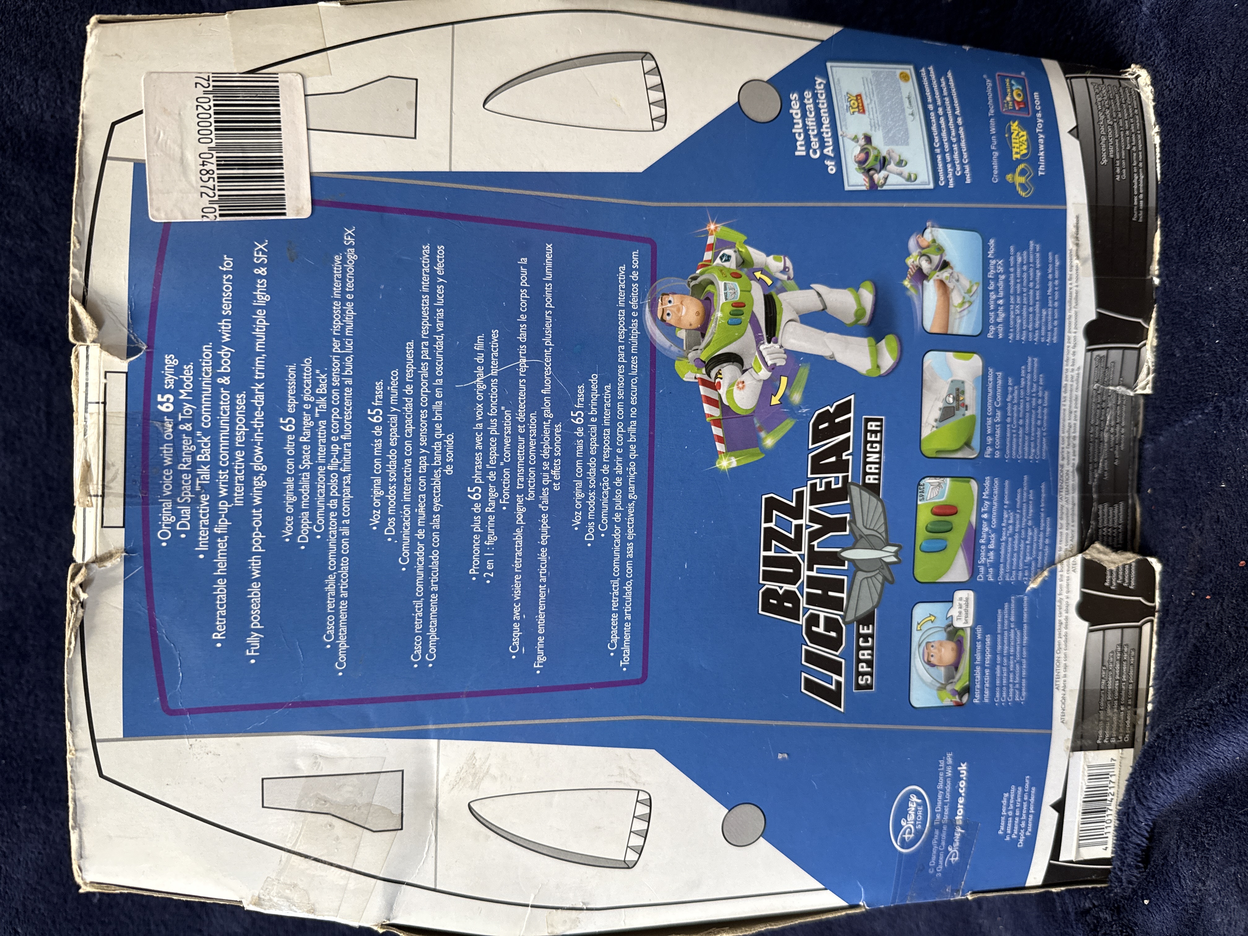 A large-scale interactive Buzz Lightyear action figure from the Disney Pixar Toy Story Collection, manufactured by Thinkway Toys for The Disney Store. The figure is constructed from plastic with integrated electronic components for light and sound effects. It is programmed with over 65 phrases in the original character voice and features interactive Talk Back communication with sensors for response. Mechanical features include a retractable clear helmet, a flip-up wrist communicator, and pop-out wings with light and sound effects. The figure is designed with glow-in-the-dark trim on the space suit. The item is presented in its original spaceship-style cardboard window box featuring multi-language text in English, Italian, Spanish, French, and Portuguese. The reverse of the packaging bears the manufacturer marks for Thinkway Toys and The Disney Store, including a London address for the European market. The packaging indicates that a Certificate of Authenticity is included within the box.