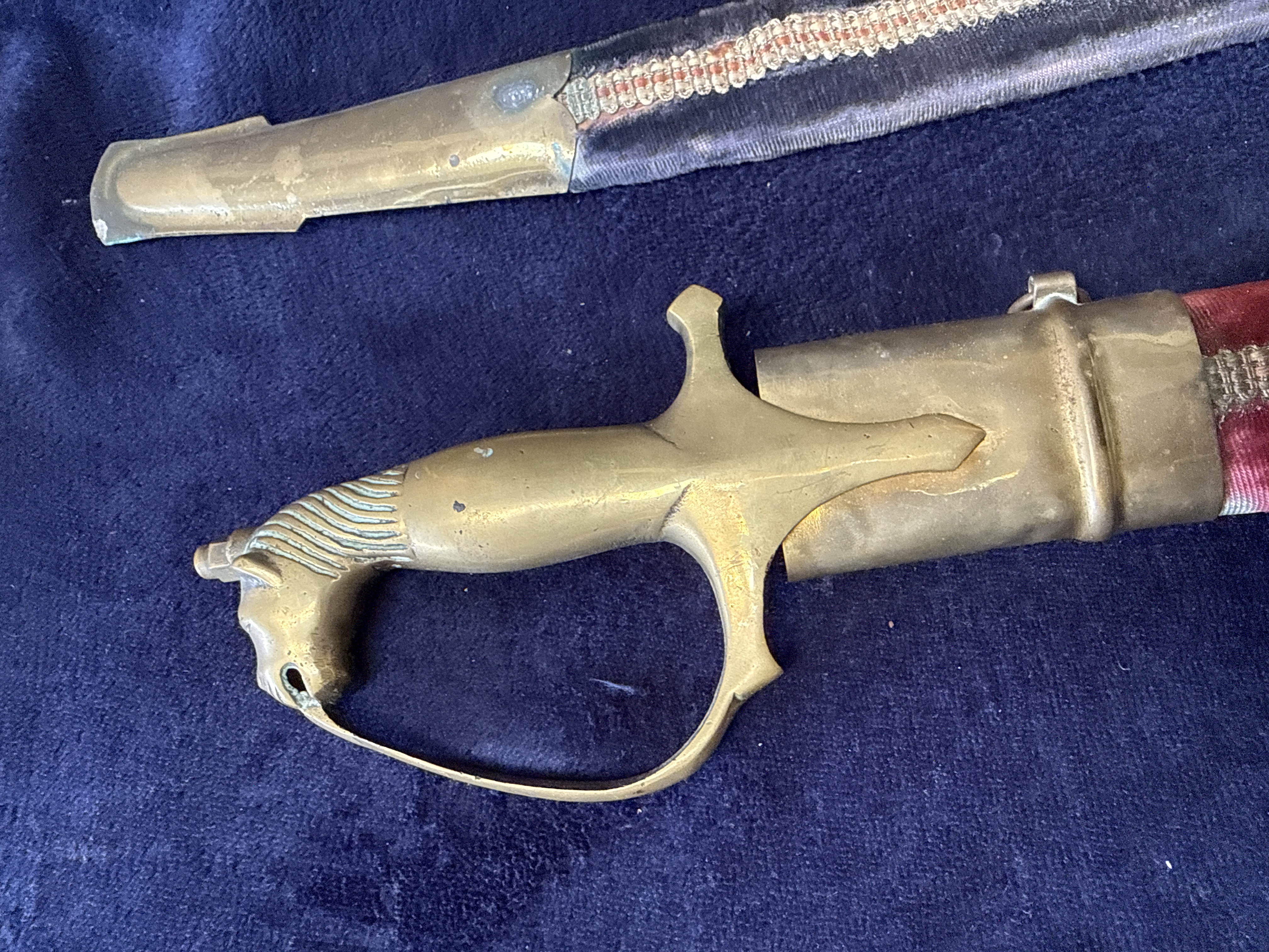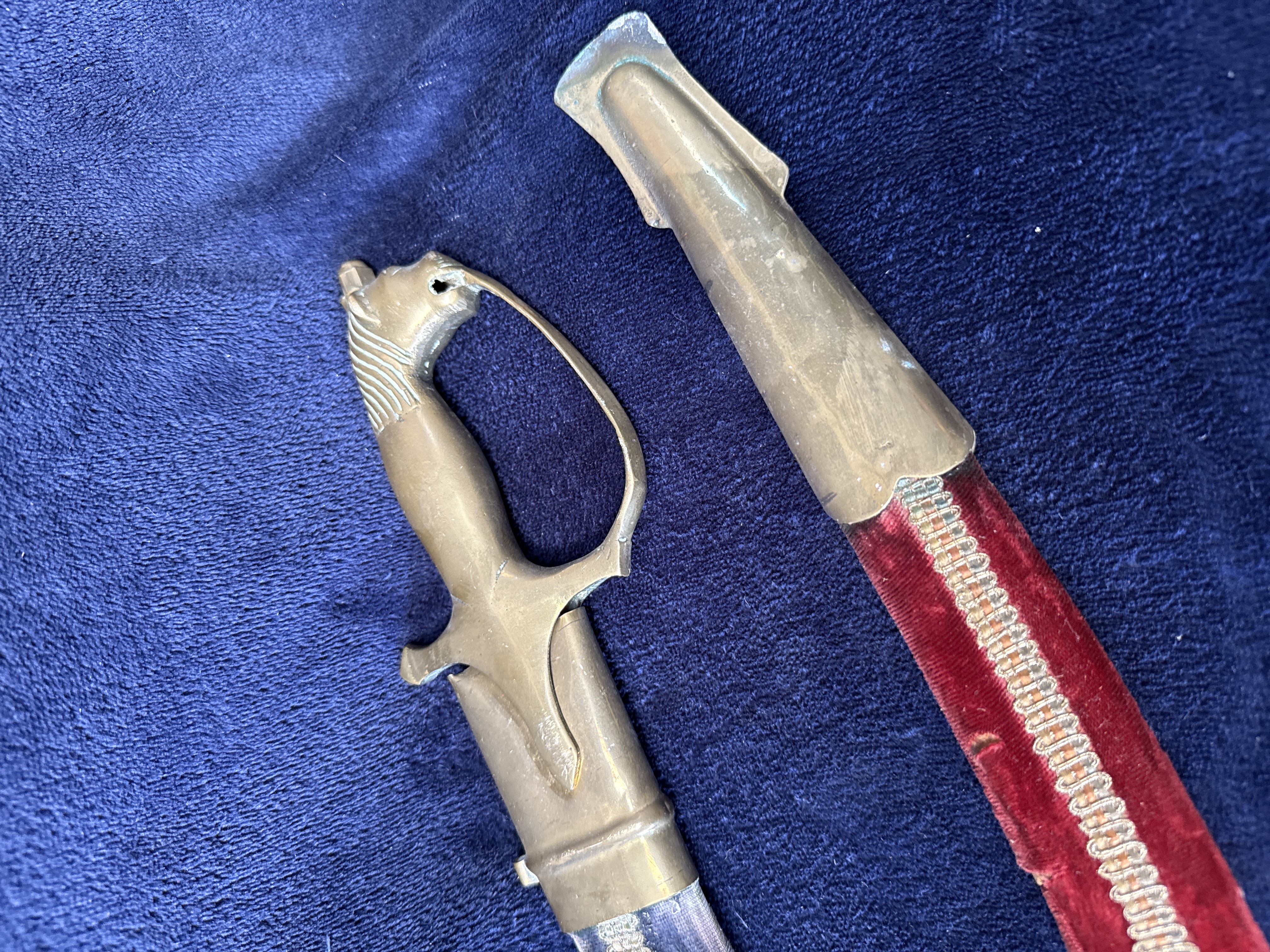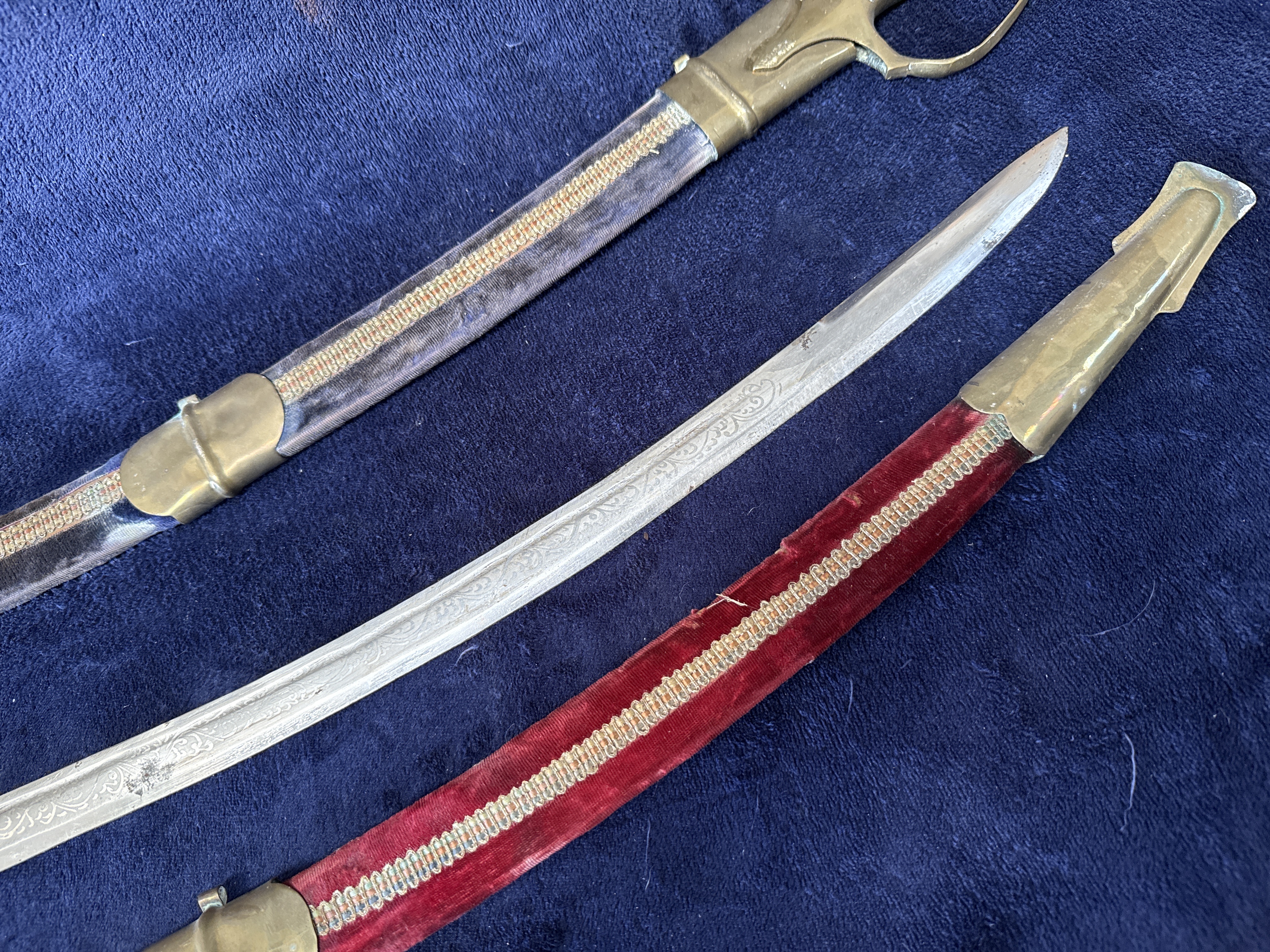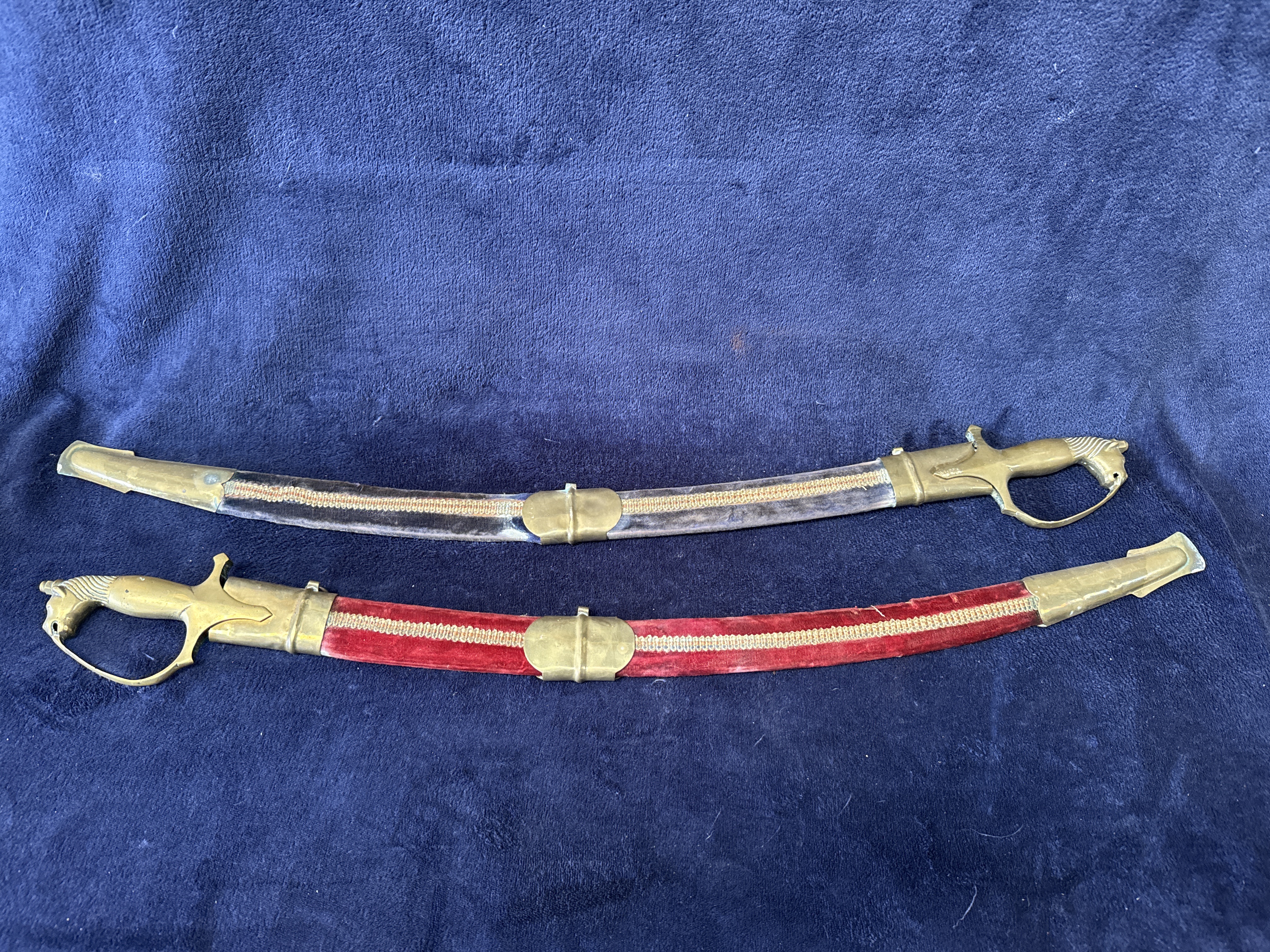 A pair of 20th-century decorative curved sabres or talwars in the Indian style, often associated with Rajput ceremonial or wedding use. Each sword features a curved, single-edged steel blade with etched foliate and scrollwork decoration extending across approximately two-thirds of the length. The hilts are constructed from cast brass, featuring pommels modelled as horse heads with detailed manes. The hilts include integrated knuckle guards and pointed langets. Each sword is housed in a wooden-core scabbard; one is covered in red velvet and the other in dark blue velvet. Both scabbards are embellished with a central strip of metallic gold-tone braid and fitted with brass mounts, including a locket, a mid-band with a suspension loop, and a long chape. No maker’s marks or inscriptions are present on the blades or hilts.