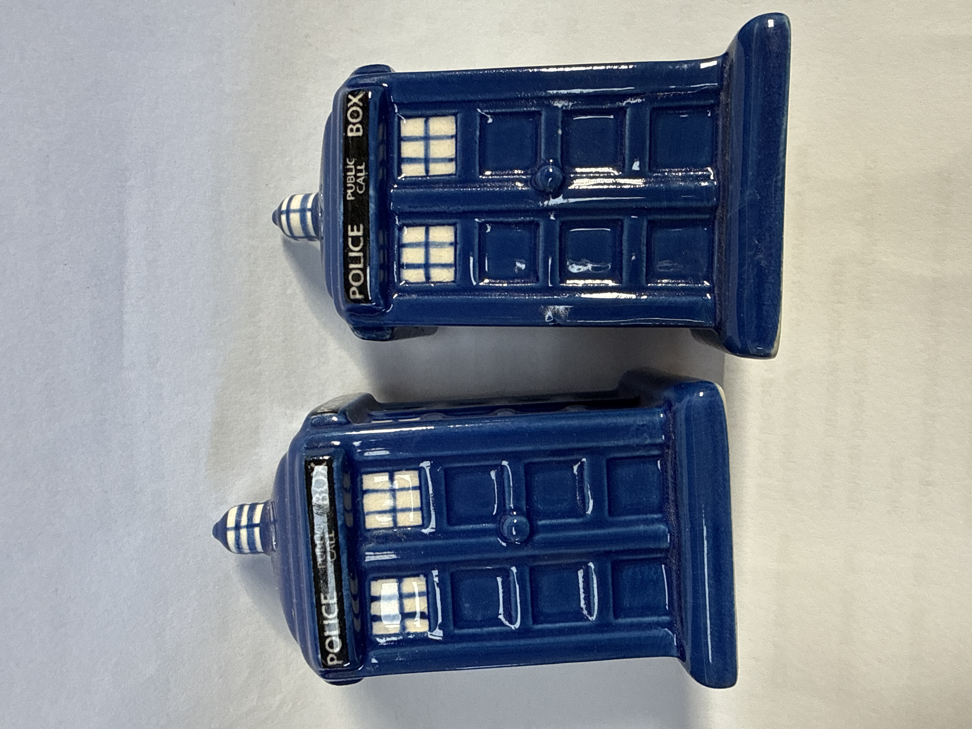 A pair of glazed earthenware salt and pepper shakers modeled in the form of traditional British police public call boxes, a design synonymous with the TARDIS from the television series Doctor Who. Attributed to Puckator, each shaker is constructed with a rectangular pedestal base, molded paneling, and a lantern-style cap. The items are finished in a deep cobalt blue glaze. Decorative elements include black horizontal bands at the top of each side with white printed text reading POLICE PUBLIC CALL BOX, and white window panes. One shaker is designed with three dispensing holes at the top, while the other features a single hole.