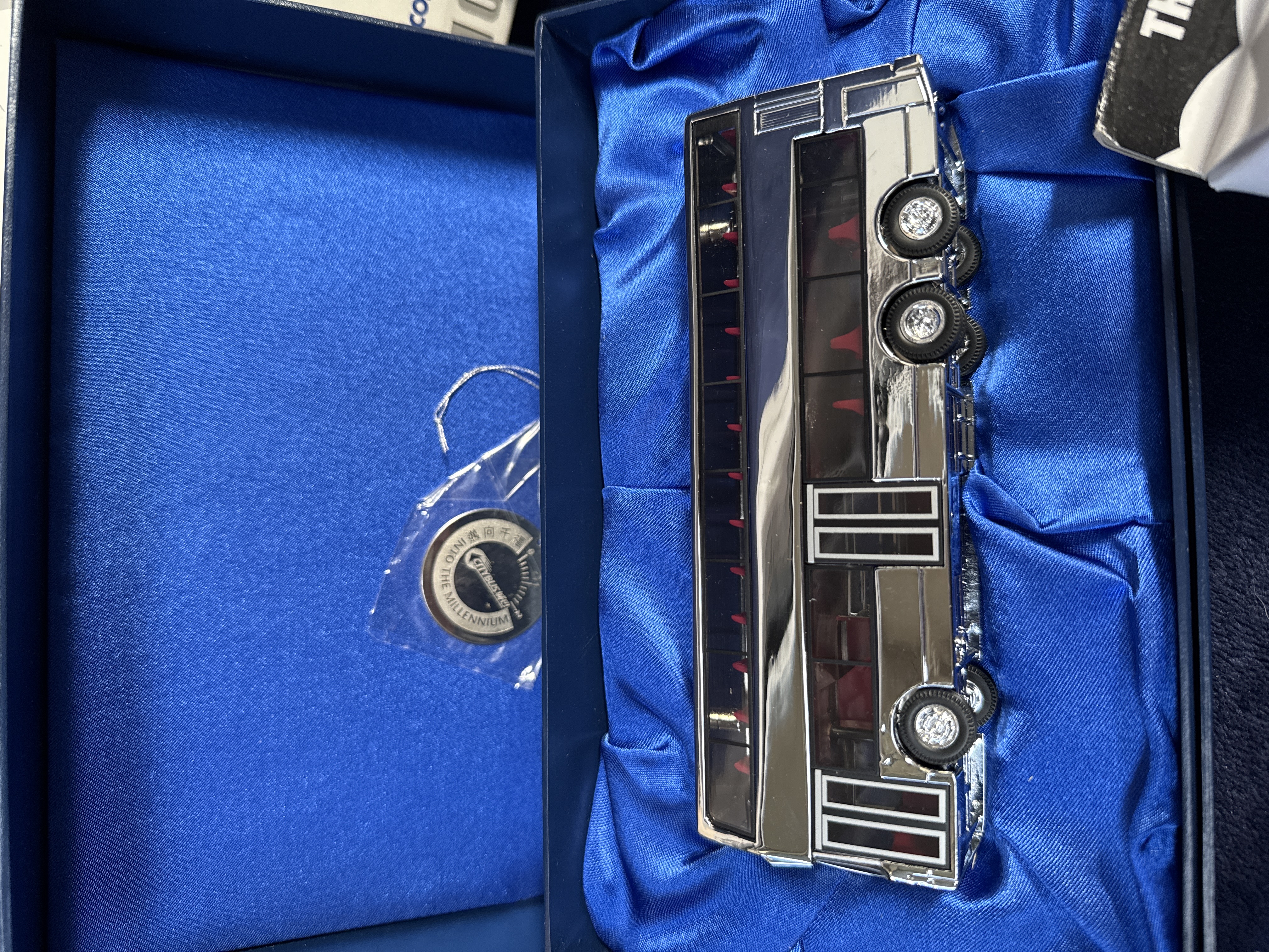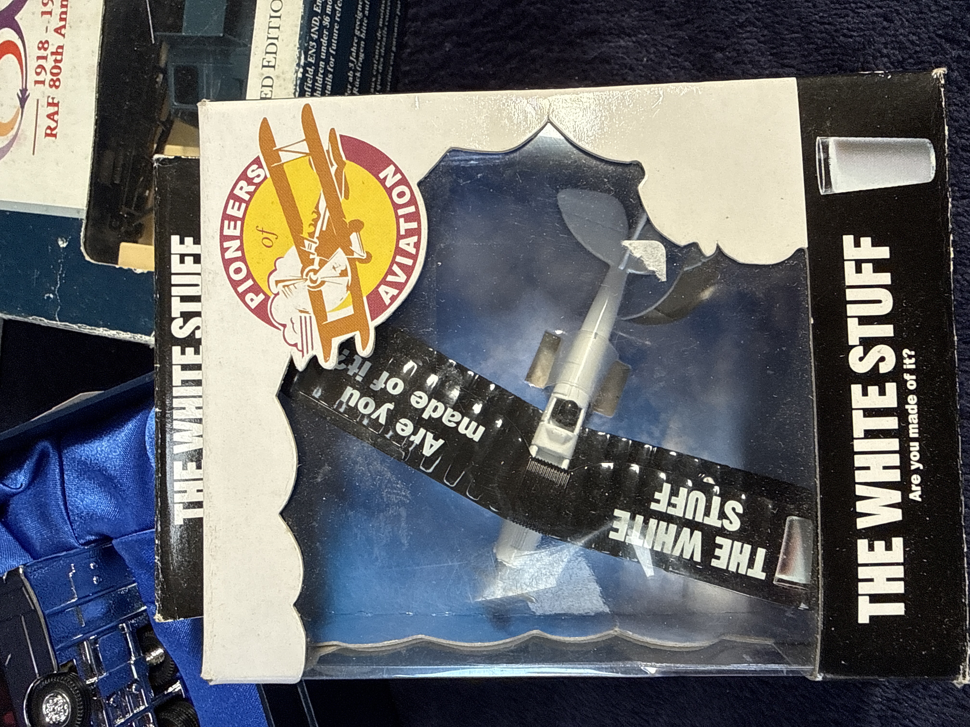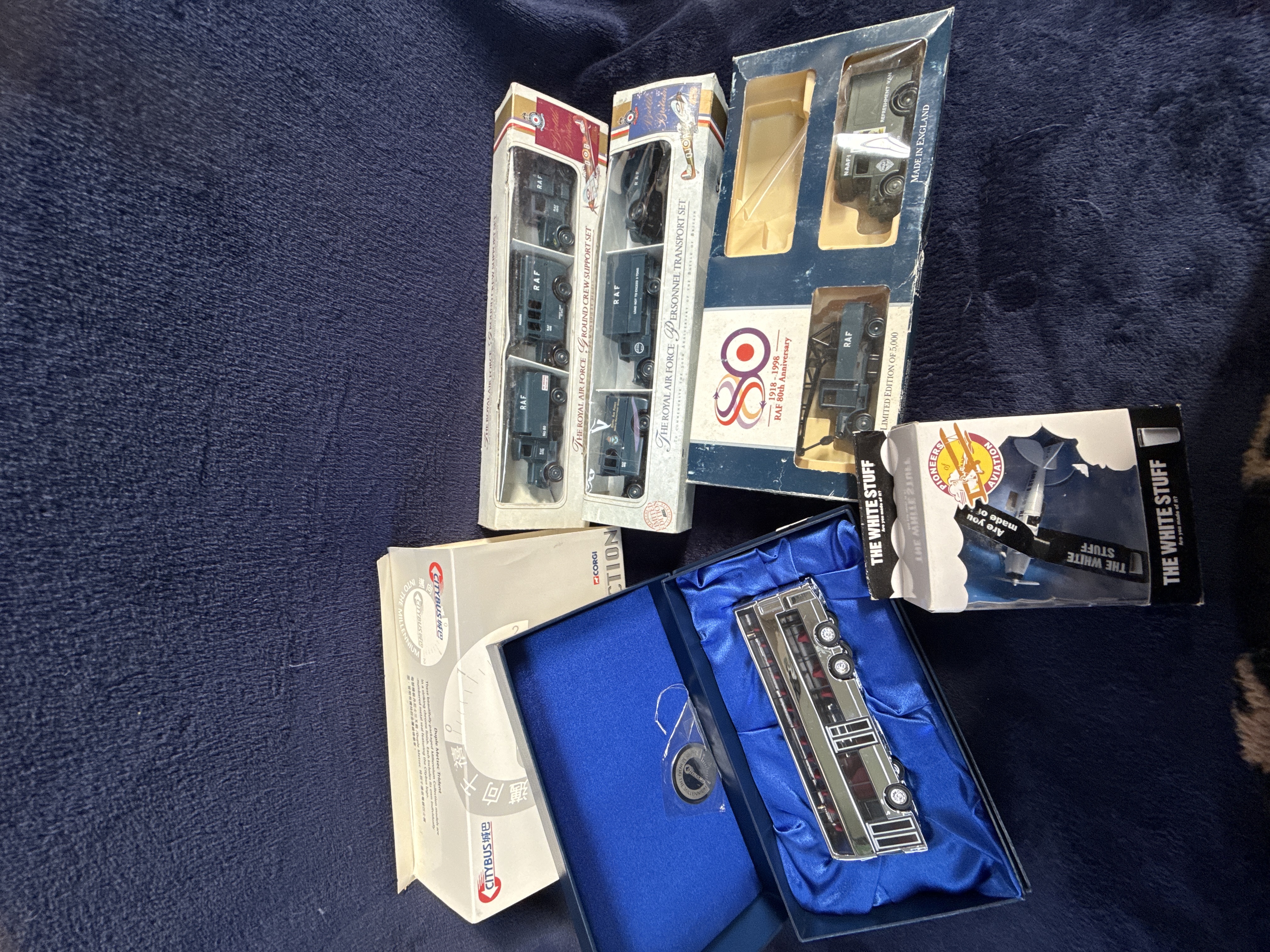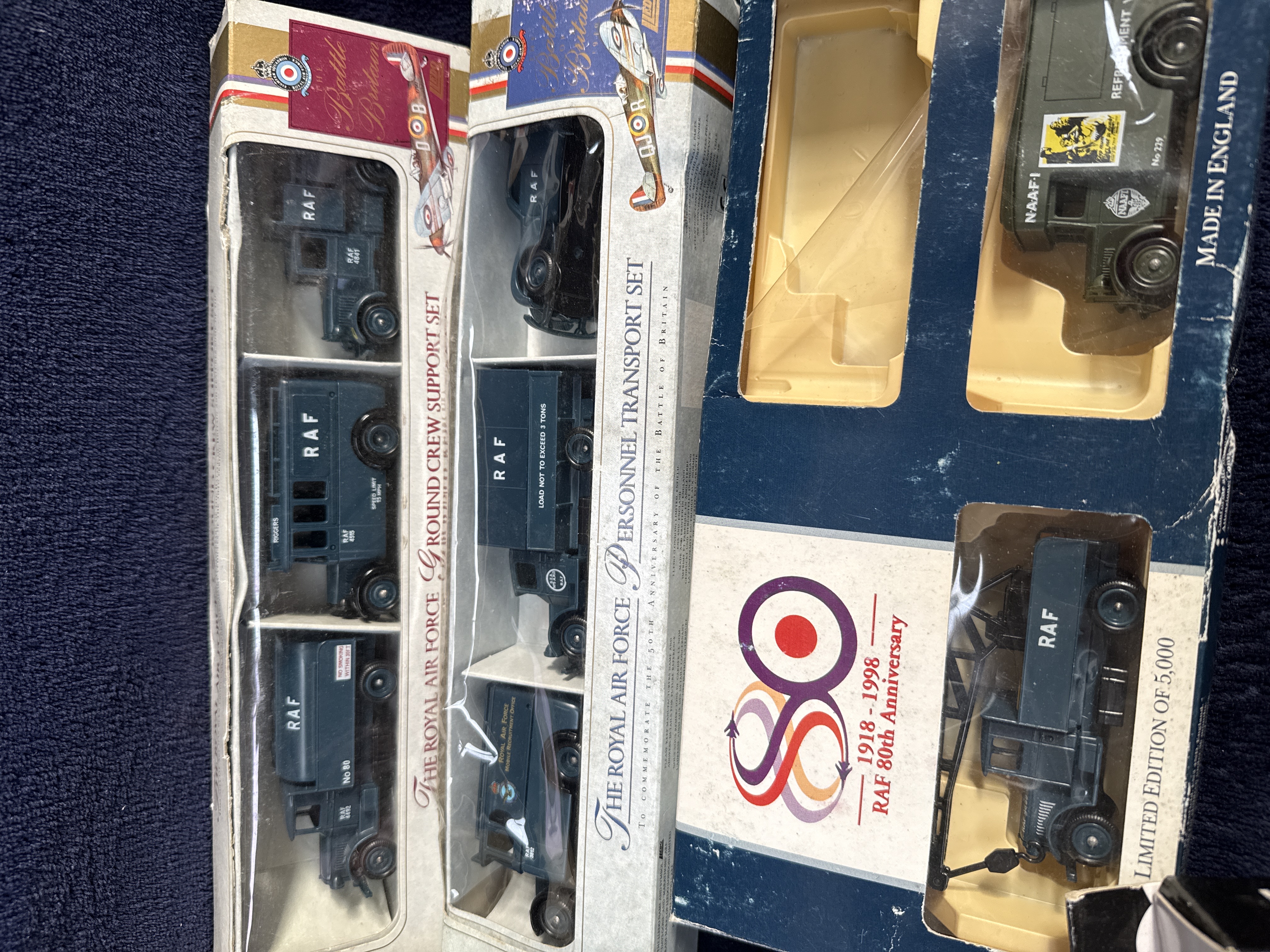 This collection of die-cast metal and plastic models features several commemorative and historical sets. The group includes a Corgi Citybus Into the Millennium limited edition set, featuring a chrome-effect finish double-decker bus, identified as a Duple Metsec Trident. This model is accompanied by a commemorative medallion featuring Citybus branding and is housed in a blue satin-lined presentation case with a white branded outer sleeve. Also included are three Lledo Royal Air Force commemorative sets. These consist of a Ground Crew Support Set and a Personnel Transport Set, both featuring three vehicles in dark blue RAF livery, and a larger RAF 80th Anniversary Set (1918-1998). The anniversary set is marked as a limited edition of 5,000 and is labelled as Made in England. Completing the collection is a Pioneers of Aviation single-engine monoplane aircraft model, presented in a window box branded for The White Stuff.