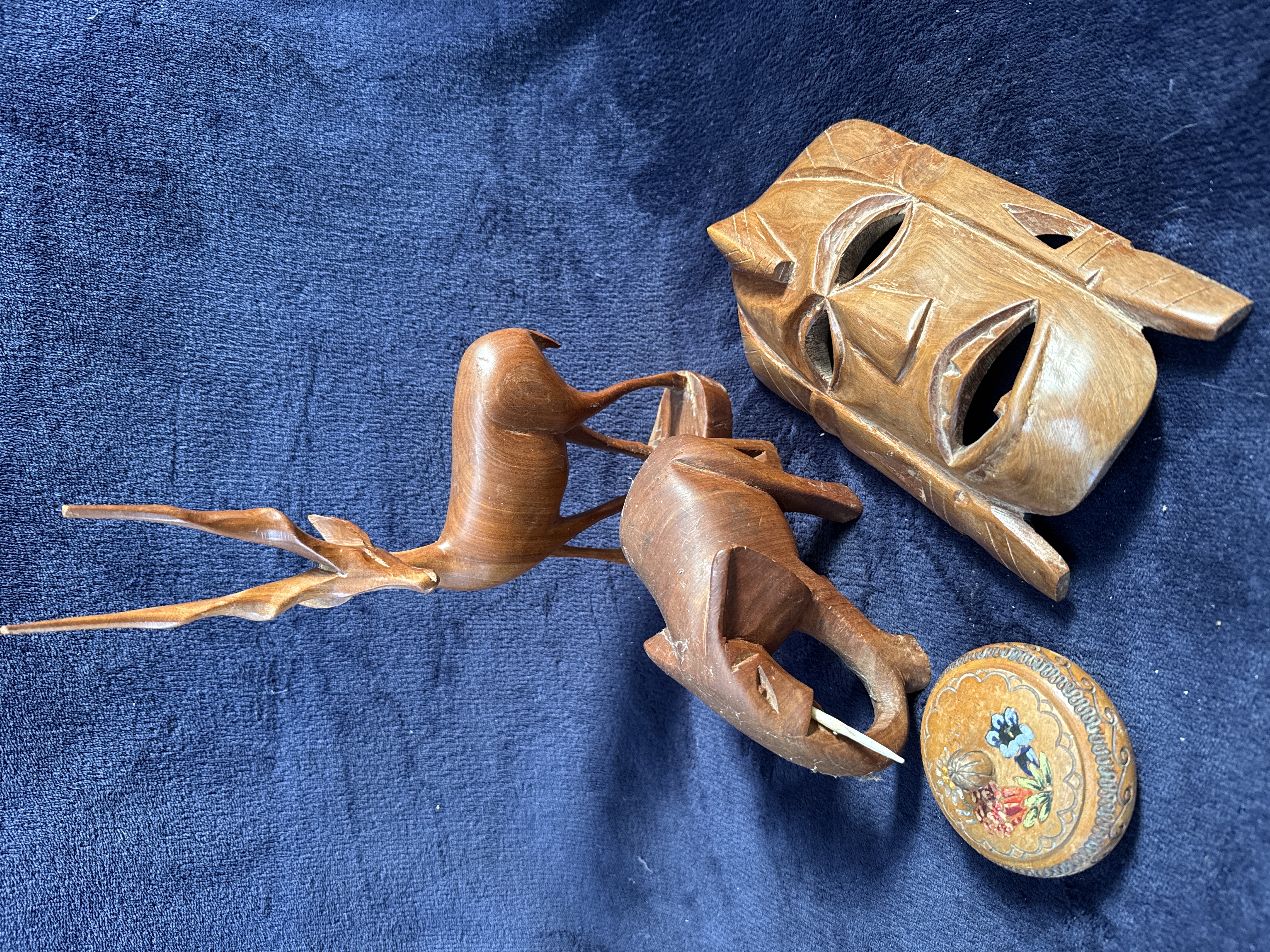 Four mid-20th-century carved wooden decorative items. The collection includes a stylised mask hand-carved from a single block of medium-toned wood, featuring angular recesses and incised geometric lines, resembling the style of Kenyan export wares such as those by Besmo. Also present are animal figurines, including a gazelle carved from dense, reddish-brown hardwood with an elongated form and a polished finish, and an elephant carved from dark hardwood. The collection is completed by a circular turned wooden lid with a hand-painted floral spray and a pyrographed geometric border, characteristic of European folk art. The surface wear across the items is consistent with mid-20th-century decorative use and indicates authenticity for the period.