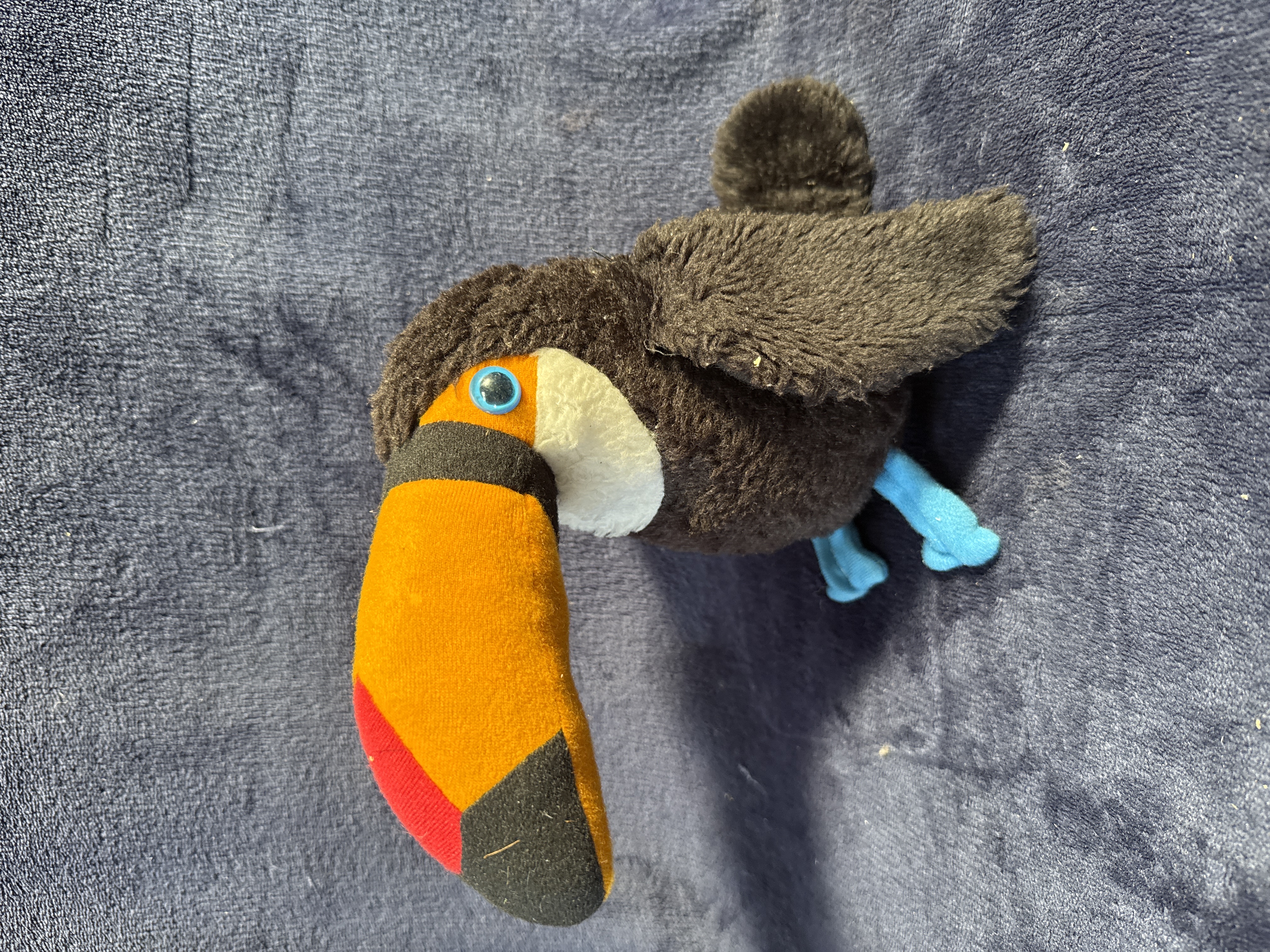 A promotional plush soft toy representing the Guinness advertising mascot, Little Arthur the Toucan. The item is manufactured by James Blackmore Ltd and features a black synthetic plush body with wings. The large, multi-coloured beak is constructed from felt-like fabric in orange, red, and black. It includes light blue fabric feet and translucent blue plastic eyes. A woven fabric label is attached, featuring the text THE ORIGINAL GUINNESS TOUCAN EXCLUSIVELY FROM JAMES BLACKMORE LTD and LITTLE ARTHUR in red.