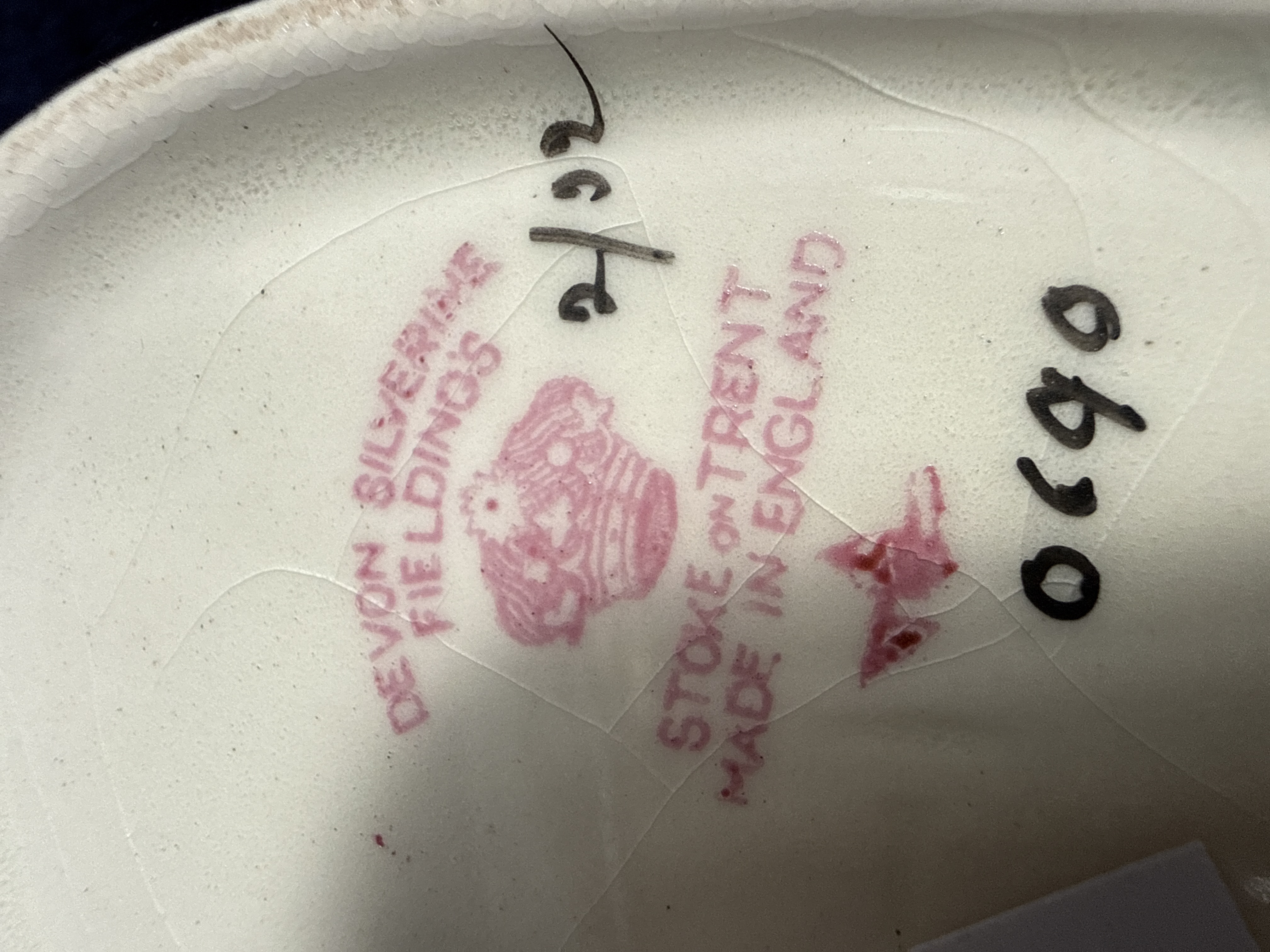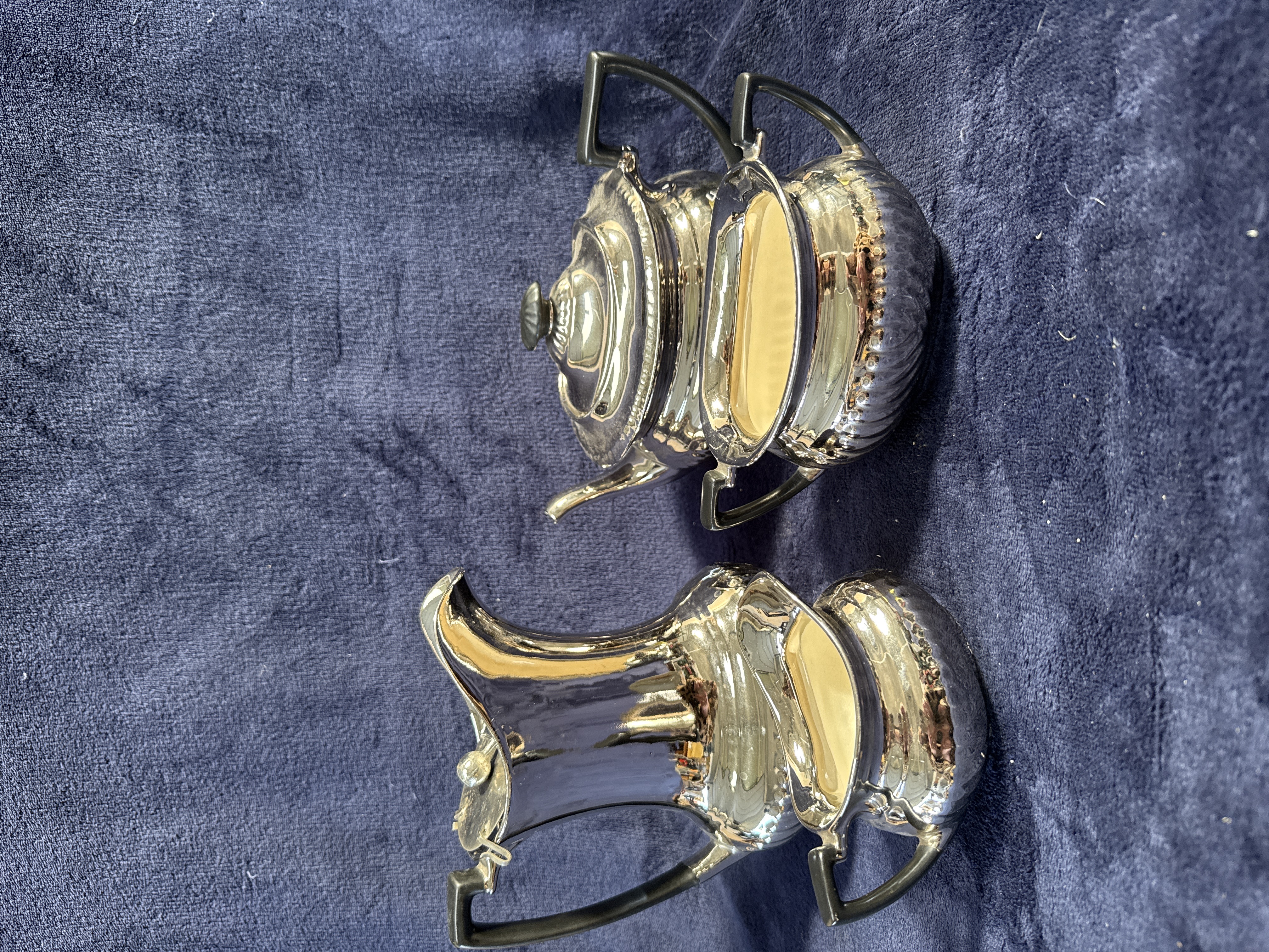 A two-piece set comprising a teapot and a tall coffee or hot water pot manufactured by S. Fielding and Co. Ltd of Stoke-on-Trent. The items are constructed from ceramic with a thick electro-deposited silver coating known as Silverine. Designed in the Art Deco style, each piece features a flared rim, gadrooned decoration to the lower body, and angular black composite handles and finials. The base of the pieces bears a pink printed backstamp including a crown and butterfly motif, with the text DEVON SILVERINE, FIELDING’S, STOKE ON TRENT, and MADE IN ENGLAND. Hand-painted black characters 2/92 and 0690 are also present.