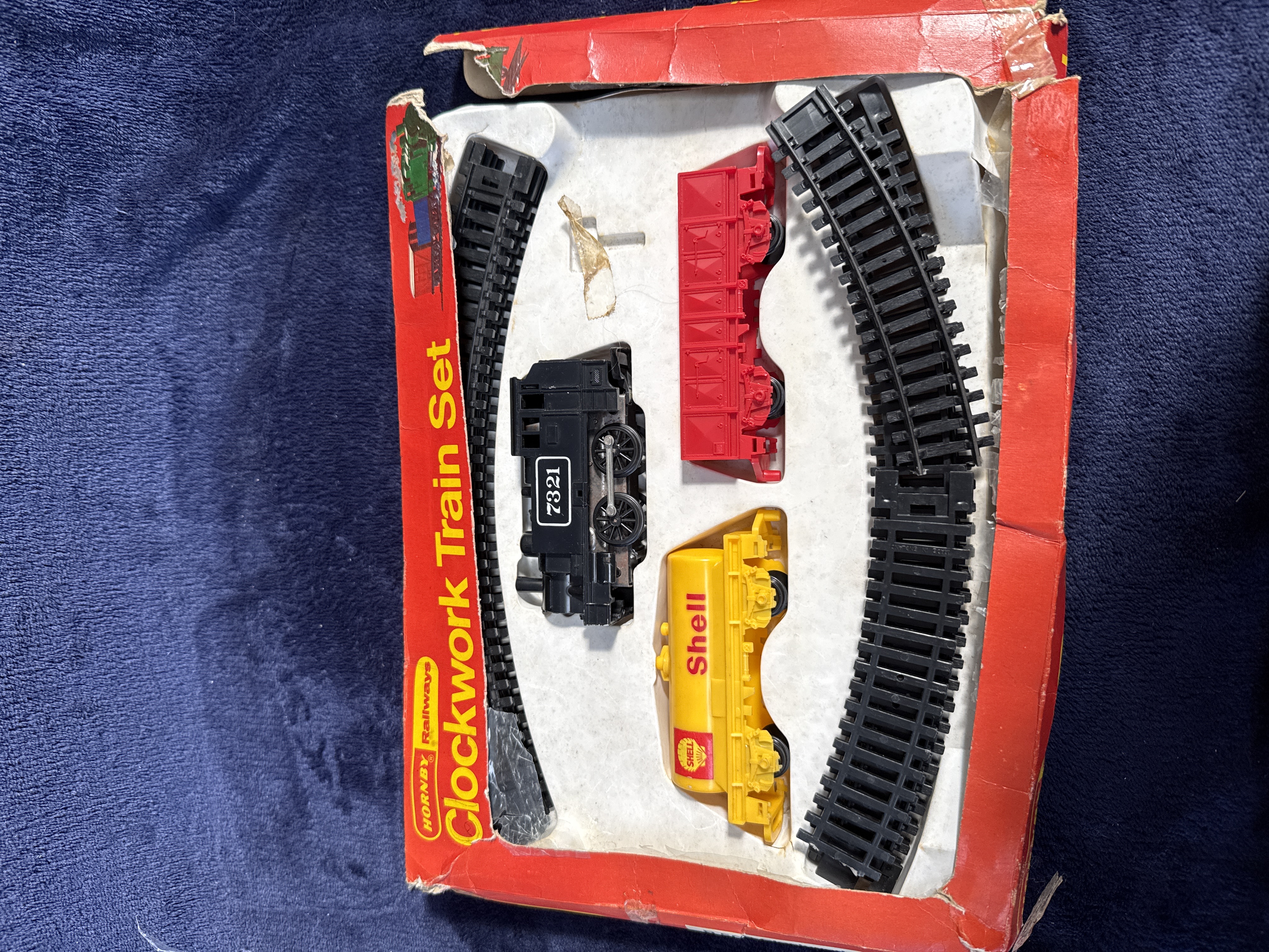 A Hornby Railways R500 Clockwork Goods Train Set presented in its original packaging. The set features a black 0-4-0 steam locomotive bearing the running number 7321 on the cab side. The rolling stock comprises a red open freight wagon and a yellow petroleum tank wagon featuring Shell branding and the associated shell logo. The set includes several sections of black plastic curved track. Construction is primarily plastic with metal axles and an internal clockwork motor. The components are housed in a white plastic inner display tray within a red cardboard window box.