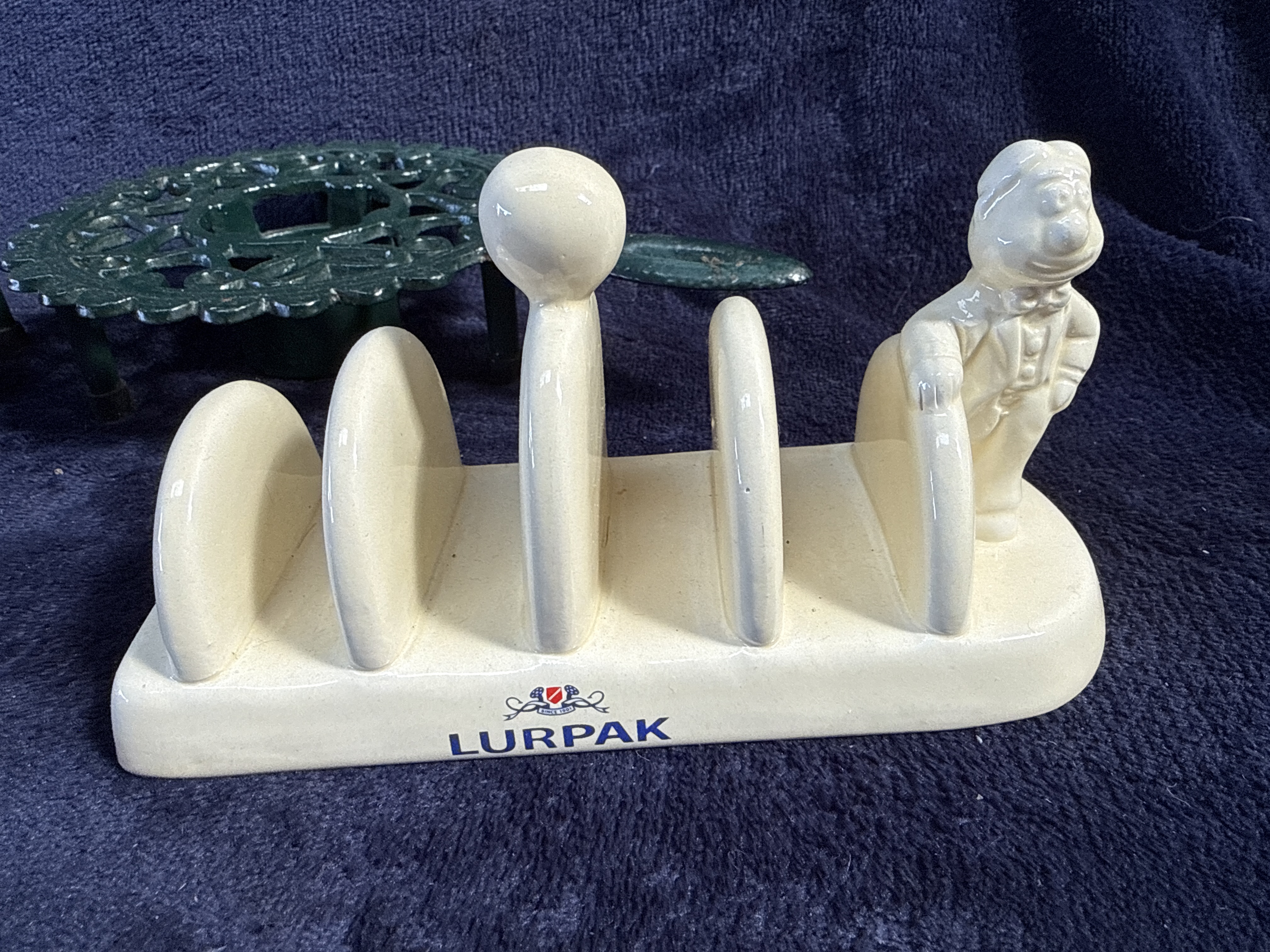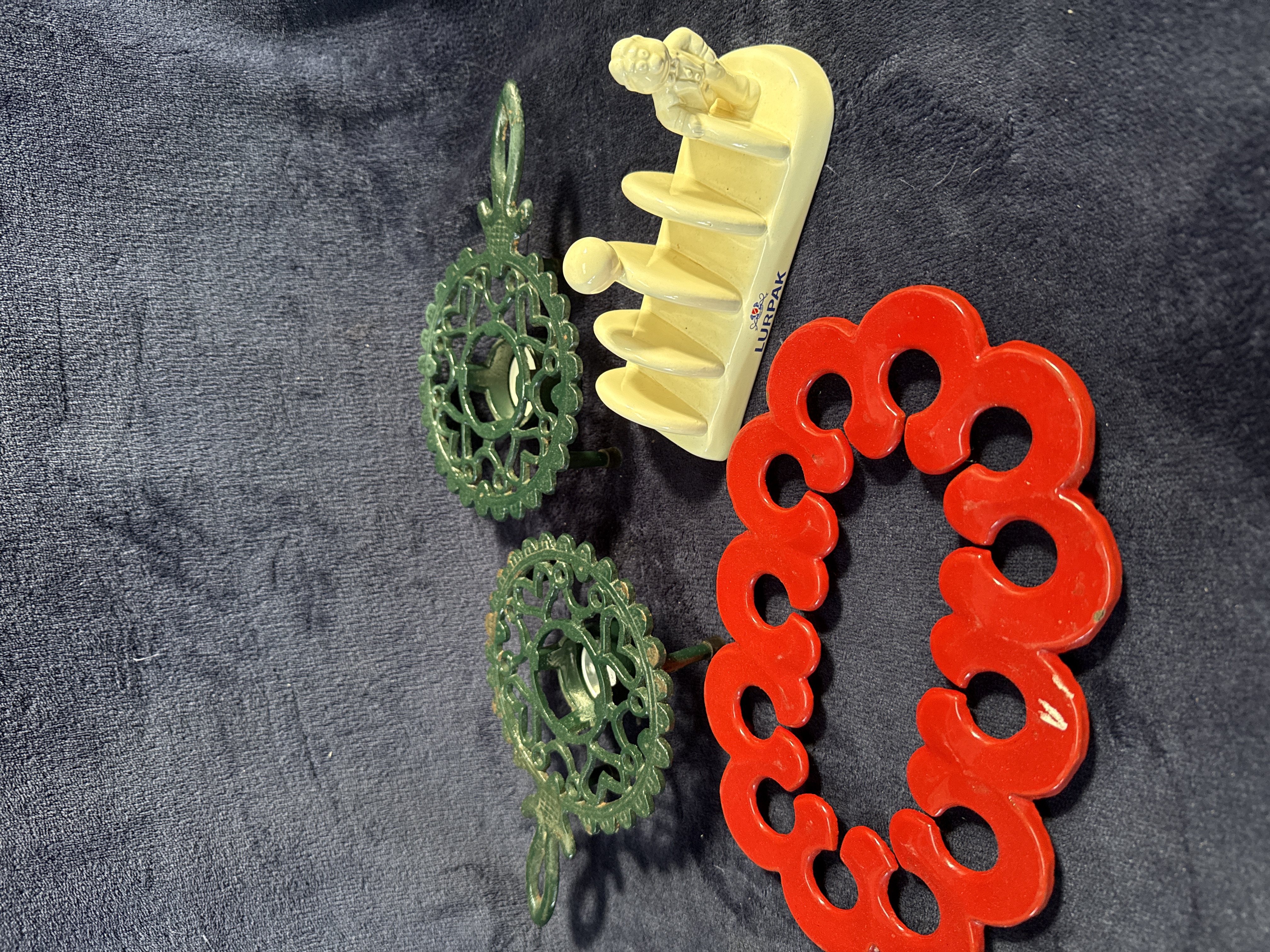 A collection of kitchenalia comprising a promotional ceramic toast rack and cast iron trivets. The five-slot toast rack is constructed from cream-coloured glazed ceramic and features a figural representation of the Douglas butter man character at one terminal, with a spherical finial on the central divider. The piece is marked with a transfer-printed Lurpak logo in blue and red. The metalware includes a large circular trivet of cast iron construction with a red enamelled finish, decorated with a repeating scalloped openwork pattern. Also included is a matched pair of small circular cast iron trivets with a green painted finish. These smaller items feature a lace-like pierced design, integrated handles, and three supporting feet.