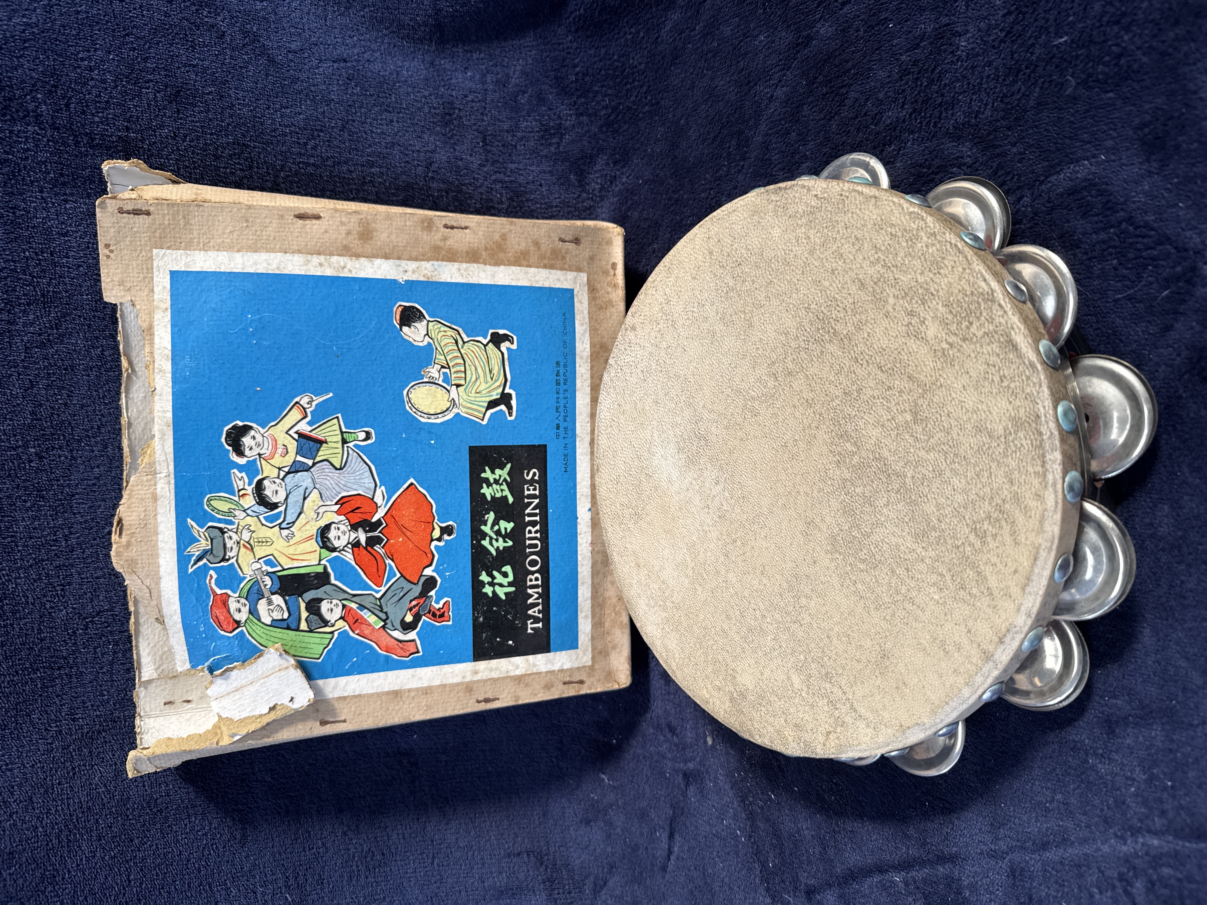 A mid-20th-century 10-inch tambourine of Chinese origin, accompanied by its original illustrated cardboard box. The instrument is constructed with a circular wooden frame and a natural skin head, which is secured to the rim by a series of blue-painted metal tacks. The frame is fitted with five pairs of metal jingles, or zils, held in place by metal pins. The box lid features a printed blue label with an illustration of figures in traditional attire playing various musical instruments. The label includes the vertical text TAMBOURINES and the Chinese characters 花 铃 鼓. It is further marked in English MADE IN THE PEOPLE’S REPUBLIC OF CHINA and in Chinese characters 中华人民共和国制造.