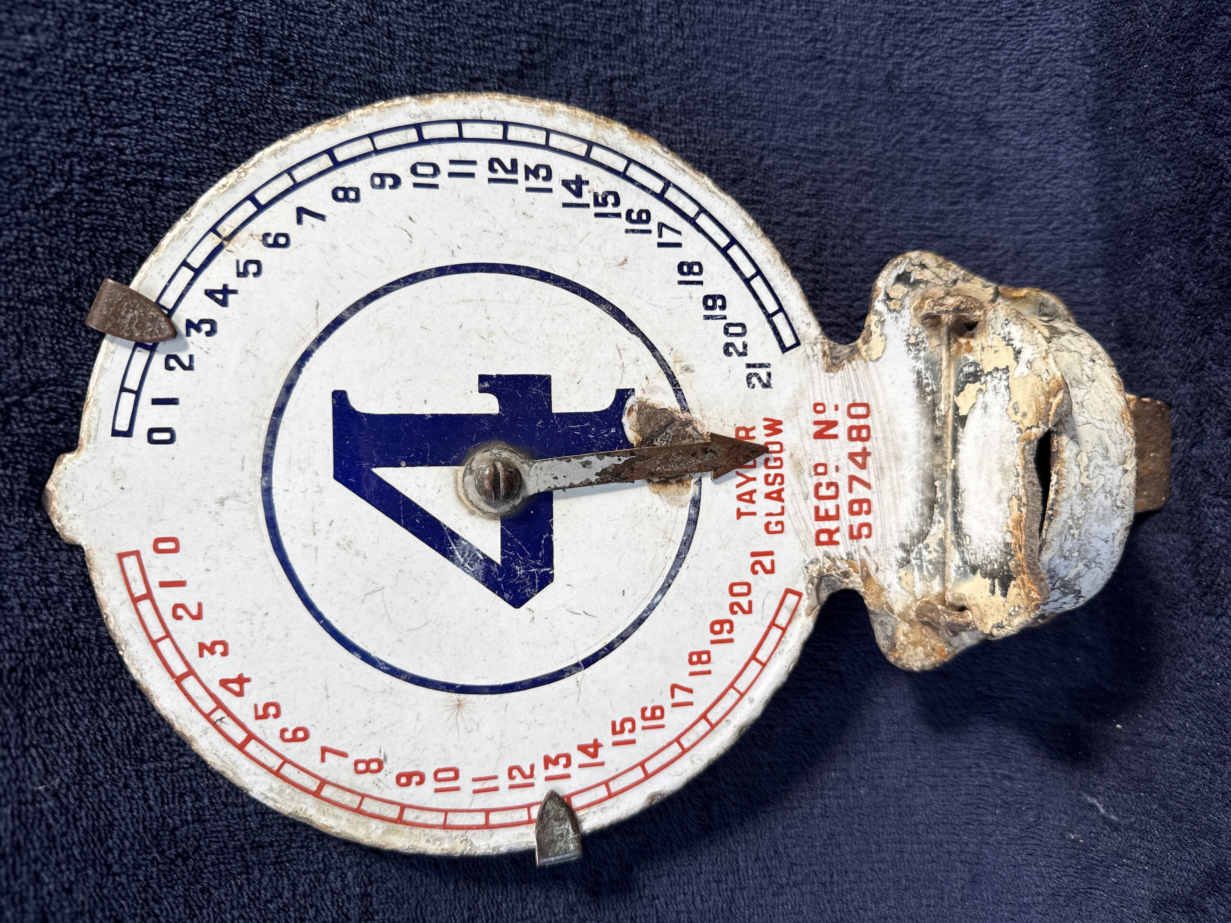 An industrial dial gauge manufactured by Taylor of Glasgow. The instrument features a circular metal dial face with a white enamelled or painted finish, mounted to a heavy cast-metal bracket. The face is marked with a large blue numeral 4 at the centre. It includes two semi-circular scales graduated from 0 to 21, one printed in blue and the other in red. The dial is inscribed with the text TAYLOR GLASGOW and REGD NO 597480. A central metal pointer is secured by a screw, and two adjustable metal markers are positioned on the outer rim. The construction and markings suggest use in maritime or steam engine applications.