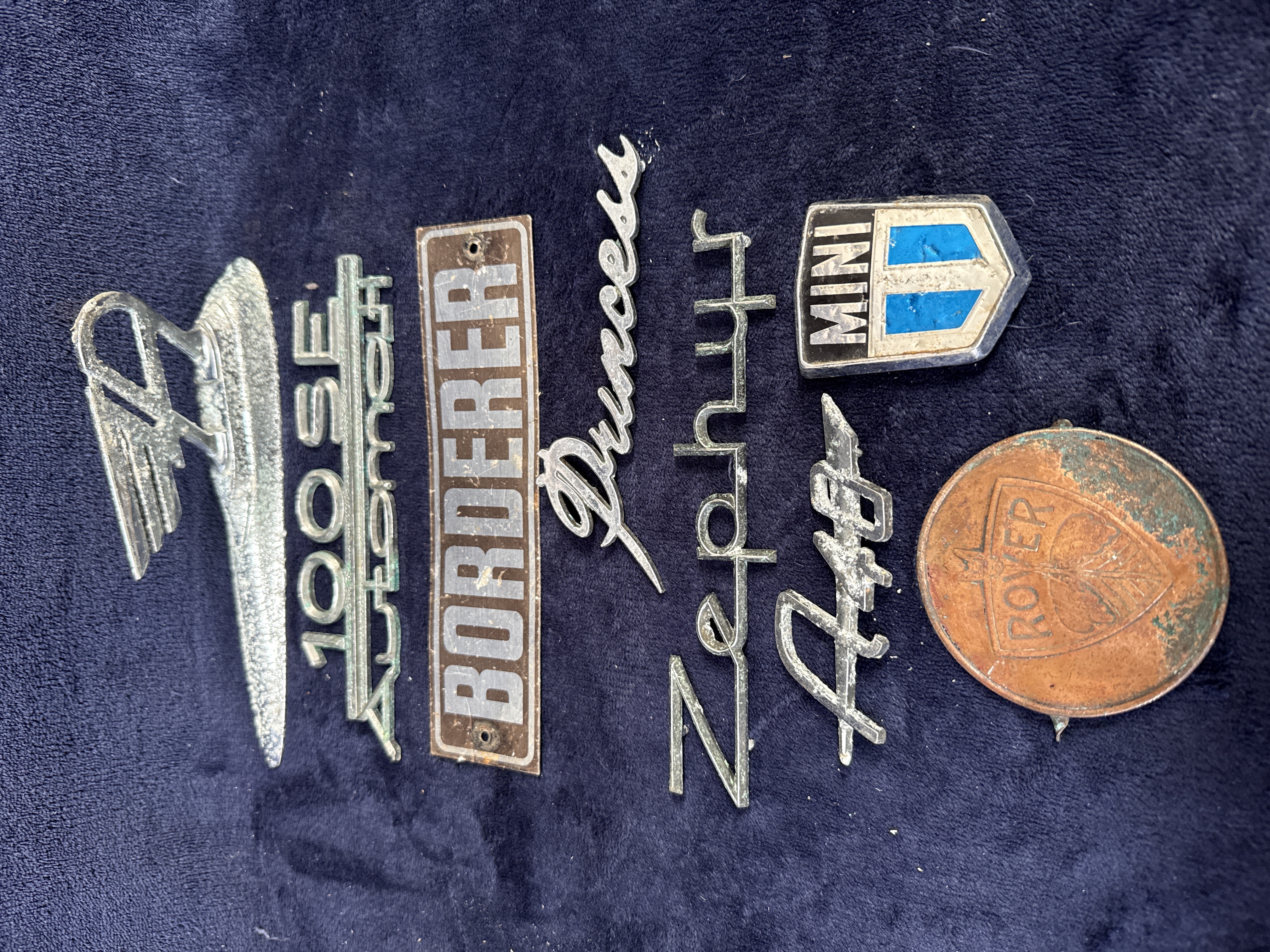 This lot consists of eight vintage automotive badges, emblems, and a mascot, primarily representing British manufacturers. The collection includes a cast metal hood ornament featuring a stylized winged figure, likely chrome-plated pot metal. Also included is a cast metal script badge for a 100SE automatic and a rectangular aluminium nameplate embossed with the text BORDERER, a mark associated with Guy Motors commercial vehicles. The lot further contains three cast metal script emblems for the Princess, Ford Zephyr, and Austin A40 models. Completing the collection is a shield-shaped MINI badge featuring a blue and white geometric design and a large circular copper-toned metal badge for Rover, which displays the embossed Viking ship logo within a central shield. The items are constructed from various base metals with plated or painted finishes.