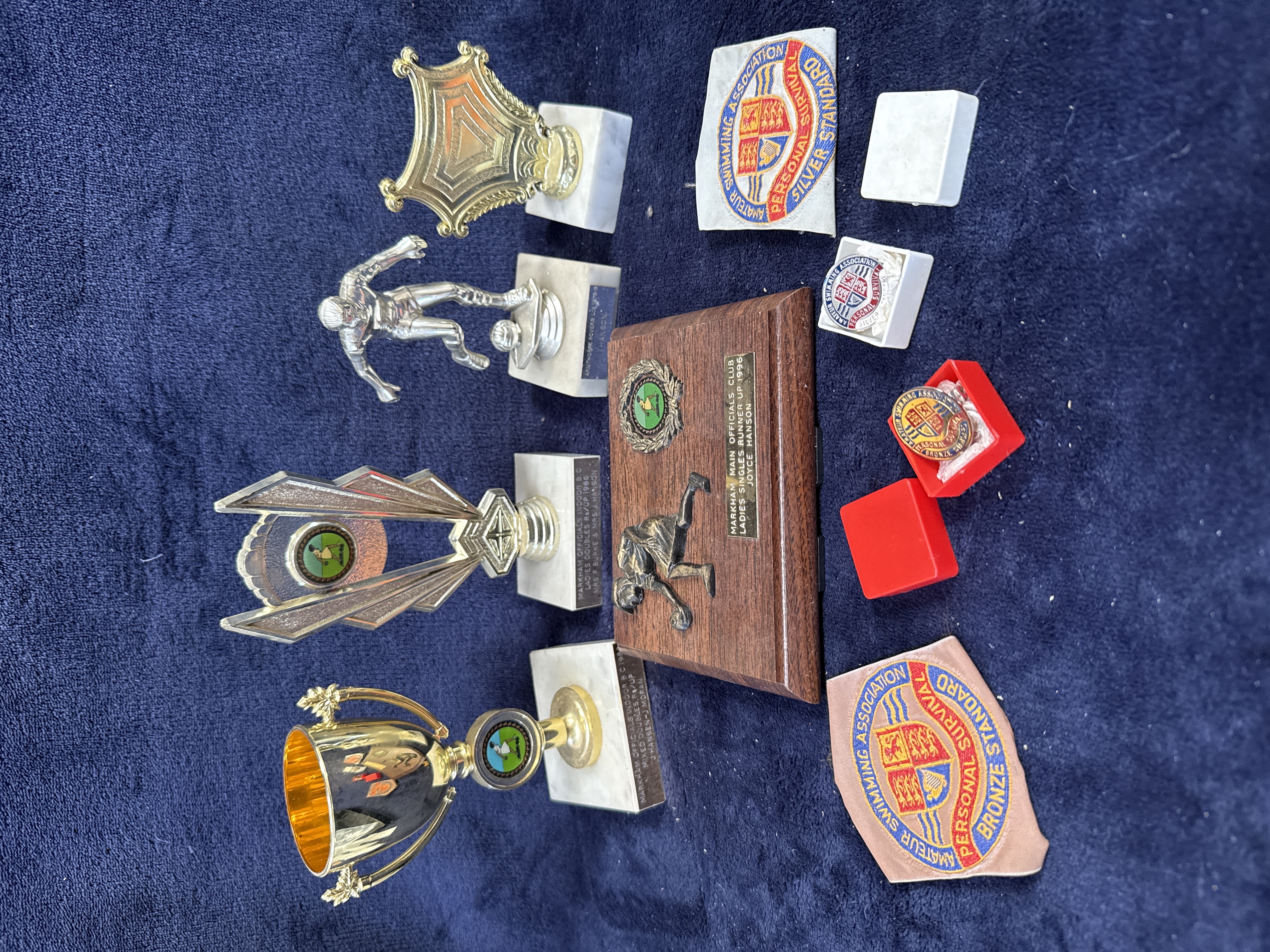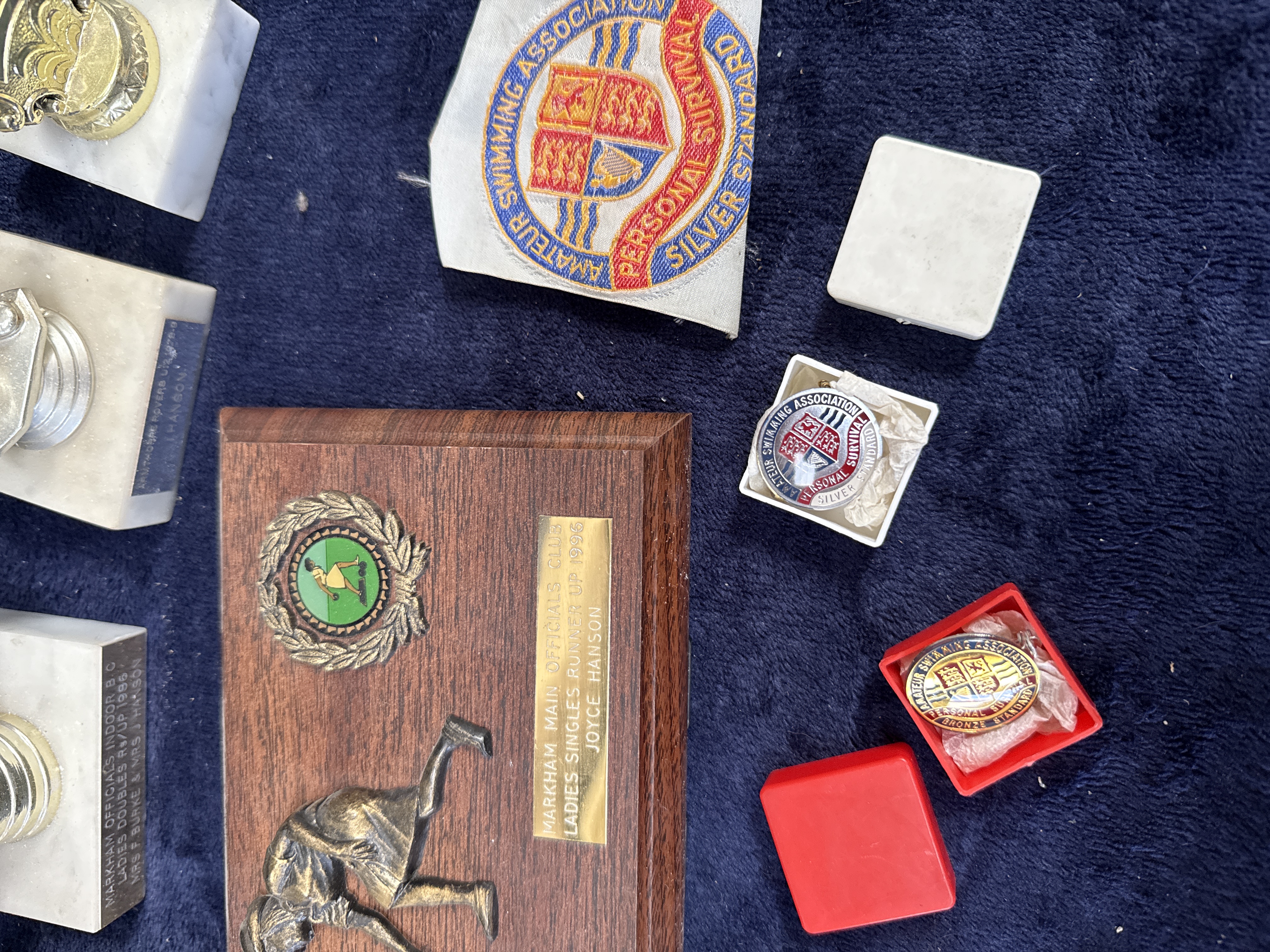 A group of vintage sports awards and memorabilia, primarily focused on lawn bowls, football, and swimming. The collection includes several lawn bowls awards from the Markham Main Officials Club and Markham Officials Indoor B.C. Notable pieces include a wooden-effect plaque inscribed MARKHAM MAIN OFFICIALS CLUB LADIES SINGLES RUNNER UP 1996 JOYCE HANSON and a trophy for MARKHAM OFFICIALS INDOOR B.C MIXED DOUBLES RUNNER UP 1996 J HANSON – J MORAN. The collection also features a silver-toned football trophy depicting a player, with a plate inscribed ARMTHORPE ROVERS U-13 1978-9 J. HANSON. Swimming memorabilia consists of two Amateur Swimming Association Personal Survival cloth patches for Silver and Bronze standards, alongside two corresponding enamel pin badges in their original presentation boxes. The trophies are constructed from gold and silver-toned metal components mounted on marble-effect bases. The plaques feature three-dimensional medallions and figures in the style of commercial awards by makers such as Monarch Trophy Studio and Edco Awards.