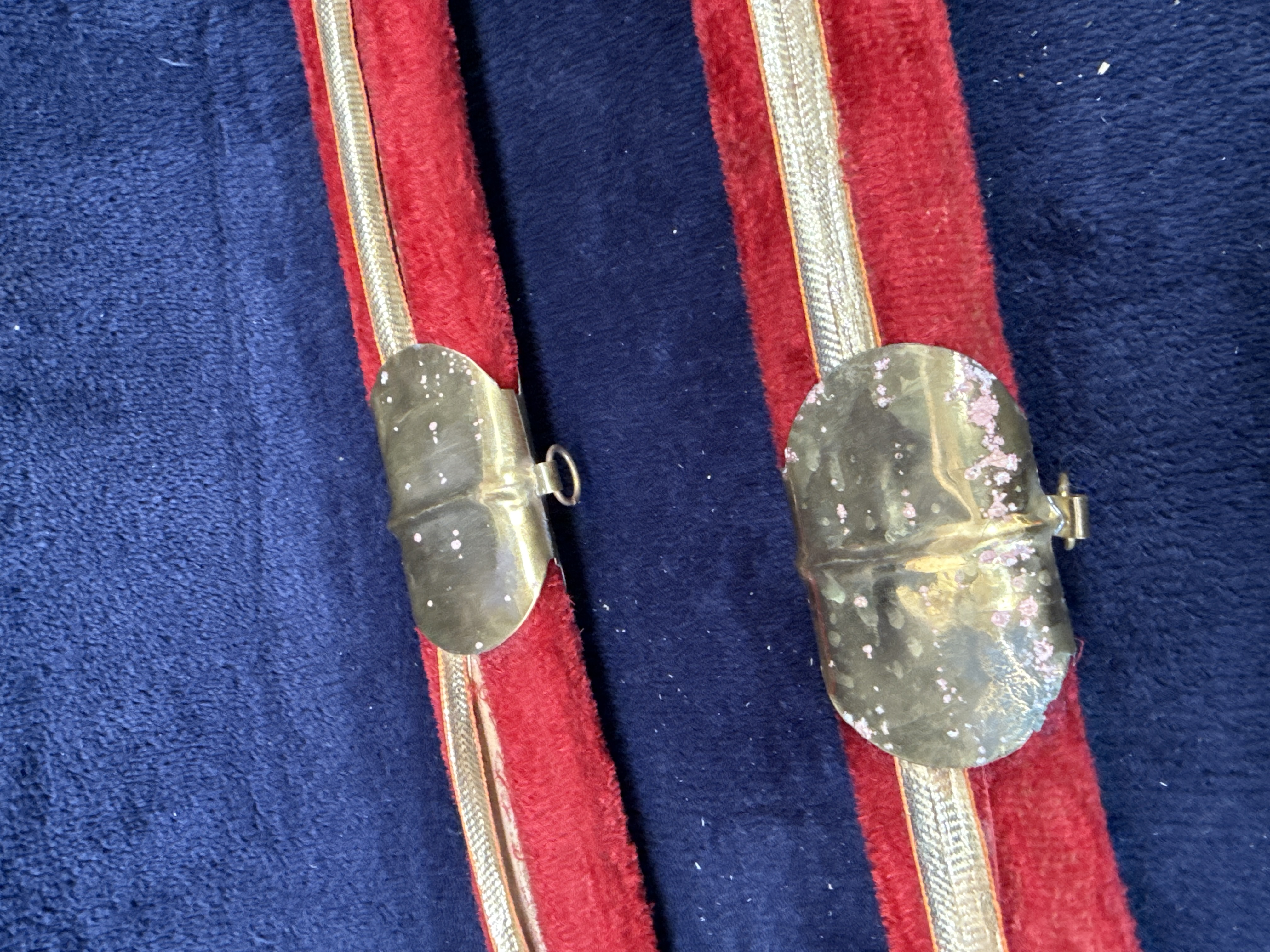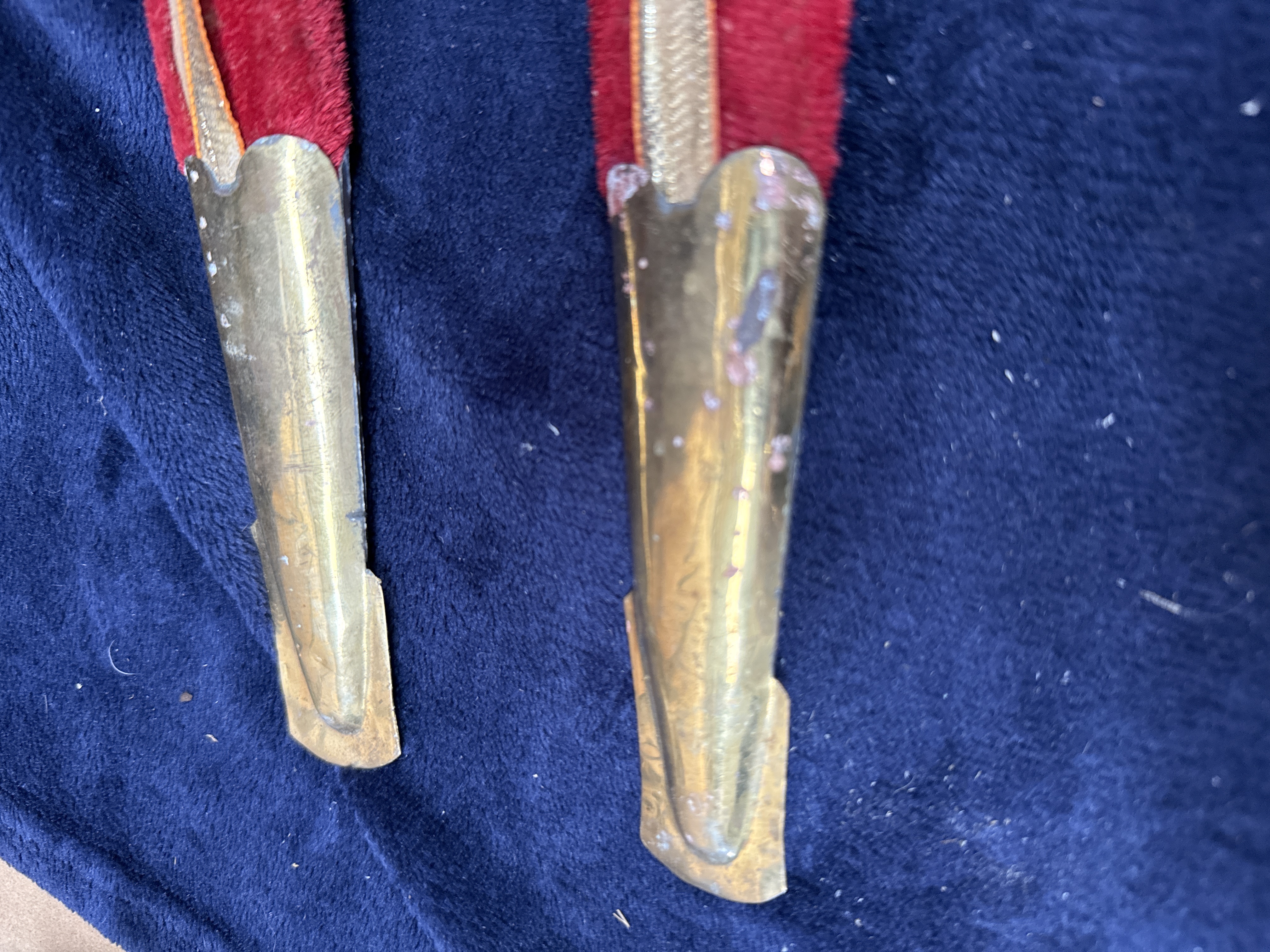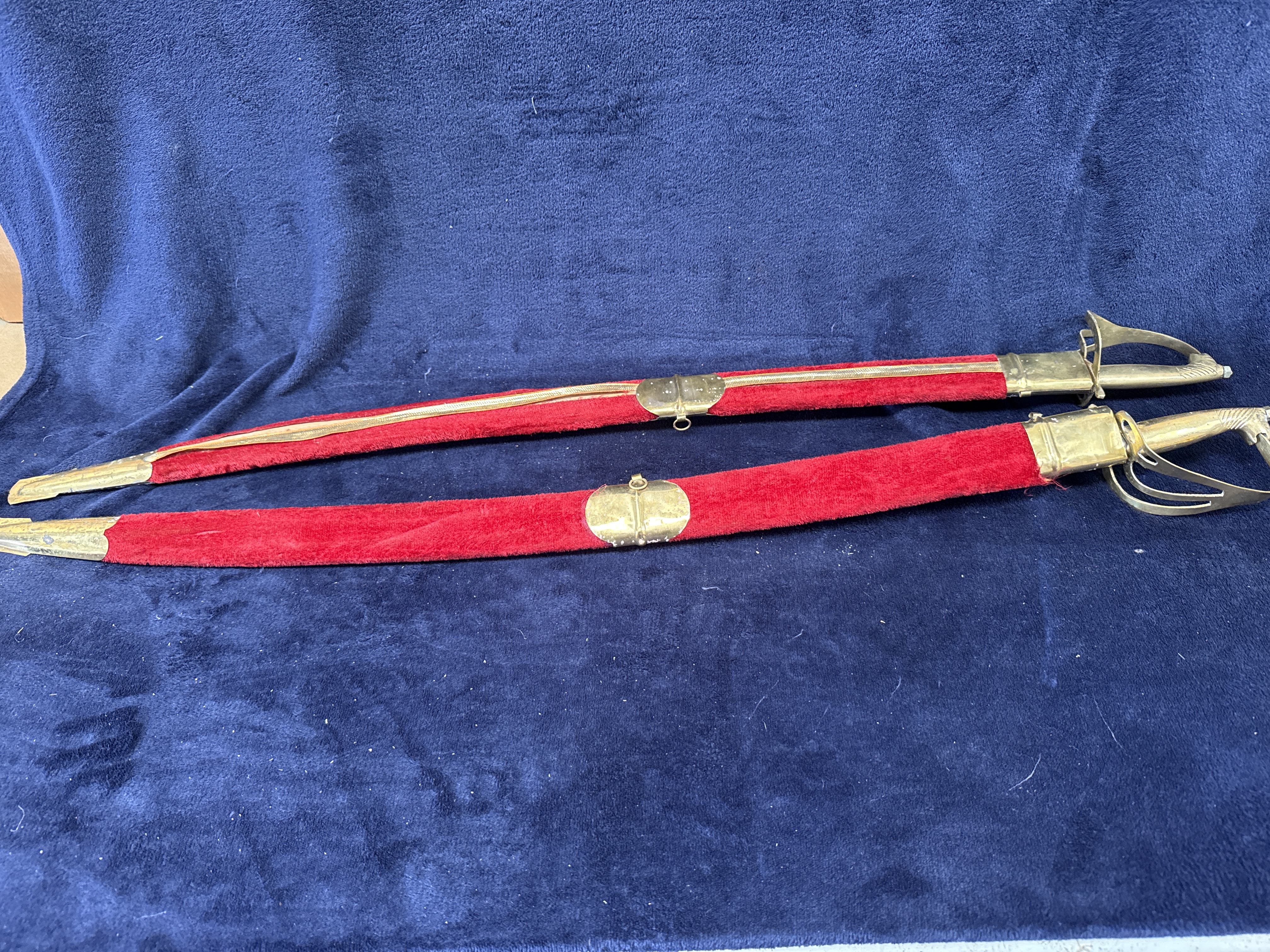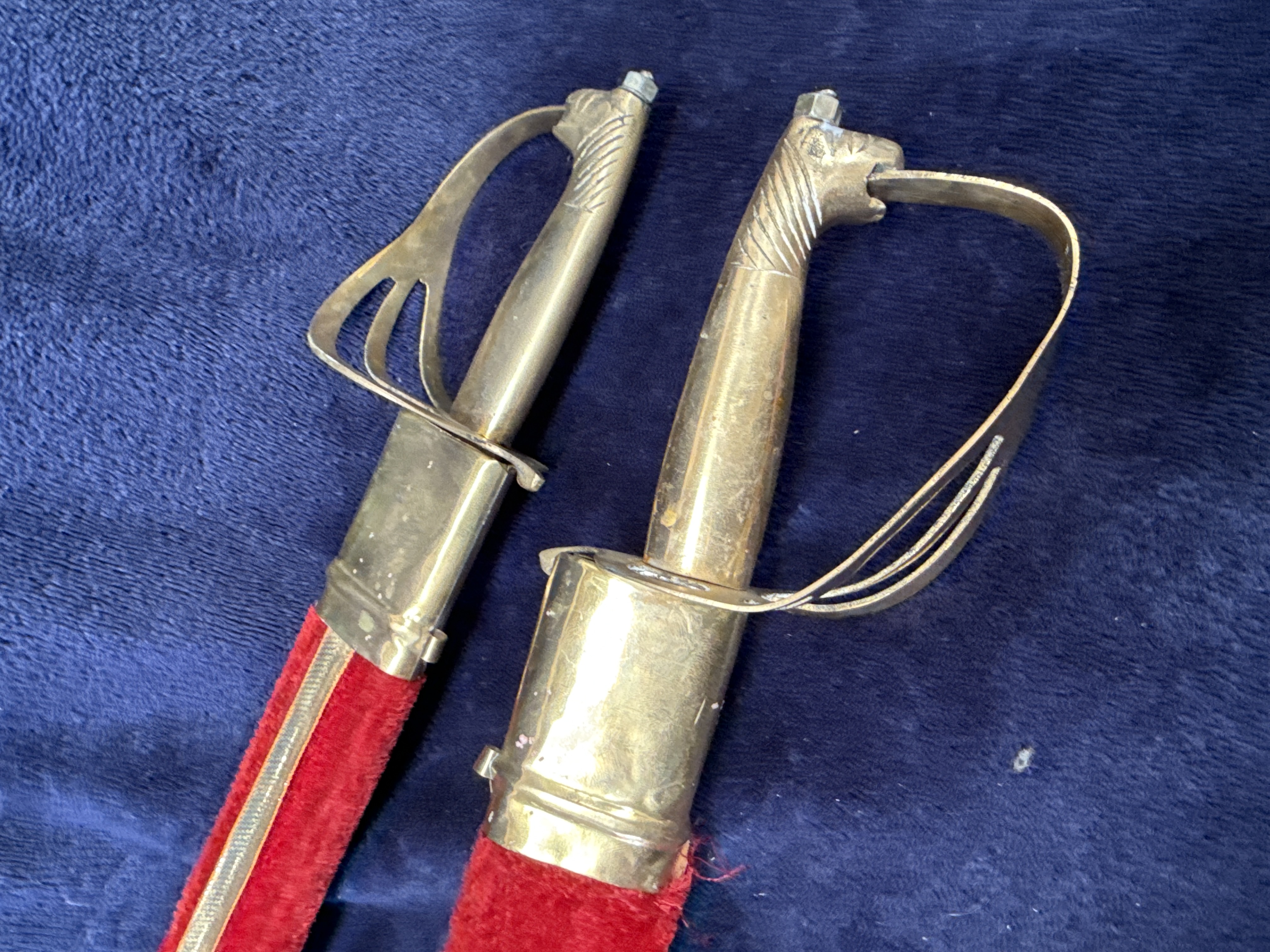 A pair of decorative sabre-style swords, attributed to mid-to-late 20th-century Indian manufacture, of the type commonly used for ceremonial or wedding purposes. Each sword features a cast brass hilt with a pommel shaped as a stylised animal head, secured by an exposed hex nut. The grips are textured with vertical ridges, and the guards are formed as simple knuckle bows with three decorative piercings. The scabbards are wood-cored and covered in a red velvet-style fabric, embellished with a gold-tone metallic braid running along the spine. Brass scabbard fittings include a locket at the throat, a mid-band with a suspension ring, and a chape at the tip. No maker’s marks or inscriptions are visible on the external surfaces.