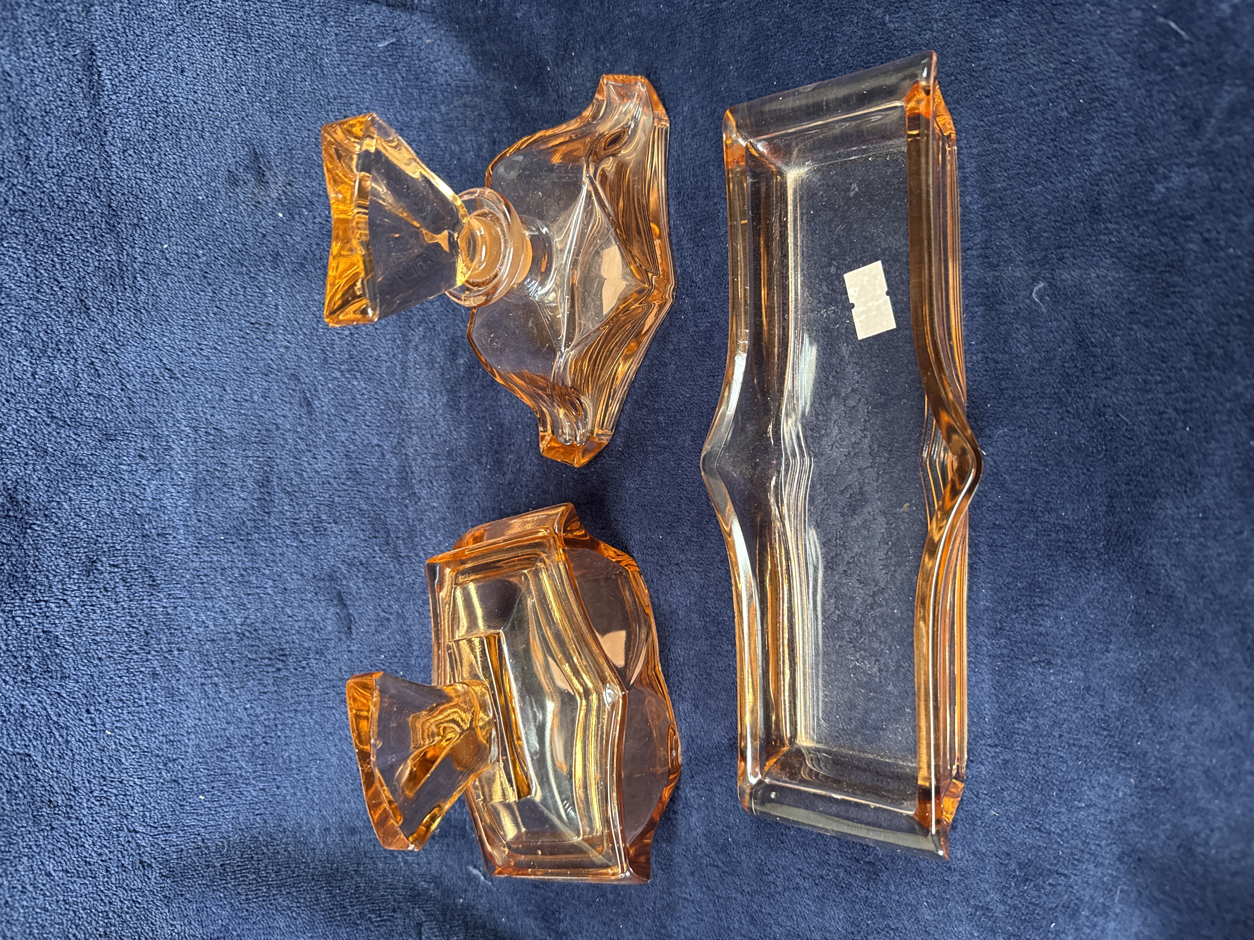 This three-piece dressing table set is manufactured from peach-tinted pressed glass. The set comprises two perfume bottles with matching geometric stoppers and a long rectangular trinket tray. The design features the stepped, angular, and faceted forms characteristic of the Art Deco period, circa 1930-1939. No maker marks, symbols, or moulded signatures are visible on the glass. The set is in the style of British or Northern European manufacturers such as Bagley or Walther and Sohne. A small, blank adhesive label is located on the interior base of the tray.