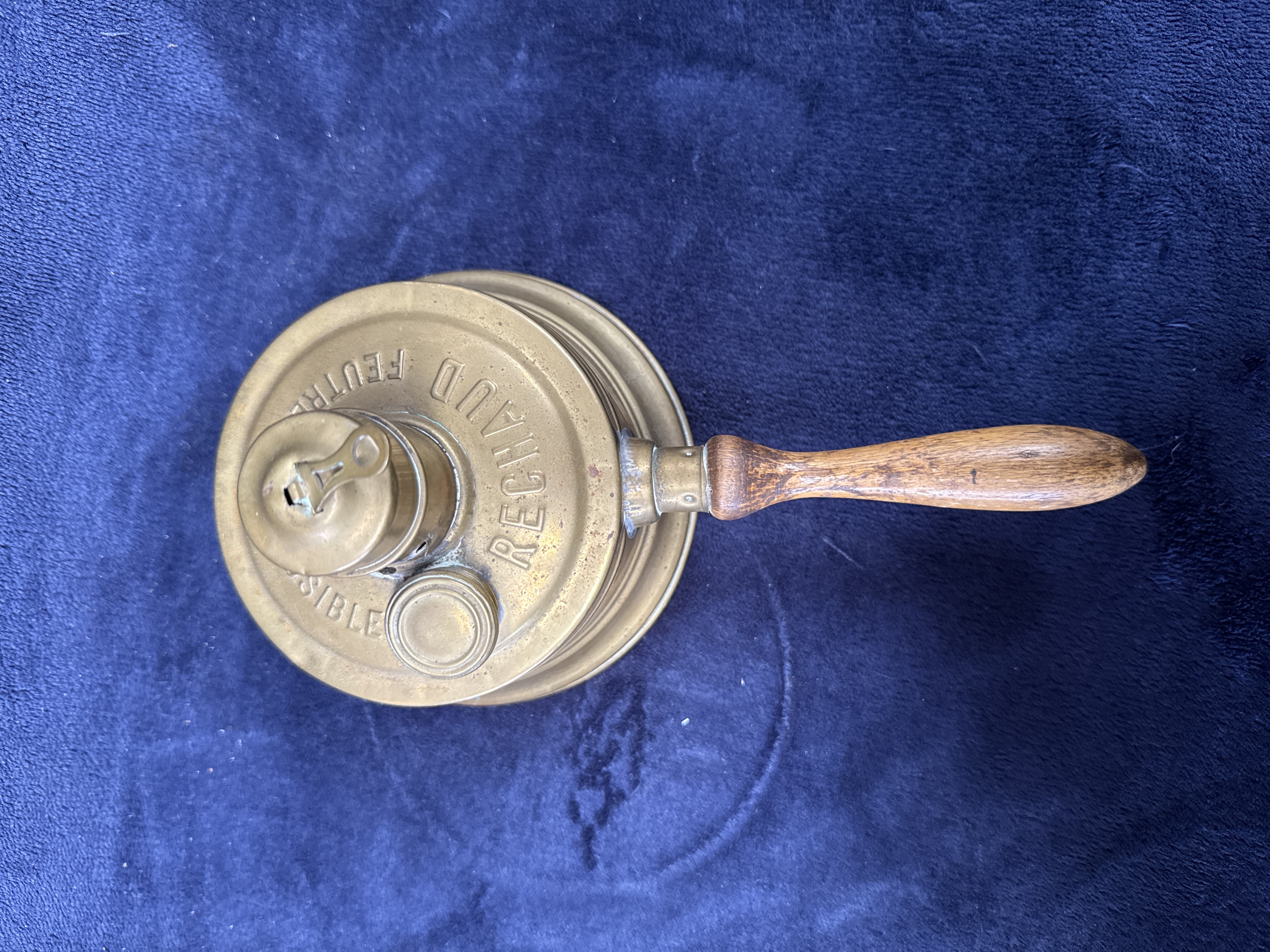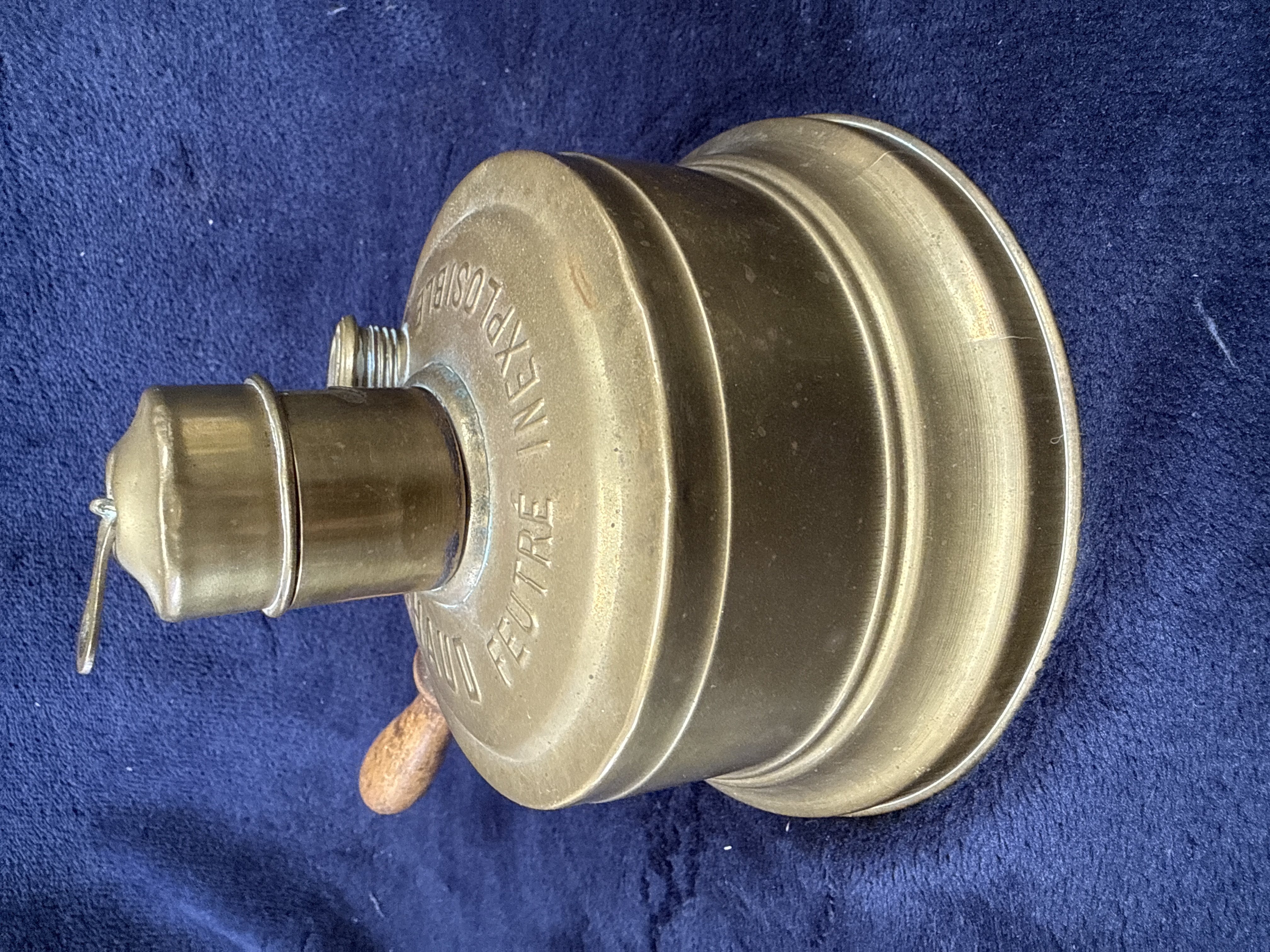 An early 20th-century French portable spirit burner, or rechaud, manufactured from lathe-turned brass. The circular reservoir is designed with a stepped profile and features embossed lettering to the top reading RECHAUD FEUTRE INEXPLOSIBLE. This mark identifies the item as a safety stove containing a felt-lined reservoir intended to prevent the accidental explosion or leakage of spirits. The burner assembly is positioned offset on the top of the reservoir and is equipped with a removable brass snuffer cap secured by a fine link chain. A secondary threaded cap provides access to the filling port. The item is fitted with a horizontal turned hardwood handle attached by a brass ferrule. The construction suggests use as a standalone portable stove or as a component for a chafing dish or wax melter.