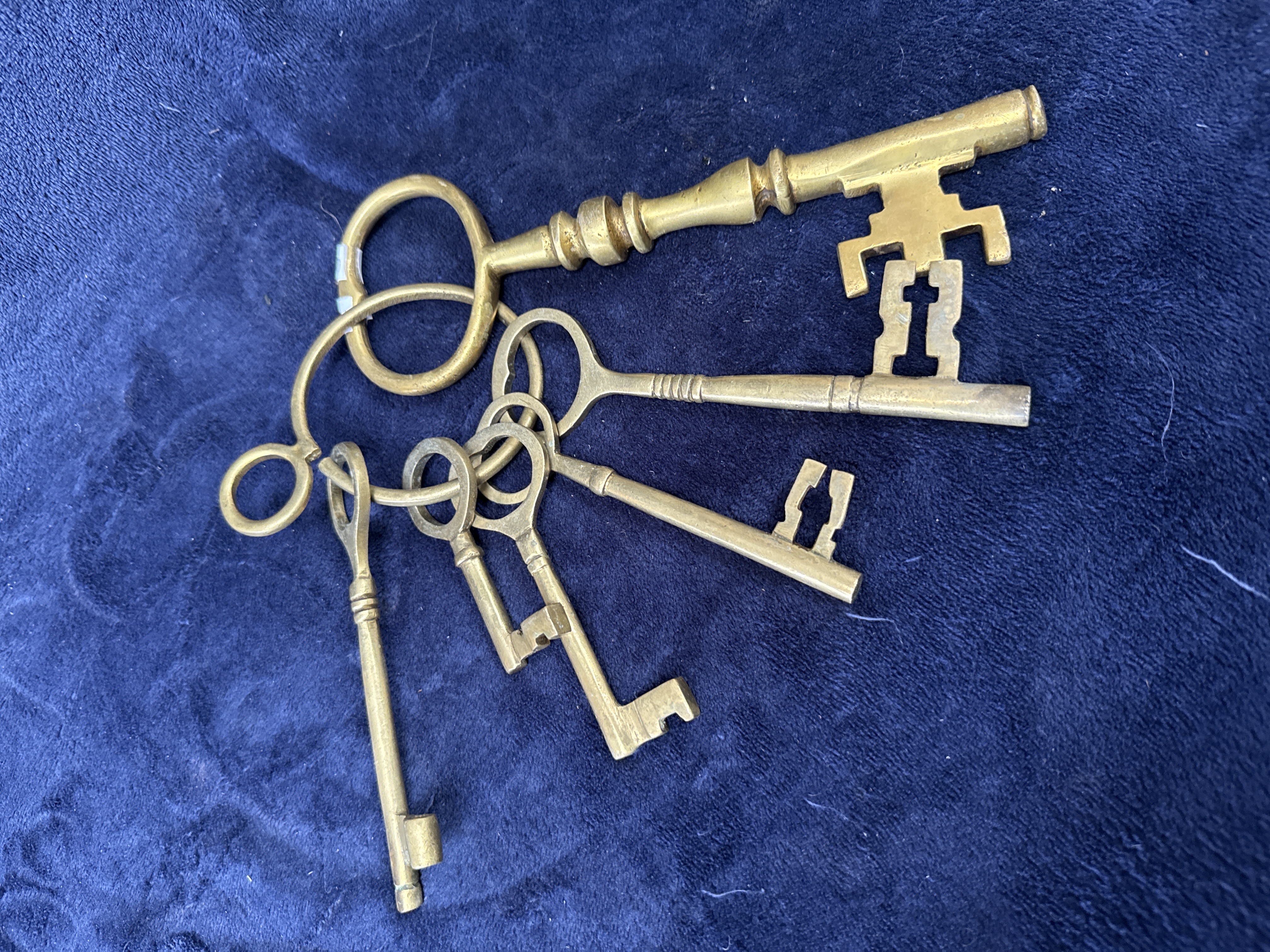 A collection of cast brass keys of varying designs and sizes, presented on a single brass split-ring. The group is headlined by a large skeleton key measuring 9 inches in length, which features a prominently turned, bulbous shank and an ornate, complex bit with symmetrical geometric cutouts and a hollow tip. The assortment also includes a secondary key with a decorative bit featuring a keyhole-shaped central cutout, alongside several smaller cabinet or drawer-style keys with simpler bit configurations and oval or circular bows. The styles range from Baroque revival to 19th-century cabinet designs. All items are manufactured from cast brass, displaying characteristic surface textures and occasional casting seams.