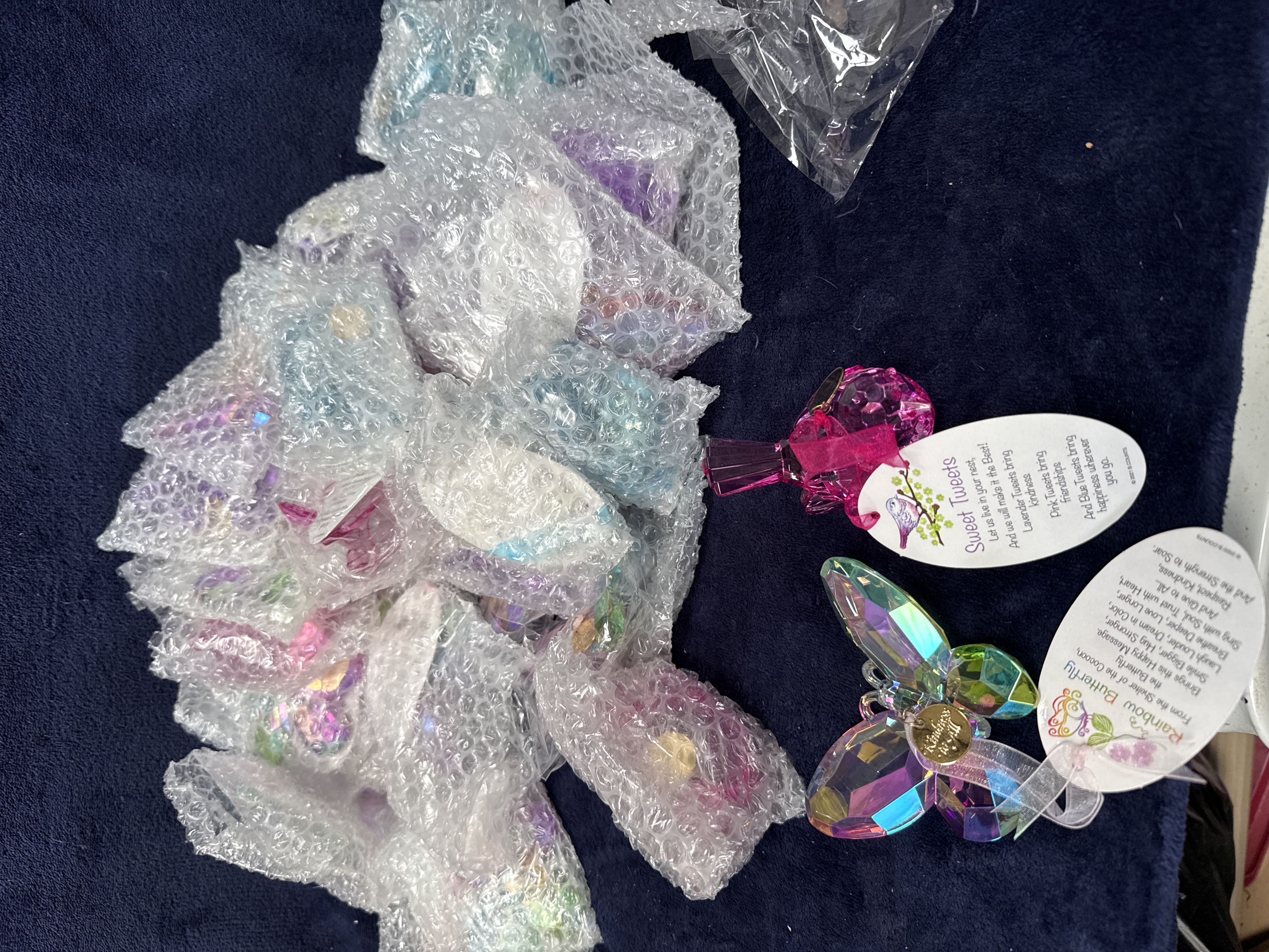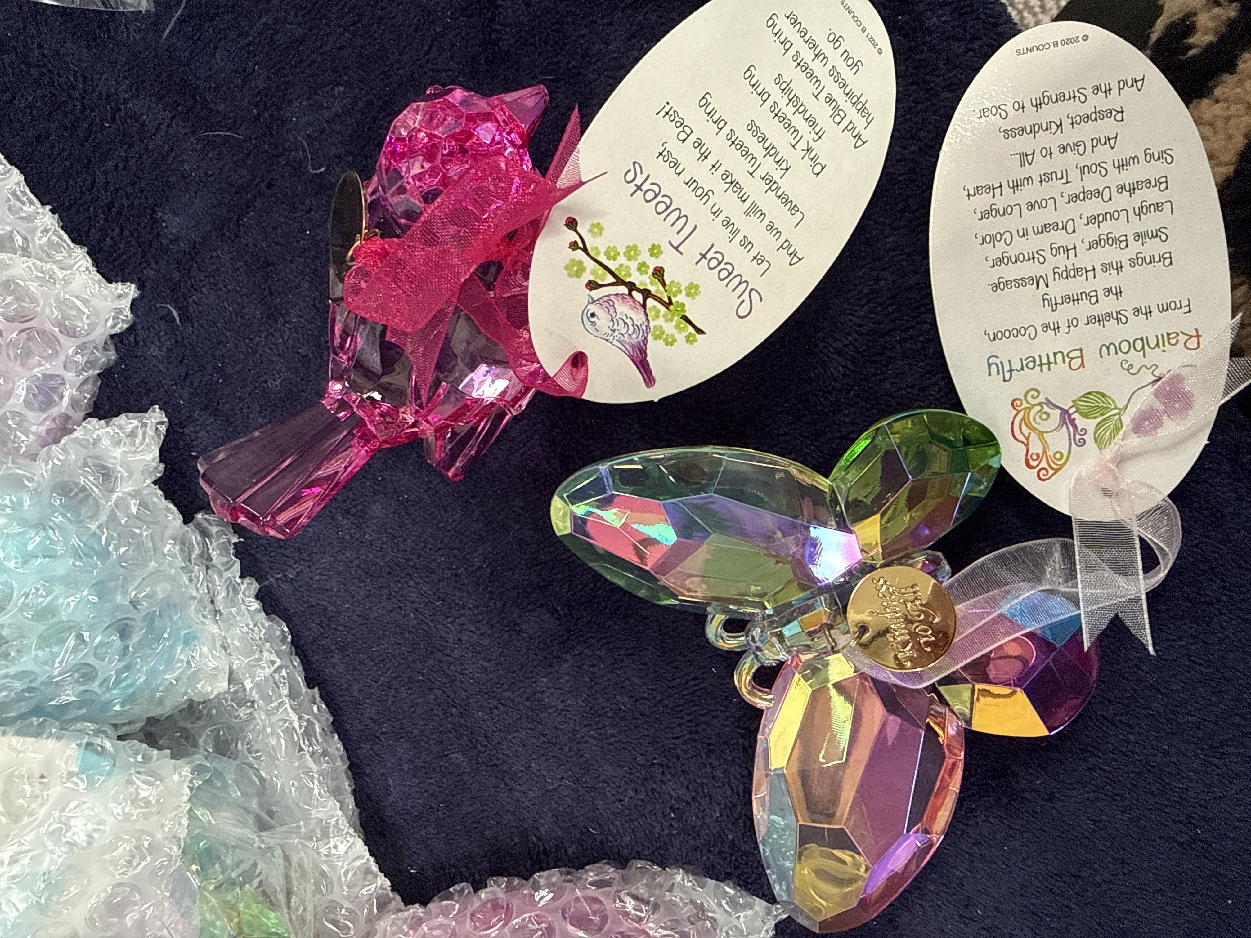 A collection of 33 contemporary decorative ornaments from the Kristy’s Kindness range, copyrighted to B. Counts. The lot comprises numerous faceted figures depicting birds and butterflies. The bird figures, identified on tags as Sweet Tweets, are rendered in a translucent pink faceted material, while the butterfly figures, identified as Rainbow Butterfly, feature a multi-coloured iridescent Aurora Borealis finish. Each piece is constructed from faceted acrylic or resin designed to simulate the appearance of cut crystal. The items are adorned with small, circular gold-tone metal tags embossed with the script lettering Kristy’s Kindness. Original printed paper gift tags are attached to the figures, bearing copyright marks for B. Counts dated 2020 and 2021.
