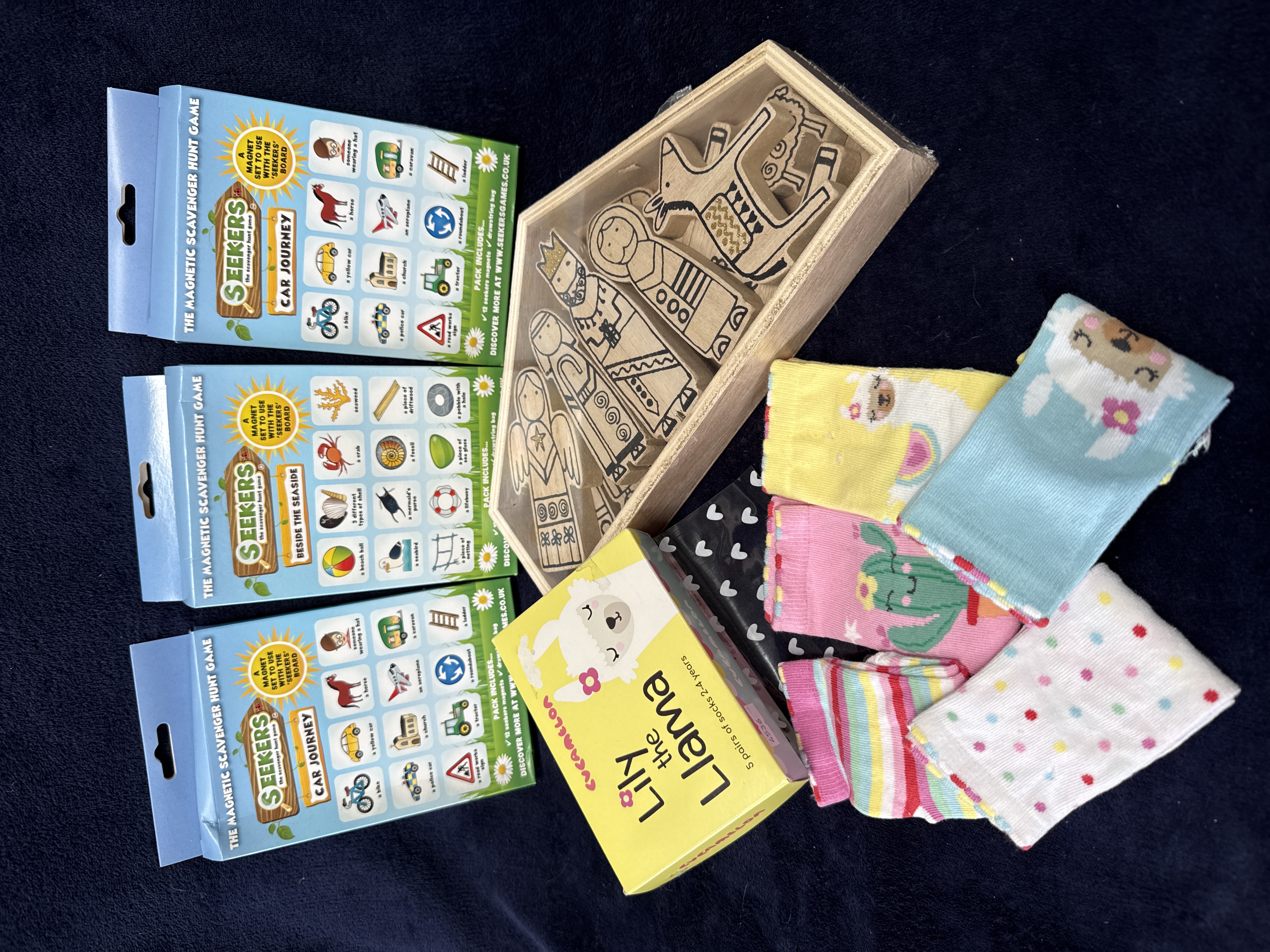 A collection of contemporary children’s toys, games, and apparel. The lot includes three magnetic scavenger hunt game expansion sets manufactured by Seekers Games, comprising two Car Journey sets and one Beside the Seaside set. Each set is housed in its original cardboard retail packaging and contains twelve magnets and a drawstring bag. Also included is a stylised wooden Nativity set, consisting of twelve pieces including an angel, three magi, Mary, Joseph, and various animals, all contained within a house-shaped wooden storage tray. The wooden figures feature black printed or etched outlines and the set is in the style of those produced by Wondrous Deco. The collection is completed by a boxed set of Lily the Llama children’s socks by Cvcamelor, sized for ages 2-4 years. The set contains five pairs of textile socks featuring llama, cactus, stripe, and dot motifs, accompanied by a black fabric accessory with a white heart pattern.