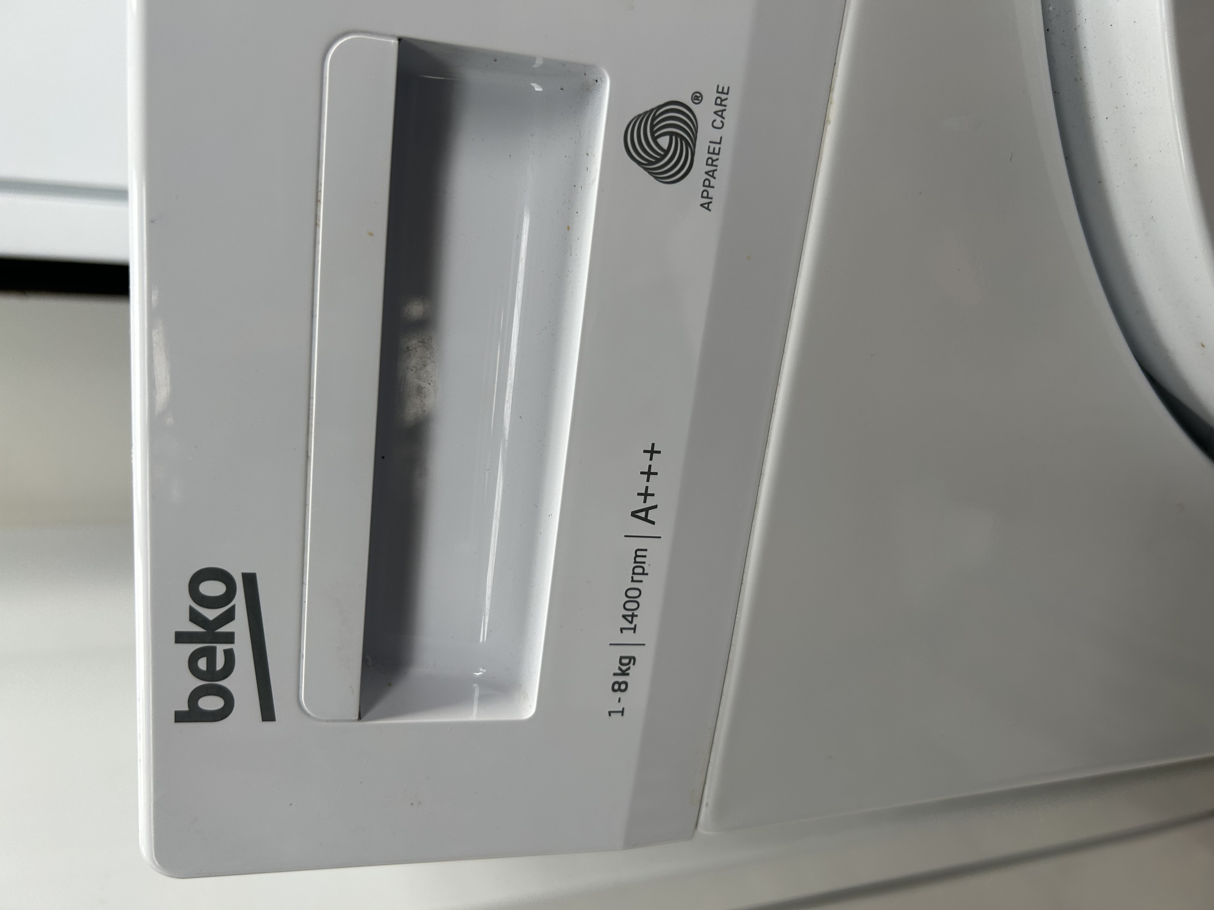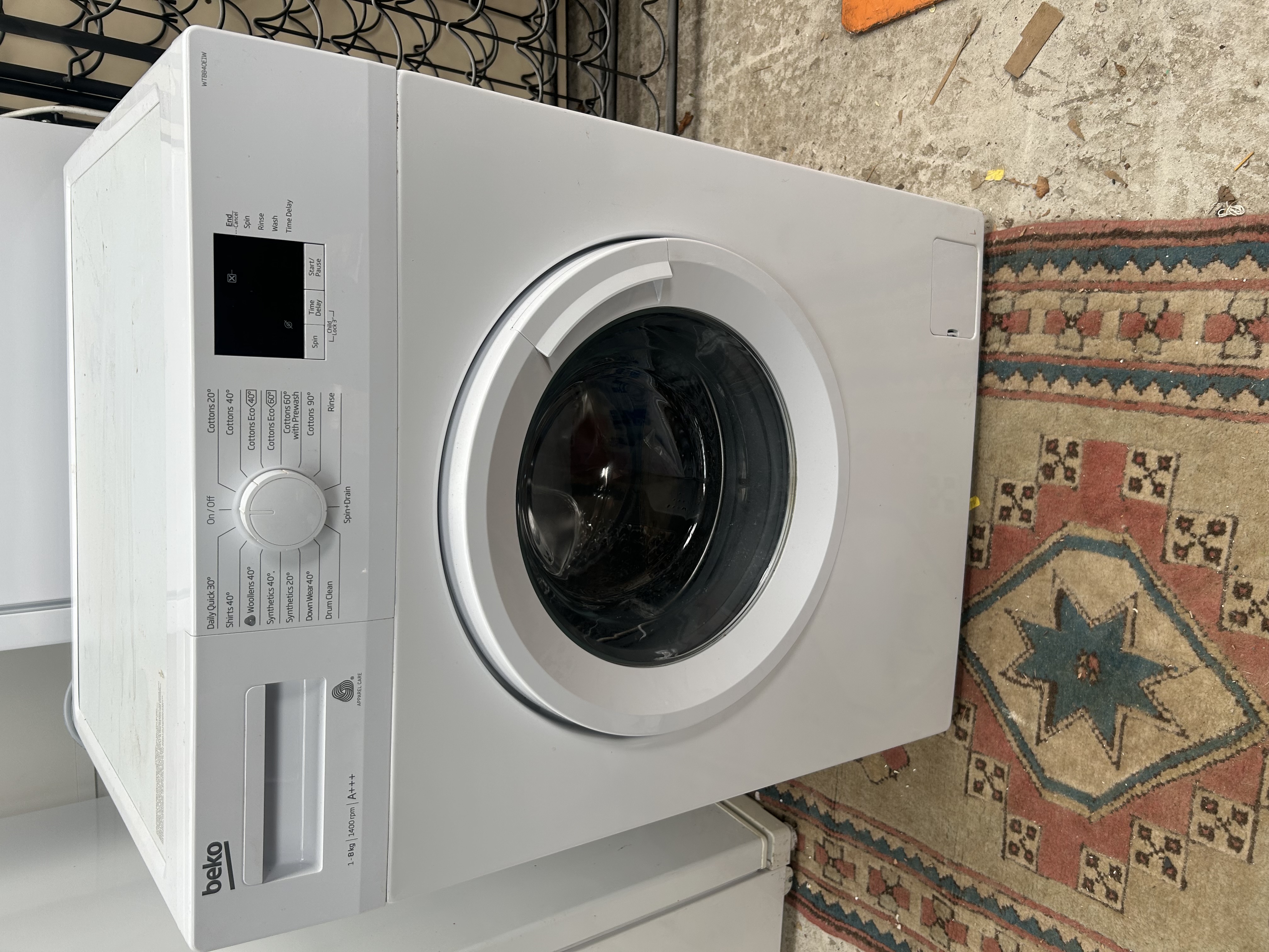 A Beko front-loading washing machine, model number WTB840E1W. The appliance has a rated capacity of 8kg and a maximum spin speed of 1400 rpm. The control fascia includes a central programme selector dial and a digital display screen. Available wash cycles include Cottons (20 to 90 degrees Celsius), Cottons Eco, Synthetics (20 and 40 degrees Celsius), Woollens 40, Shirts 40, and a Daily Quick 30-minute cycle. Additional settings include Drum Clean, Down Wear 40, Spin and Drain, and Rinse. The unit features a time delay function and a child lock. The front of the detergent drawer is marked with the Beko brand name and technical specifications including an A+++ energy rating. The Woolmark Apparel Care logo is visible on the fascia. The interior features a stainless steel drum.