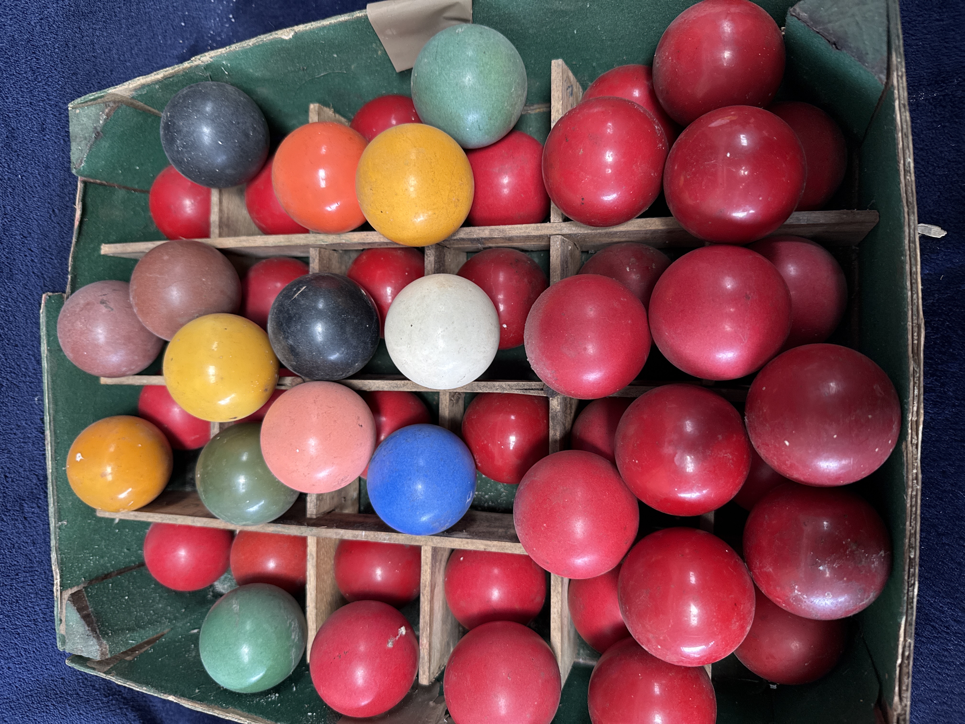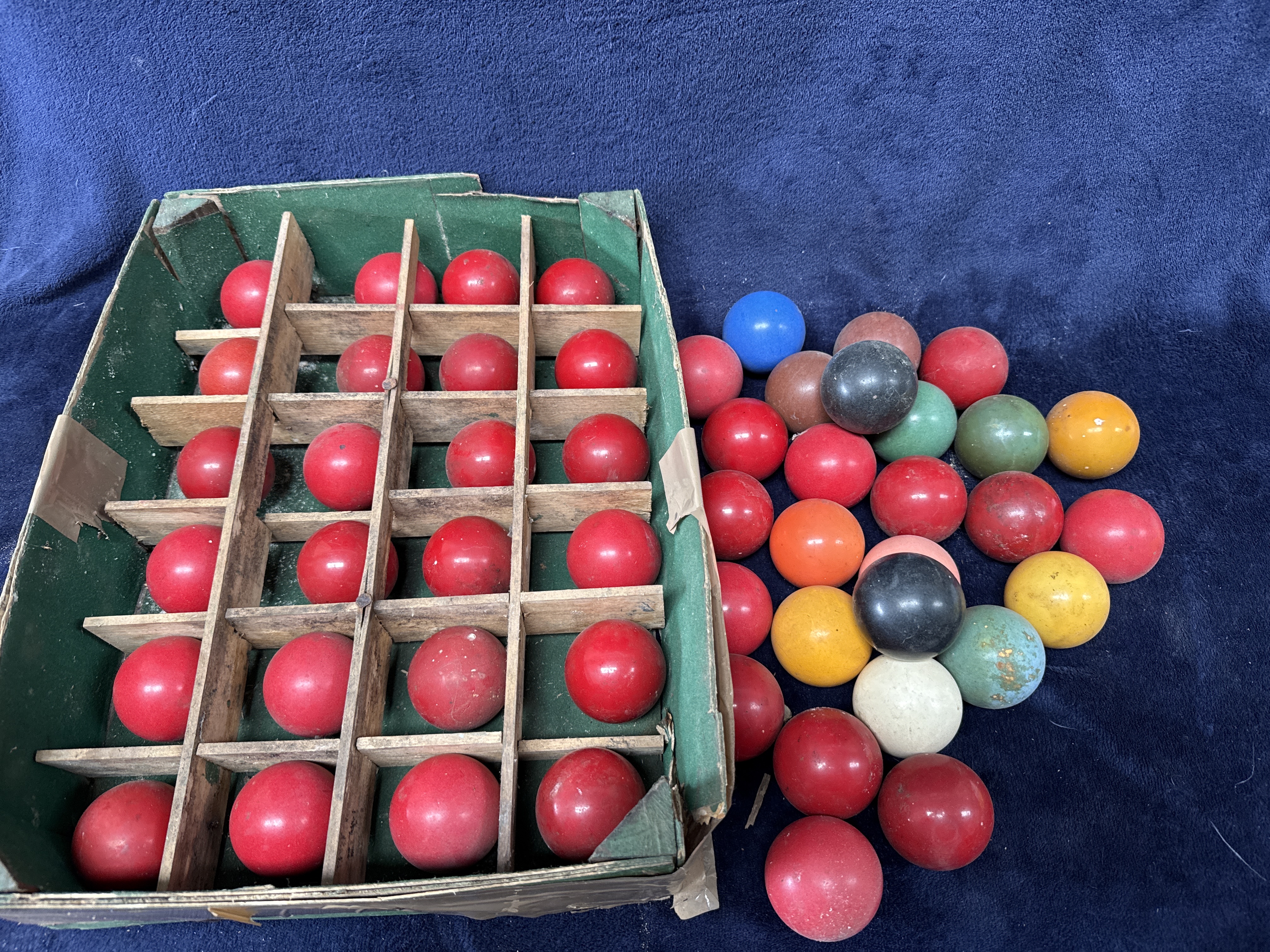 An assortment of vintage snooker balls comprising numerous reds alongside several examples in black, blue, green, yellow, and white. The collection is presented in a worn, green-lined storage box with wooden partitions, with several additional loose balls included. The items are characteristic of early 20th-century composition or resin balls, such as those produced by Bonzoline or Crystallate, although no maker marks or branding are visible. The balls feature a solid construction with a surface finish consistent with historical sporting equipment.