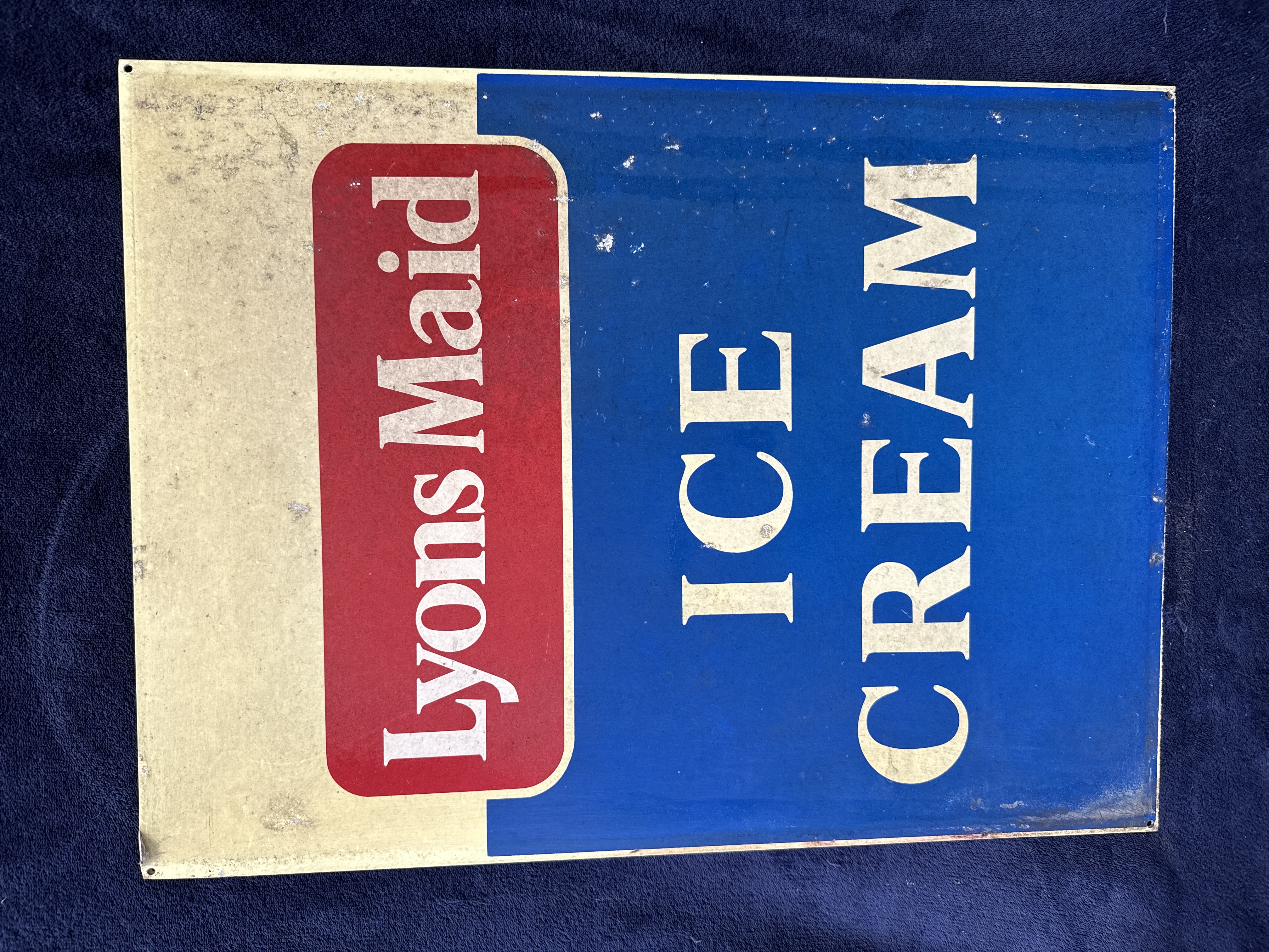A vintage advertising sign for the British brand Lyons Maid. The rectangular sign is manufactured from tin plate and features a vertical composition divided into two distinct colour fields. The left side displays a cream background with the Lyons Maid logo, consisting of a red rounded rectangular cartouche with the brand name in white serif lettering. The right side features a blue background with the words ICE CREAM in large white serif block capitals. The sign includes pre-drilled mounting holes at each corner.
