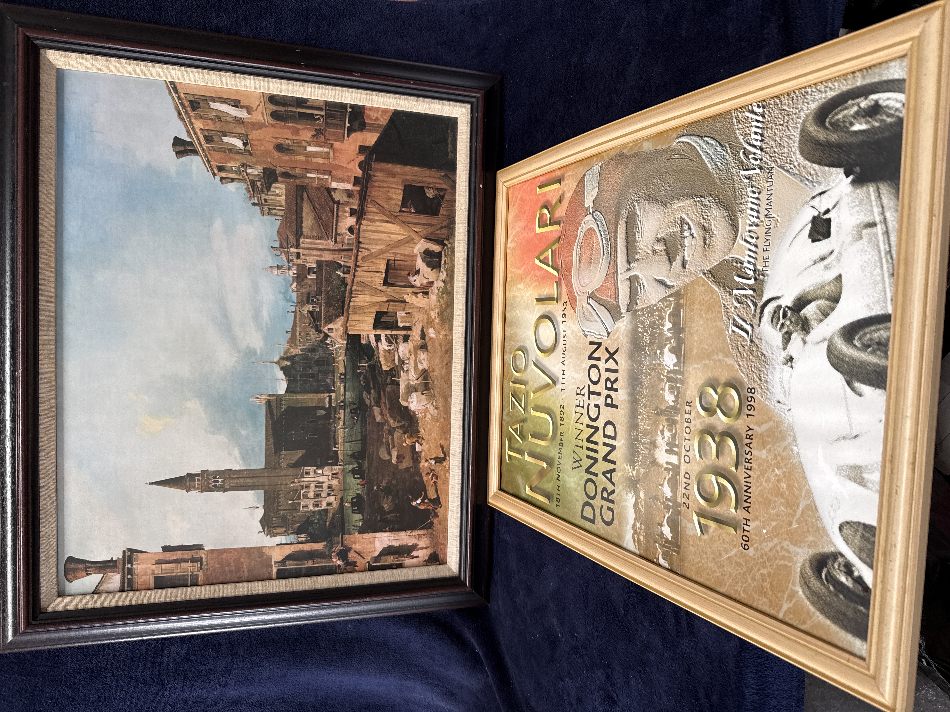 A lot comprising two framed prints. The first is a commemorative motorsport graphic print produced in 1998 to celebrate the 60th anniversary of Tazio Nuvolari’s victory at the 1938 Donington Grand Prix. The composition includes a stylised portrait of Nuvolari in racing headgear and a depiction of a vintage racing car, consistent with an Auto Union Type D. The print bears the inscriptions Tazio Nuvolari, 16th November 1892 – 11th August 1953, Winner Donington Grand Prix, 22nd October 1938, 60th Anniversary 1998, Il Mantovano Volante, and The Flying Mantuan. It is mounted in a light-toned gold-effect frame. The second item is a framed reproduction art print of a Venetian cityscape in the style of Canaletto, depicting a canal scene with historical architecture and figures. It is housed in a dark wood-effect frame with a gilt-finish inner slip.