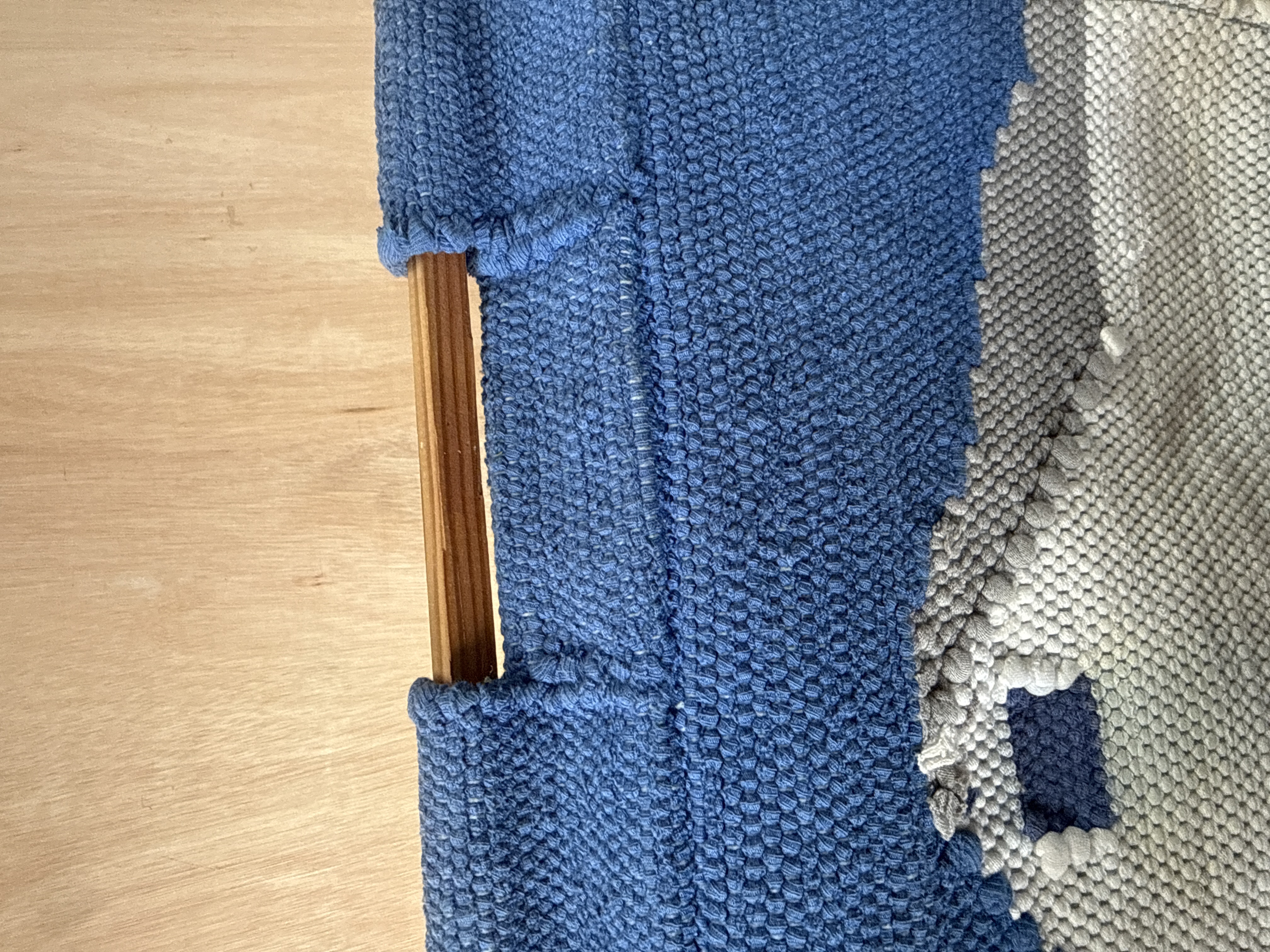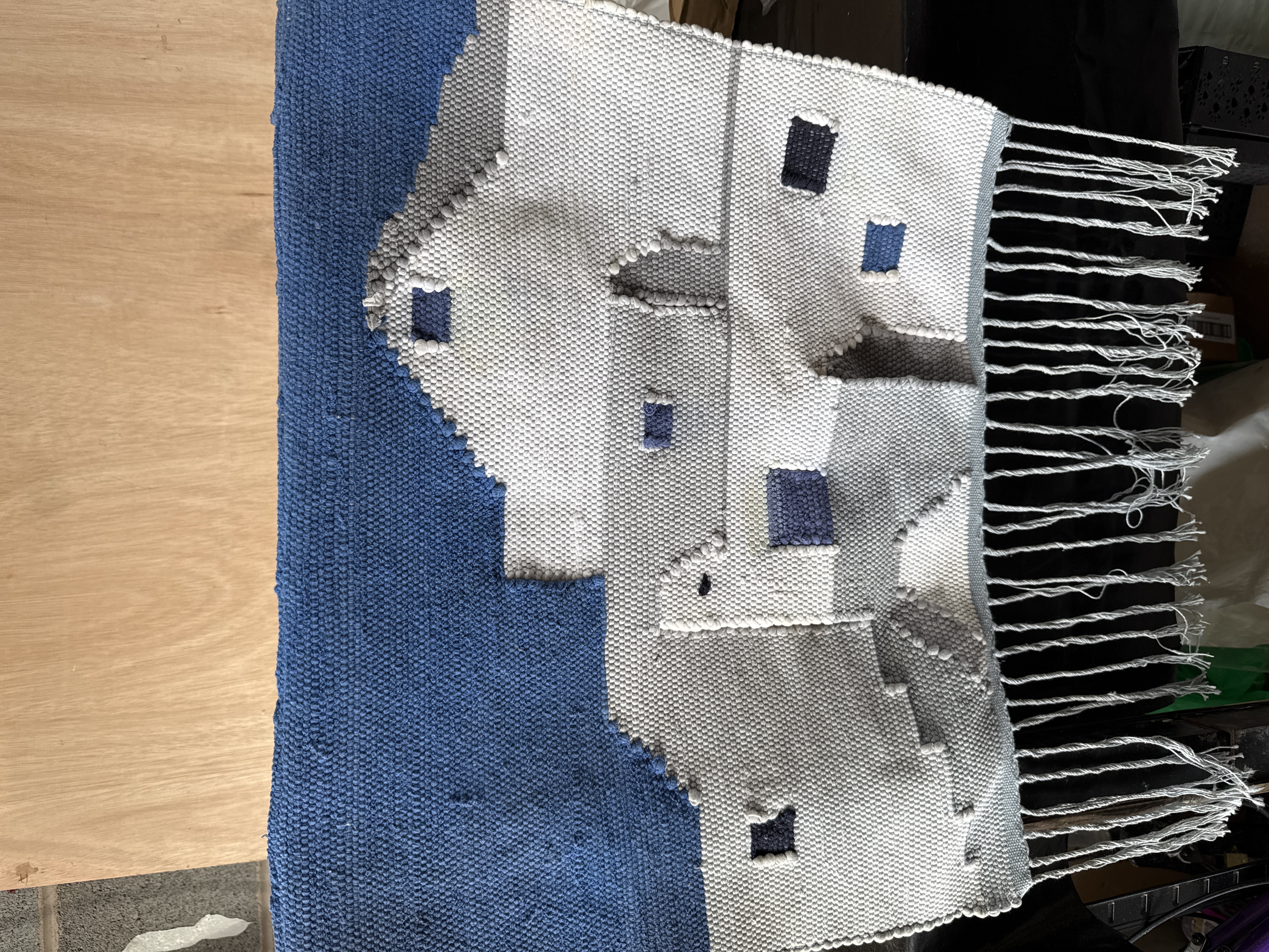 A mid-to-late 20th-century woven wall hanging or pictorial tapestry featuring a modernist architectural scene. The design depicts a cluster of geometric buildings in shades of white and grey with small square windows in blue and black, set against a solid blue background. This pattern is similar to those identified as White Village. The item is constructed from a heavy-weight, coarse-textured woven textile, likely a wool or cotton blend. It includes a twisted white fringe along one edge and a wooden rod for hanging inserted through a sleeve at the opposite end. The aesthetic is reminiscent of Mediterranean-inspired textile art from the 1960s to 1980s. No maker’s marks or labels are visible.