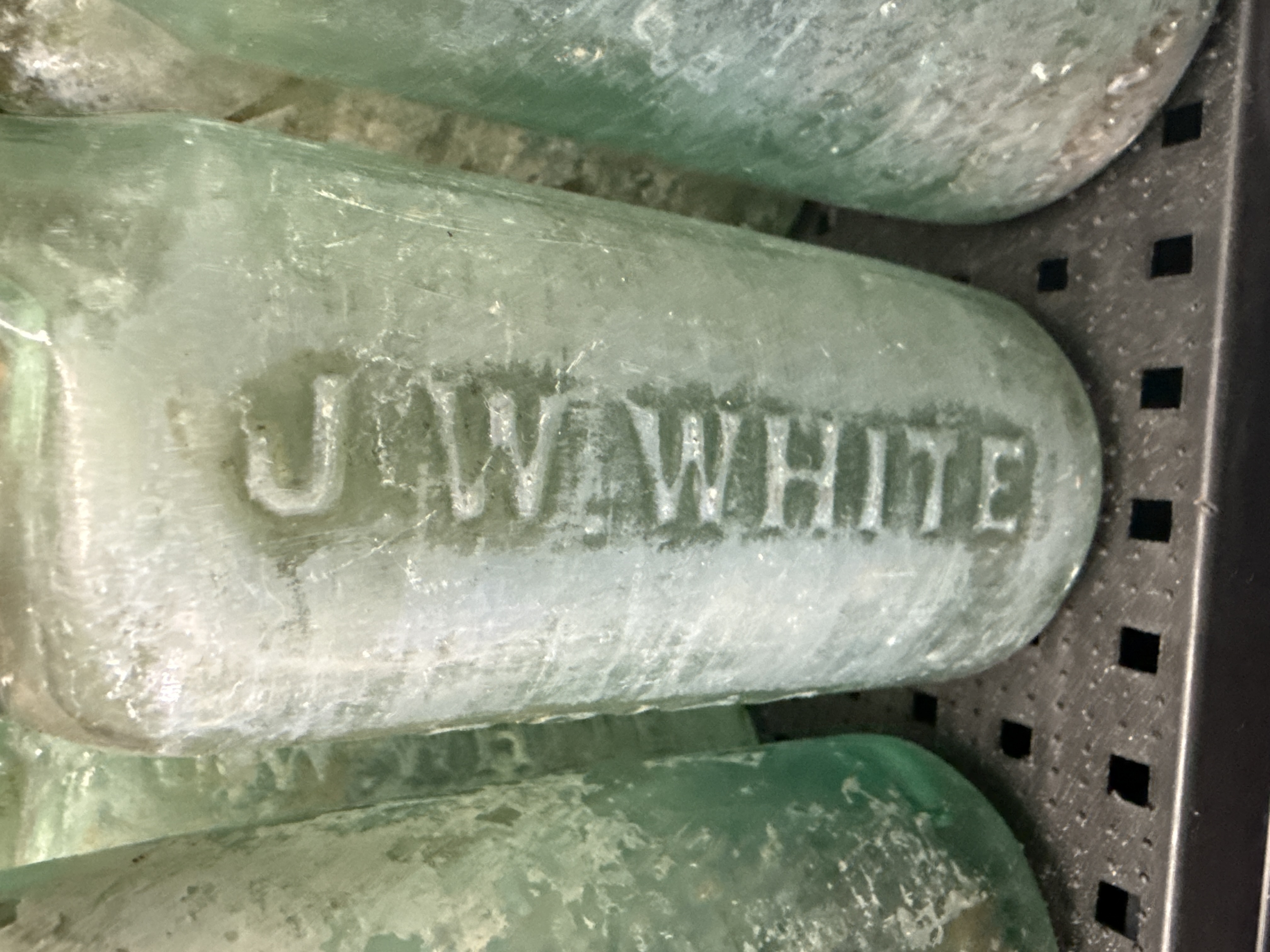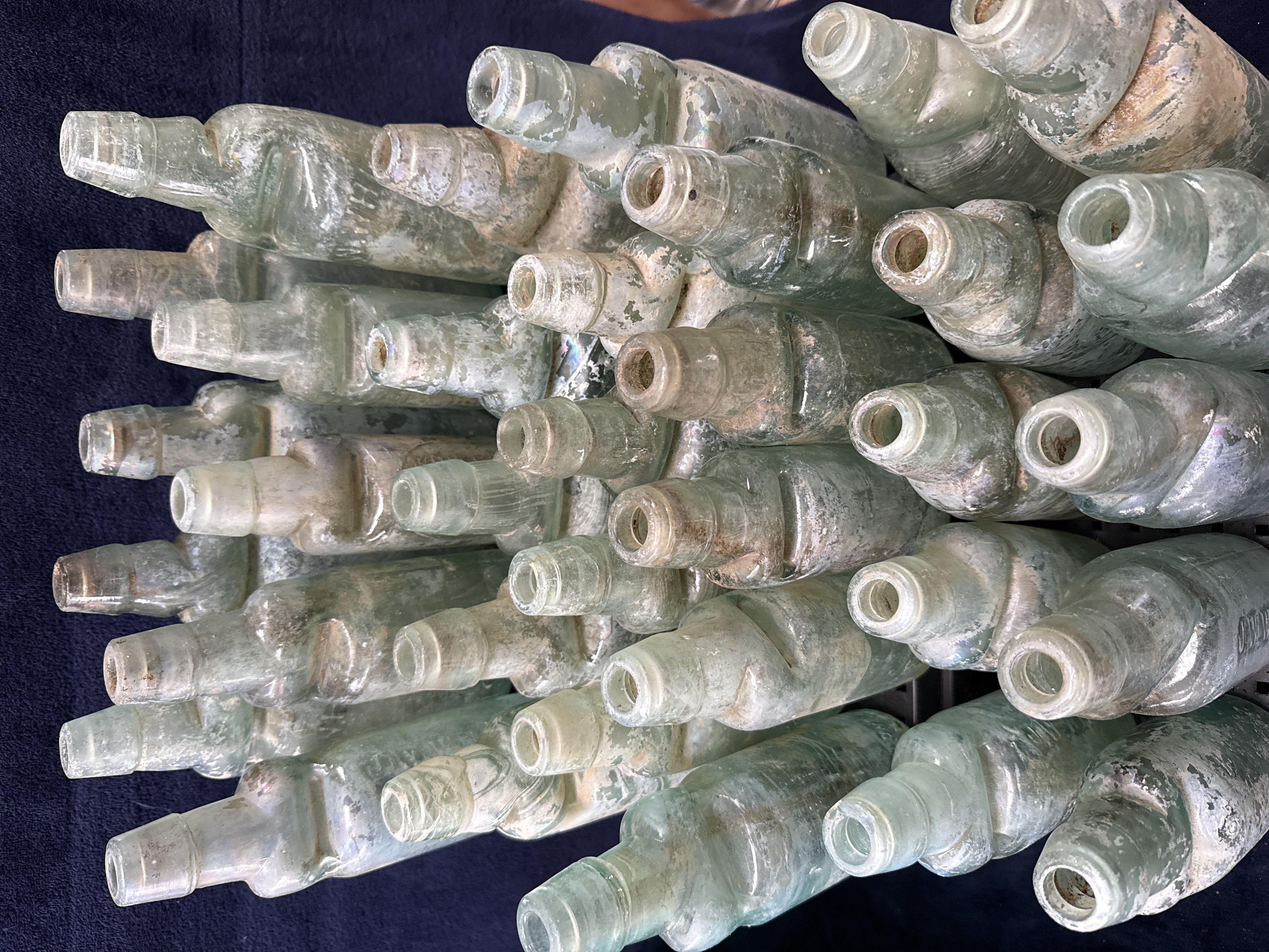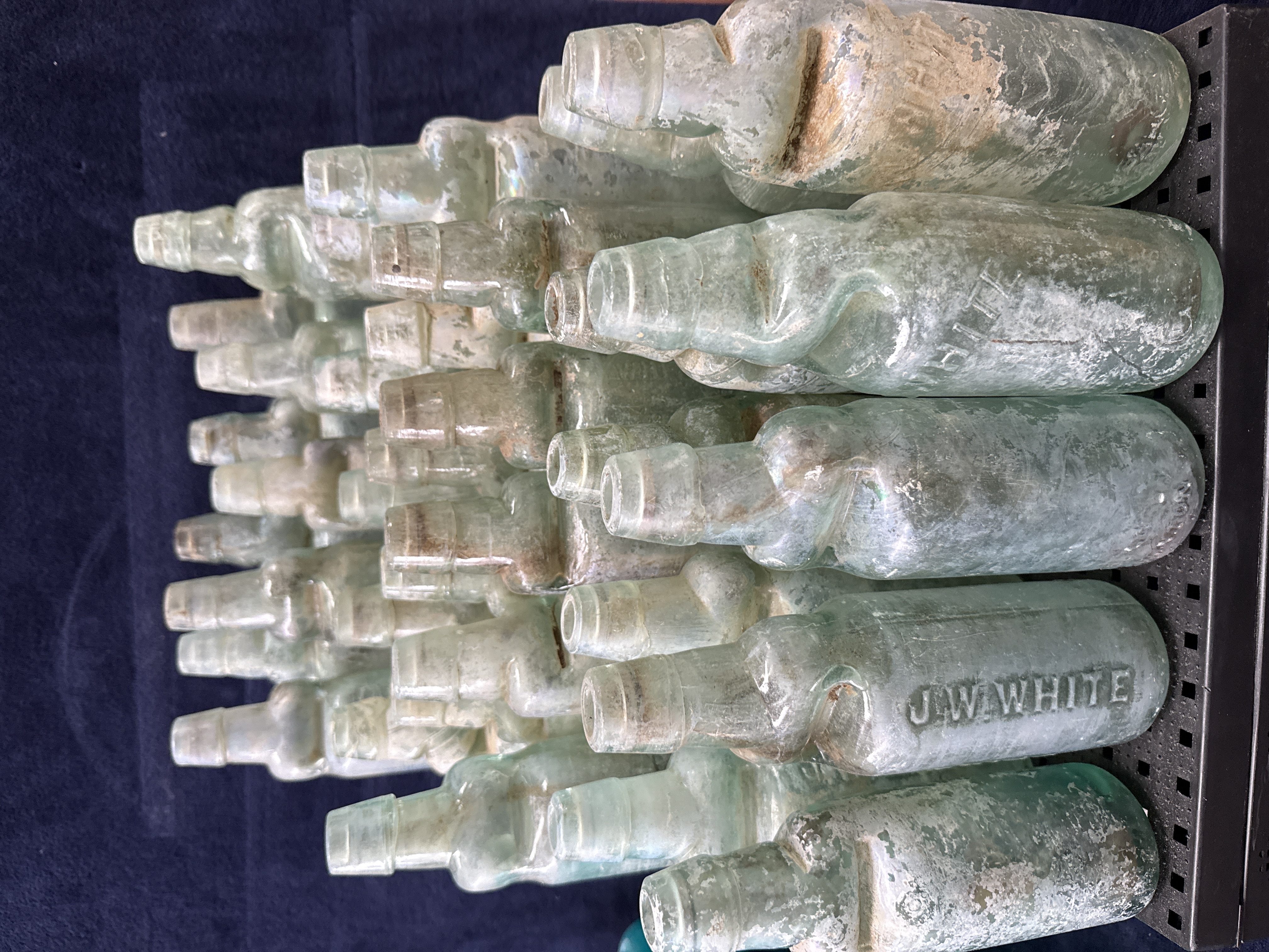 A collection of 34 antique Codd-neck soda bottles manufactured from aqua-tinted glass. Each vessel features the characteristic pinched-neck design intended to house a glass marble stopper, a design used extensively for carbonated beverages during the late 19th and early 20th centuries. One bottle is clearly embossed with the name J.W. WHITE, while another displays partial shoulder embossing including the characters HILL. The assortment includes examples associated with R. Whites etc. and other period mineral water manufacturers. These bottles are of heavy glass construction, designed to withstand high internal pressure, and represent a significant era in the history of British commercial bottling.