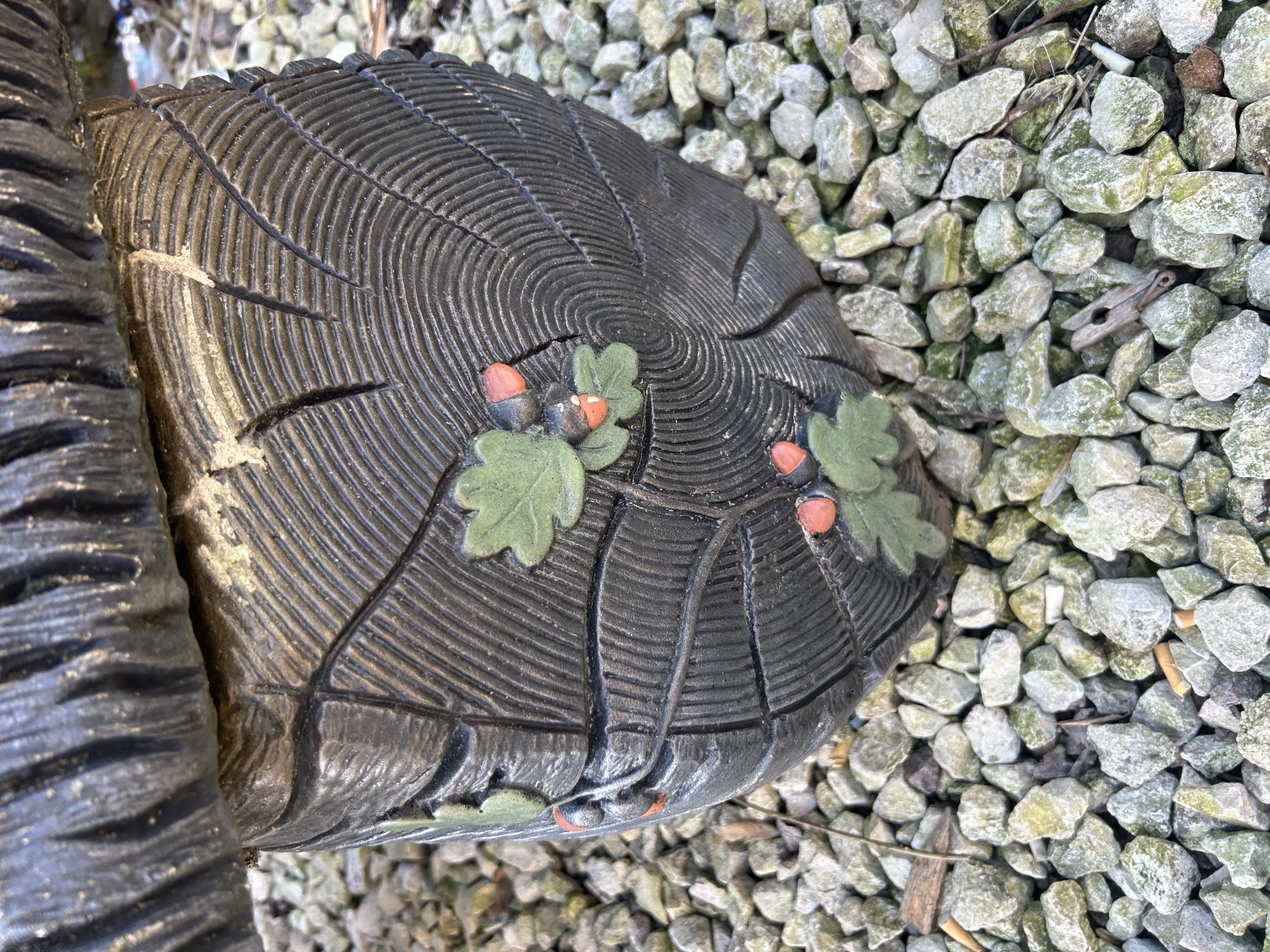 A curved garden bench in the faux bois style, constructed from reconstituted stone or cast concrete. The three-piece assembly comprises a curved seat slab resting on two cylindrical supports. The seat is moulded with a simulated wood-grain texture to the upper surface and a deeply rutted bark-effect texture along the edges. The two supports are designed to resemble log sections, featuring vertical bark textures on the sides and concentric growth-ring patterns on the ends. The supports are further decorated with relief-moulded and painted motifs depicting green oak leaves and reddish-brown acorns. No maker’s marks are visible.