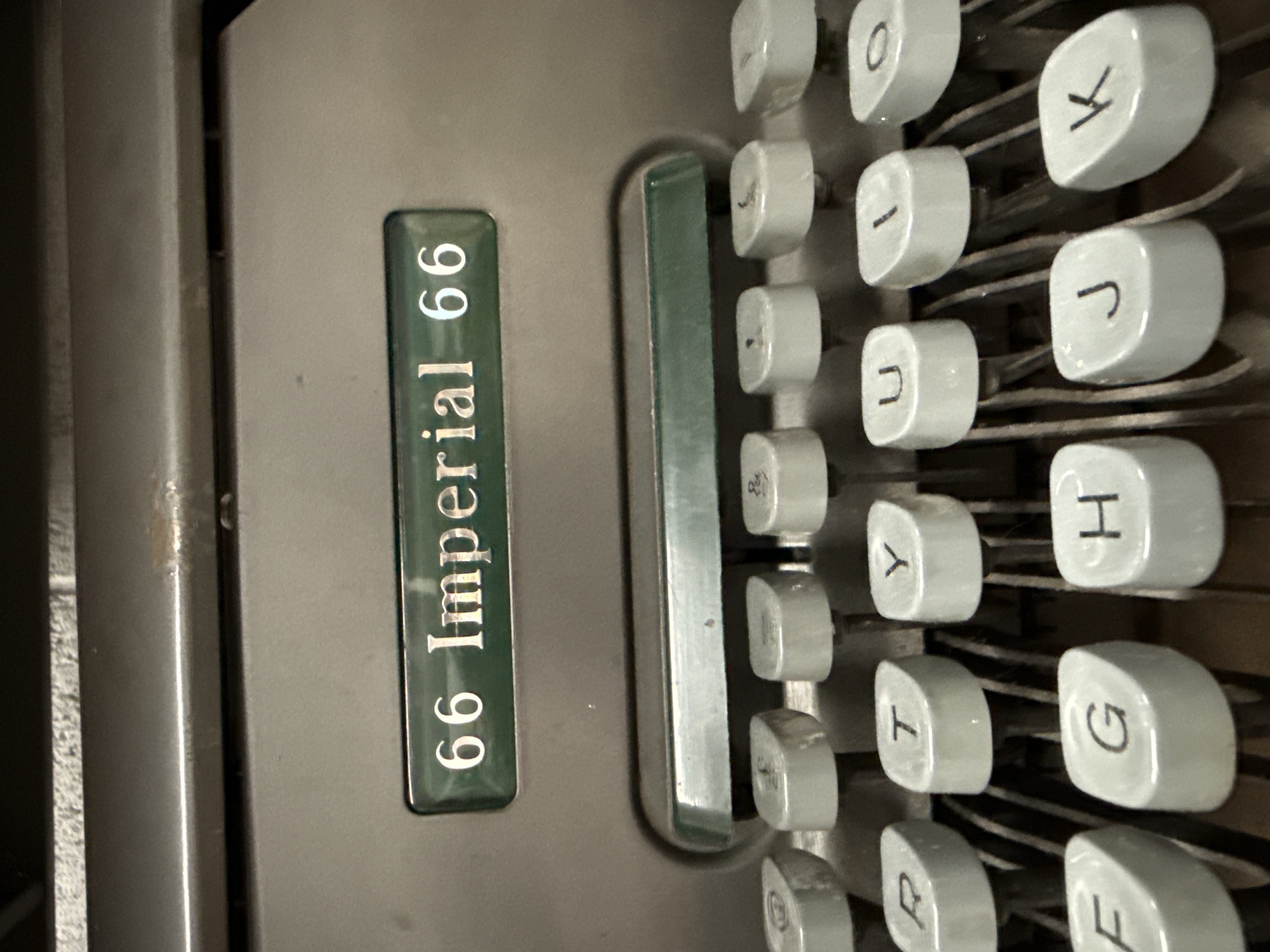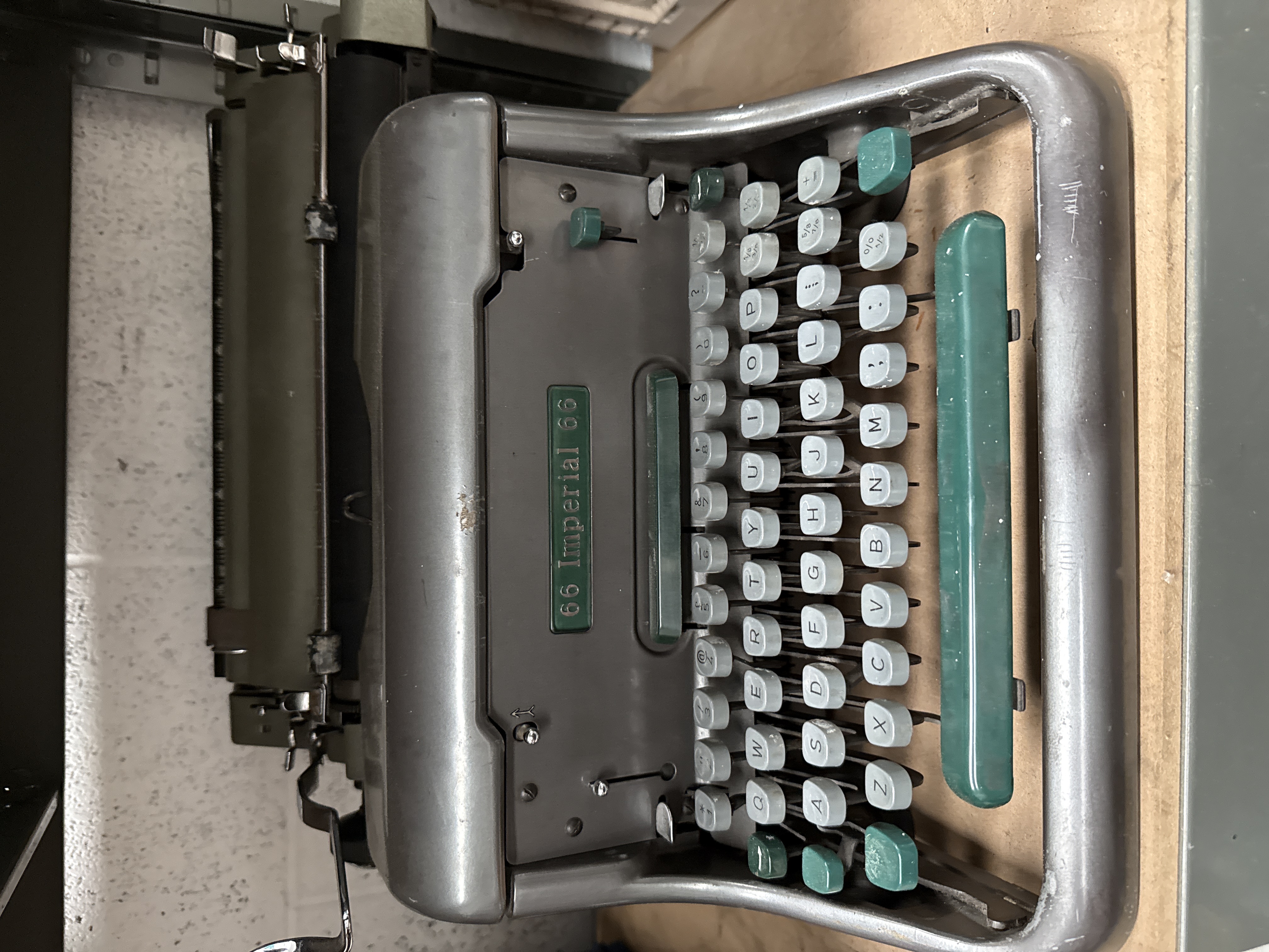A mid-20th century Imperial Model 66 manual typewriter. The machine features a grey metallic casing with a standard QWERTY keyboard layout. The alphanumeric keys are constructed from light grey square plastic with black lettering. Control keys, including the space bar and shift keys, are finished in a contrasting dark teal-green plastic. A green badge located on the top cover plate is inscribed with 66 Imperial 66. The carriage assembly and internal mechanical components are visible behind the keyboard. This model is a standard desktop unit of British manufacture.