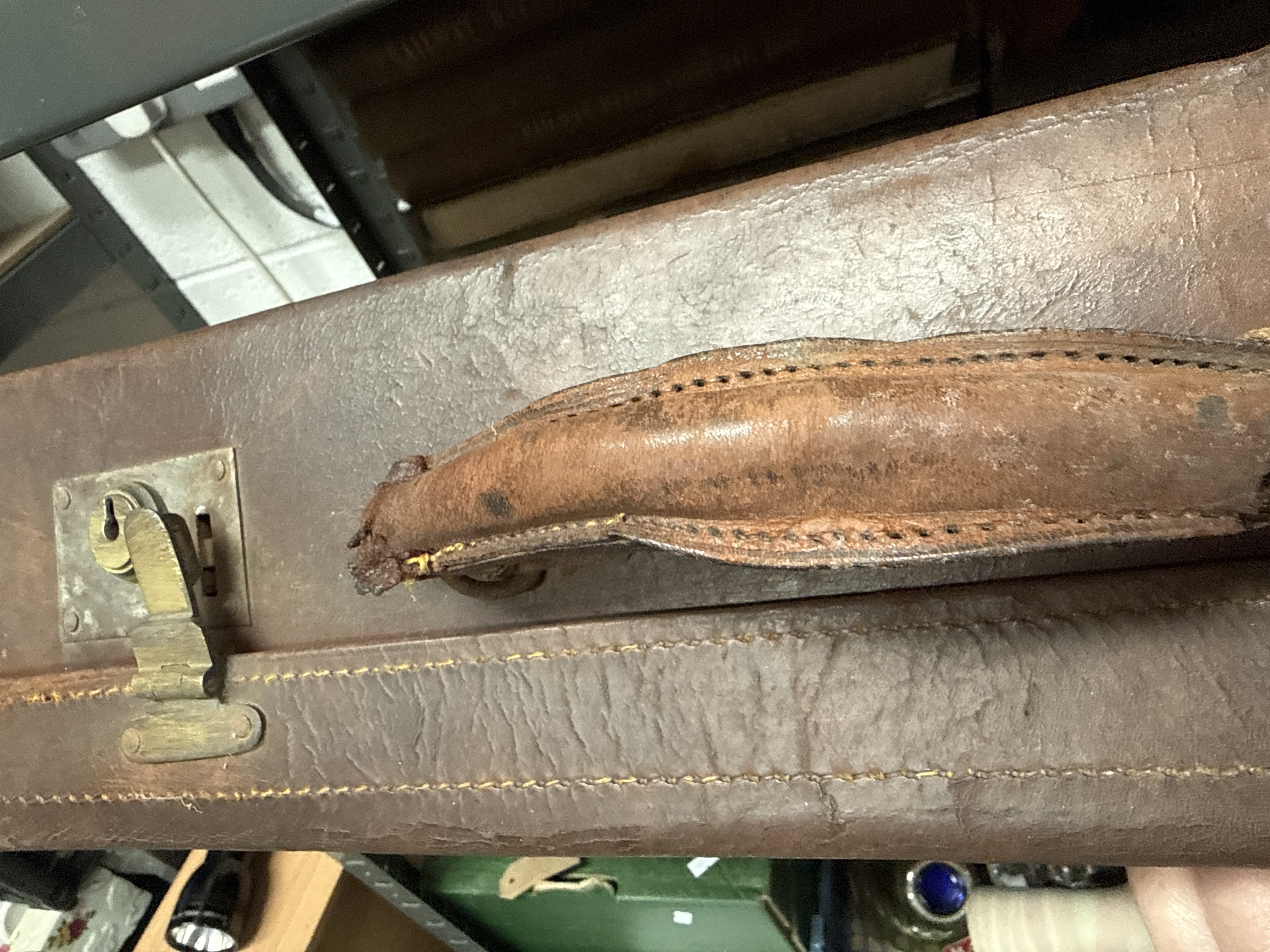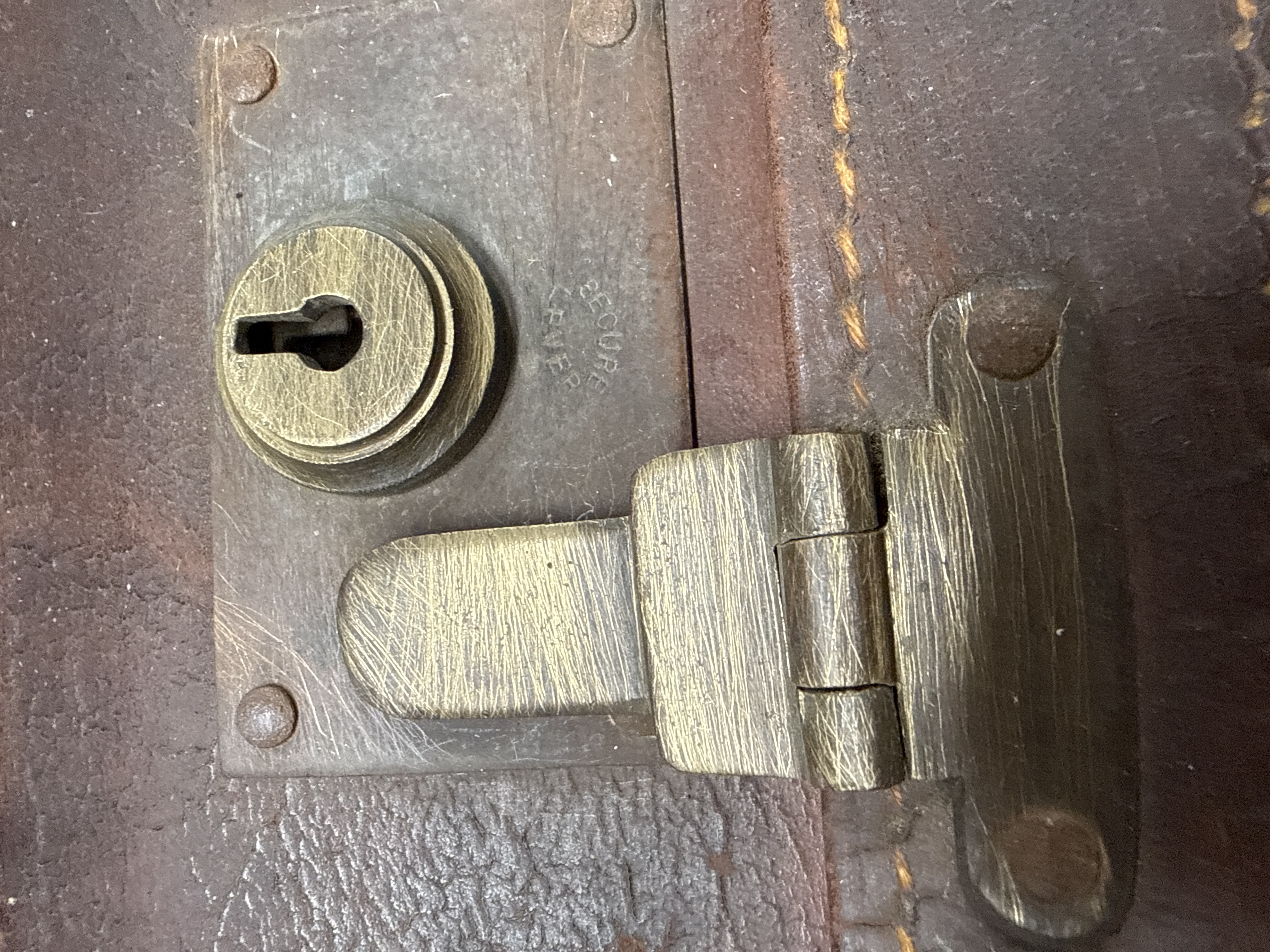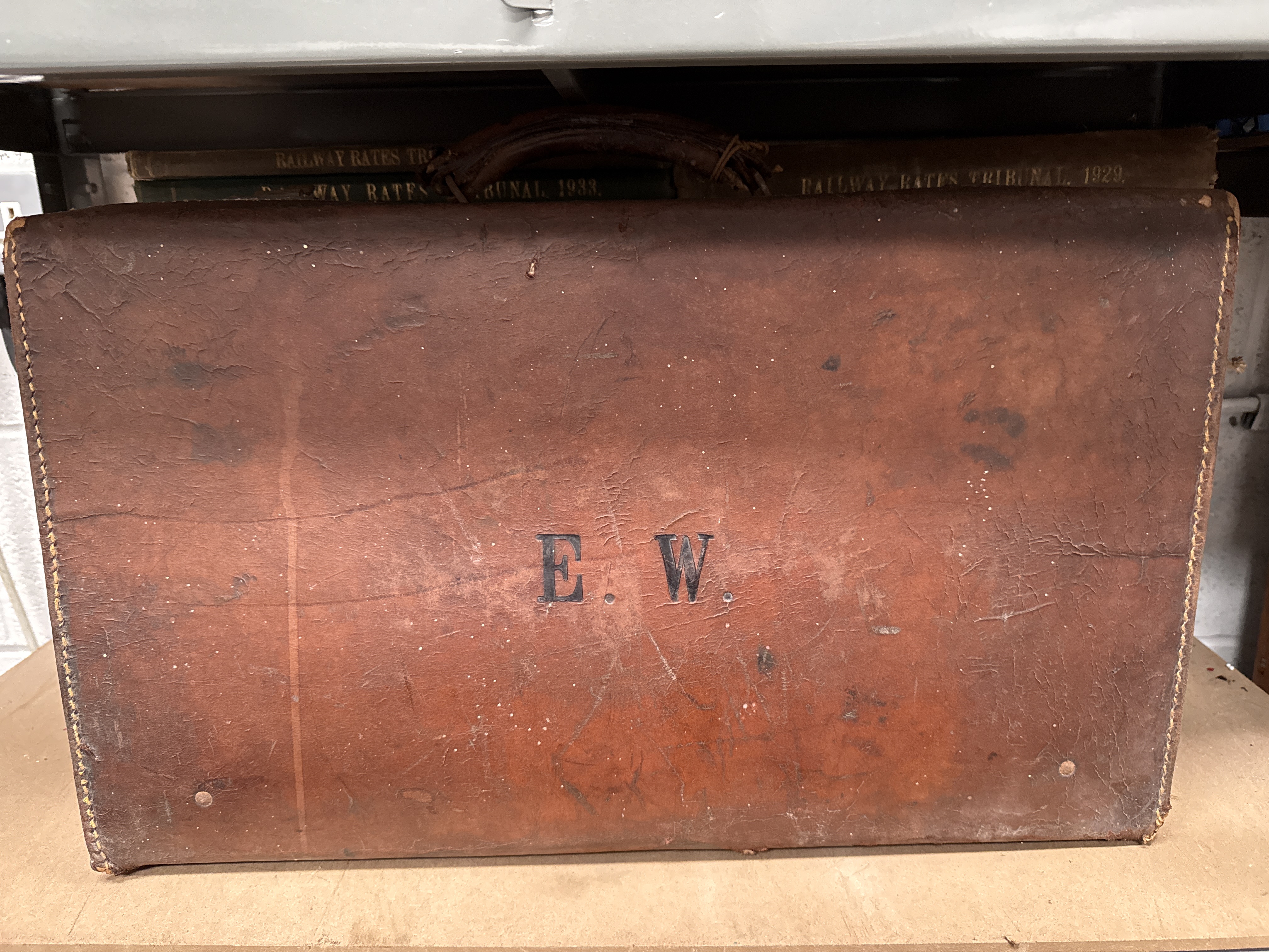 A vintage brown leather suitcase of rectangular form, constructed from stitched leather panels. The front face features the centrally placed initials E. W. in black. The piece is fitted with a single leather-wrapped handle and is secured by two metal flip locks. A detail of the lock plate reveals the stamped letters SECURE above LEVER arranged in a semi-circle. The suitcase is shown in proximity to volumes of the Railway Rates Tribunal dating from 1929 and 1933, suggesting a period of use in the early to mid-20th century.