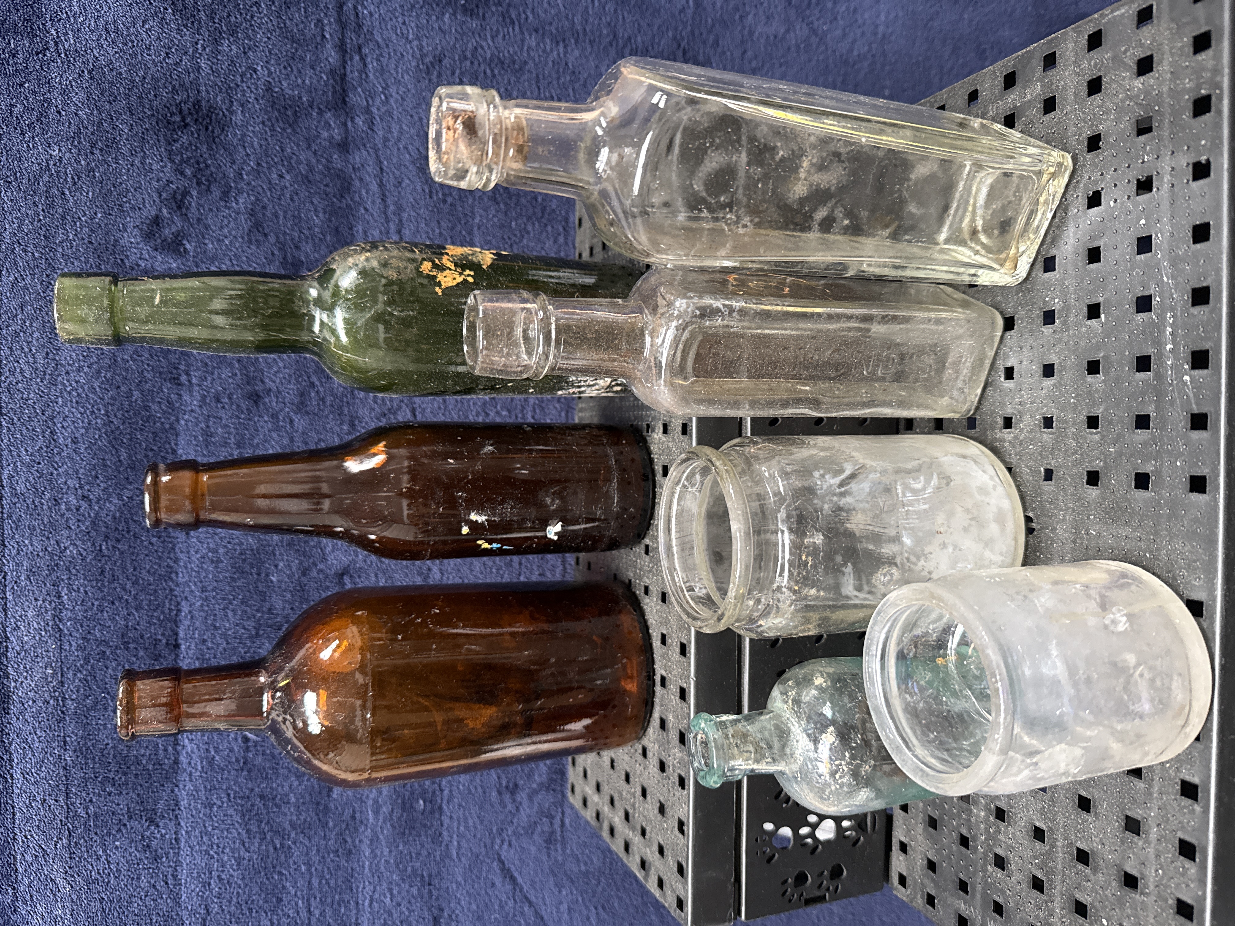 A collection of eight antique and vintage glass bottles and jars of various forms and colours, representative of late 19th to early 20th-century British commercial and domestic use. The group includes two rectangular clear glass bottles, one of which features chamfered corners and embossed lettering for Symonds, likely Symonds and Co. aerated water manufacturers. Also included are two wide-mouthed cylindrical clear glass jars, a dark green cylindrical bottle with a tapering neck, two dark amber or brown glass bottles with sloping shoulders, and a small light aqua-coloured medicinal bottle with a rounded body. The items are primarily mould-blown with tooled or applied finishes, showing visible mould seams on the bodies and necks. One bottle retains an original cork.