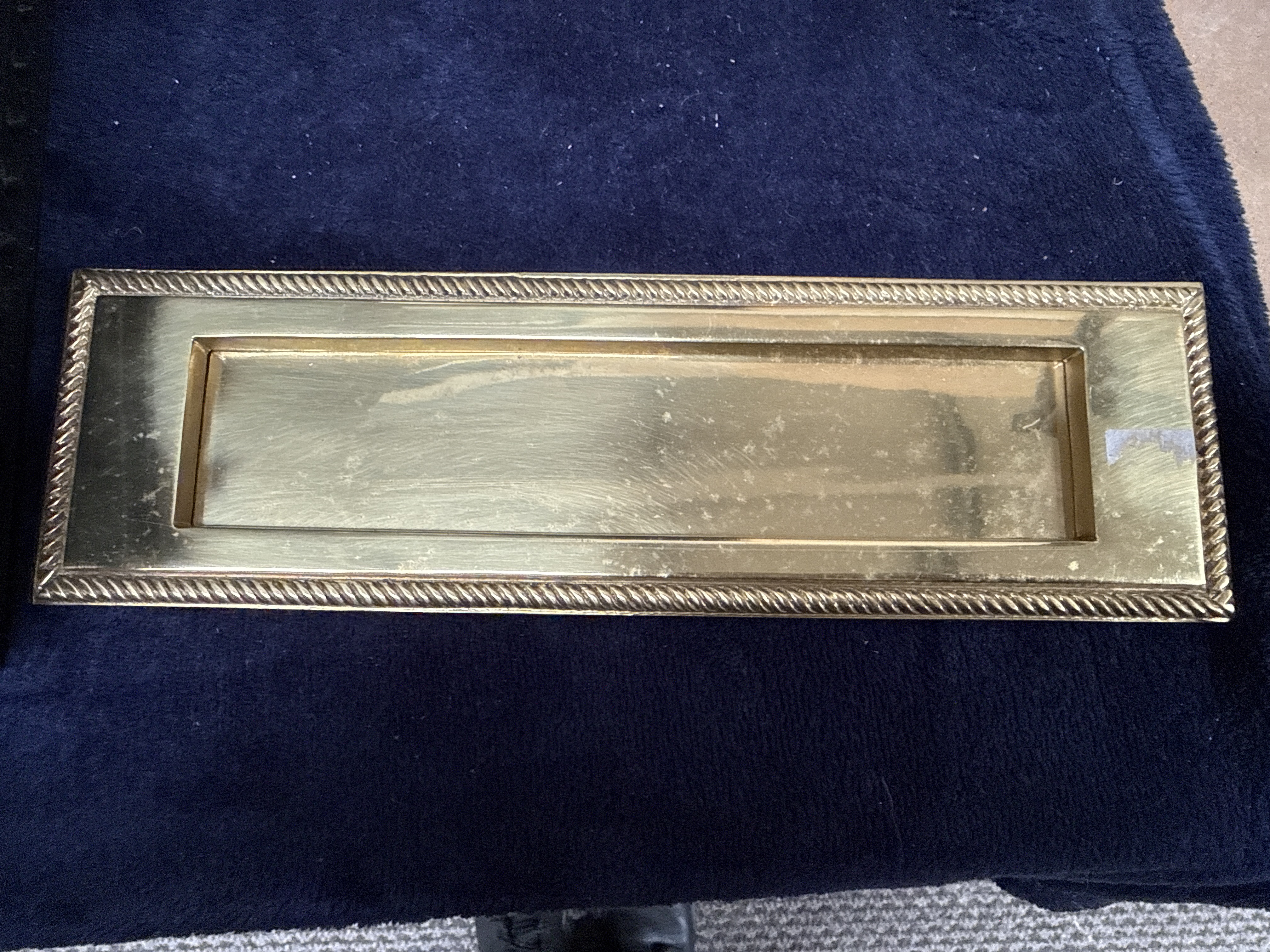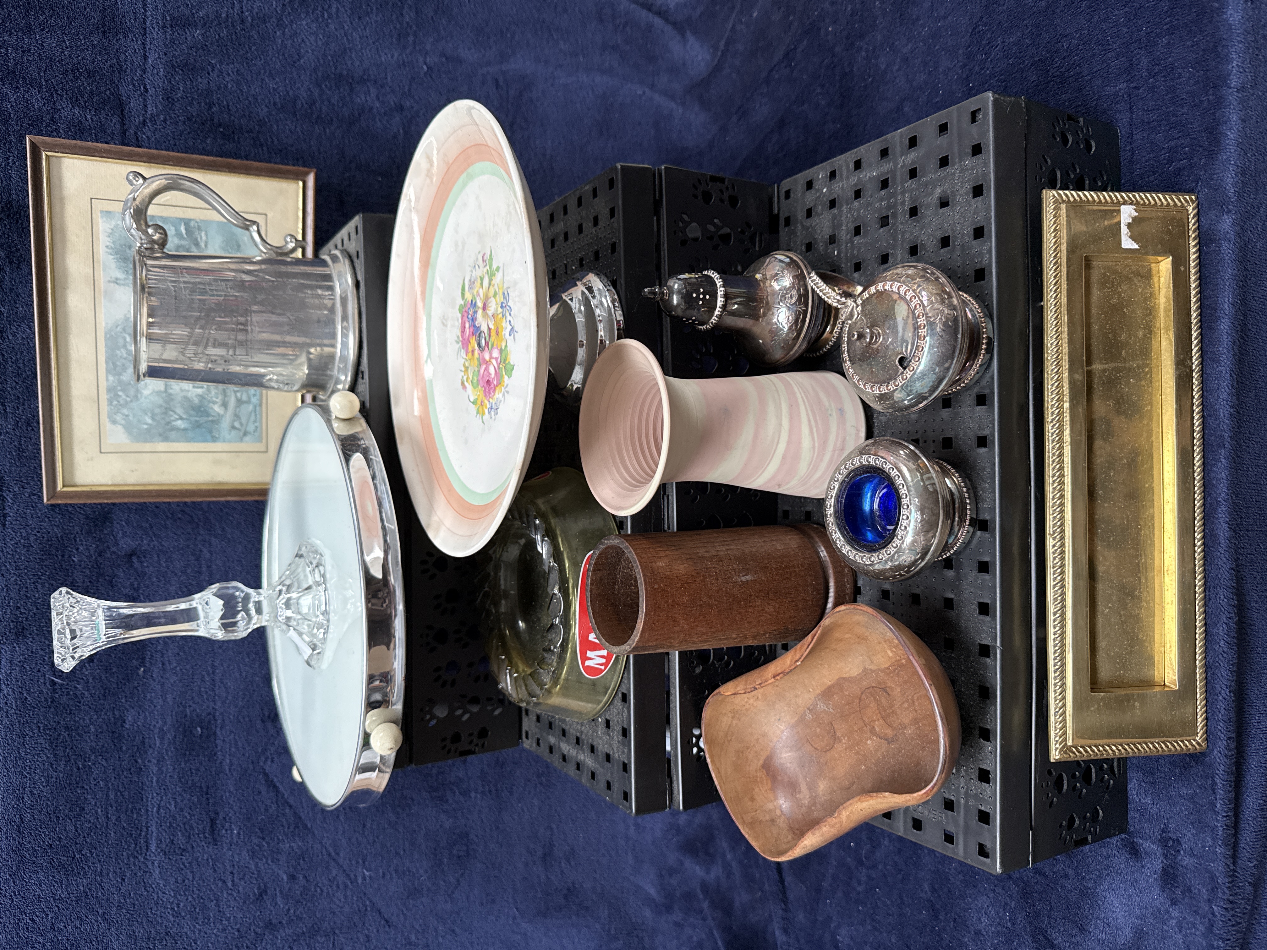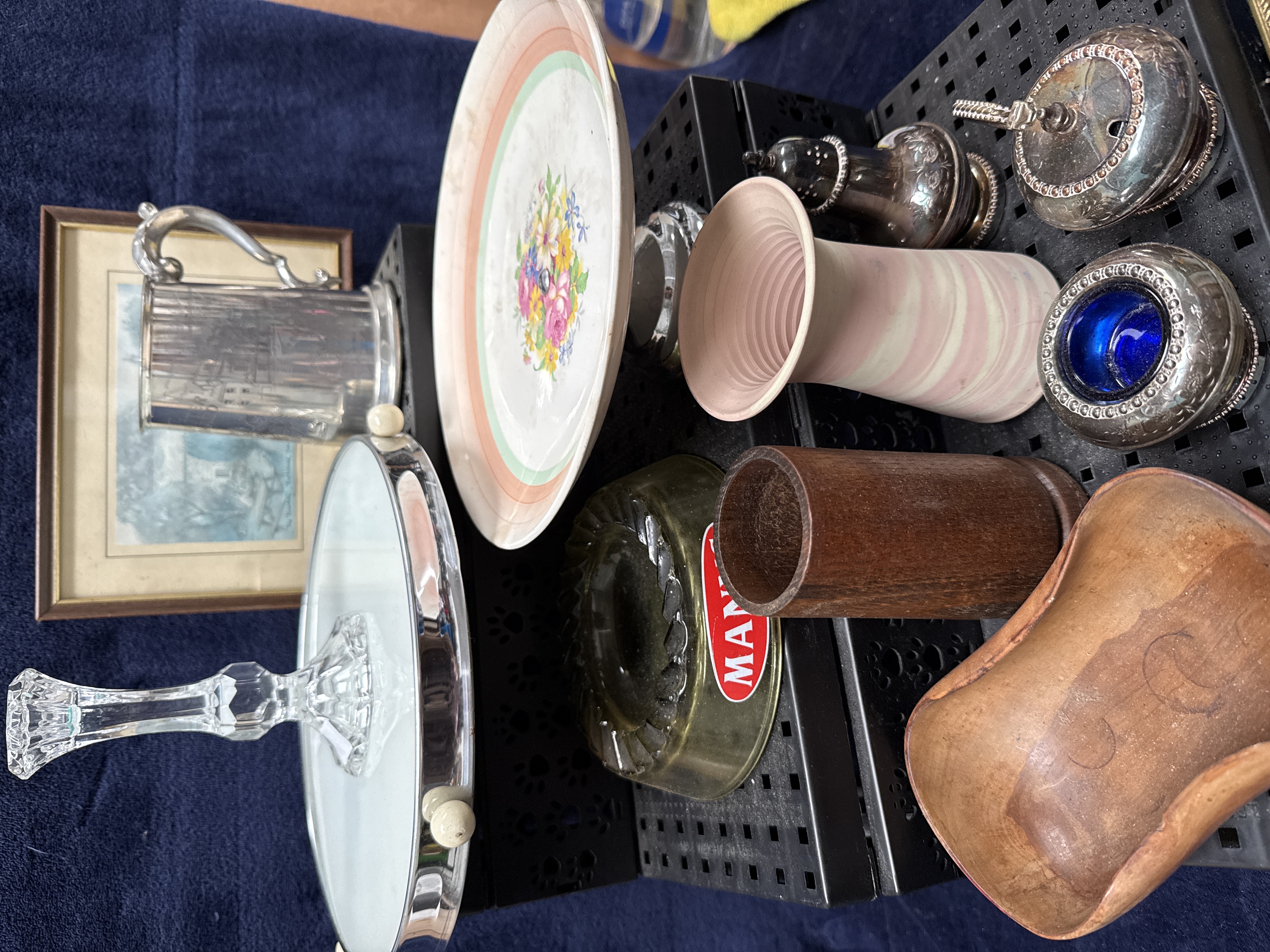 An assortment of decorative objects, silver-plated ware, and ceramics. The collection includes a silver-plated tankard with a scrolled handle, a three-footed silver-plated tray with an inset glass base, a salt shaker, a sugar sifter, and an open salt with a cobalt blue glass liner. Glassware comprises a faceted candlestick and a green glass ashtray bearing a red label for Martini. Ceramic items include a plate decorated with a central floral spray and polychrome borders, and a pink and white marbled unglazed vase. The lot also contains a turned wooden cylinder, a small carved wooden bowl, a brass letterbox plate with a rope-twist border, and a small framed landscape print.