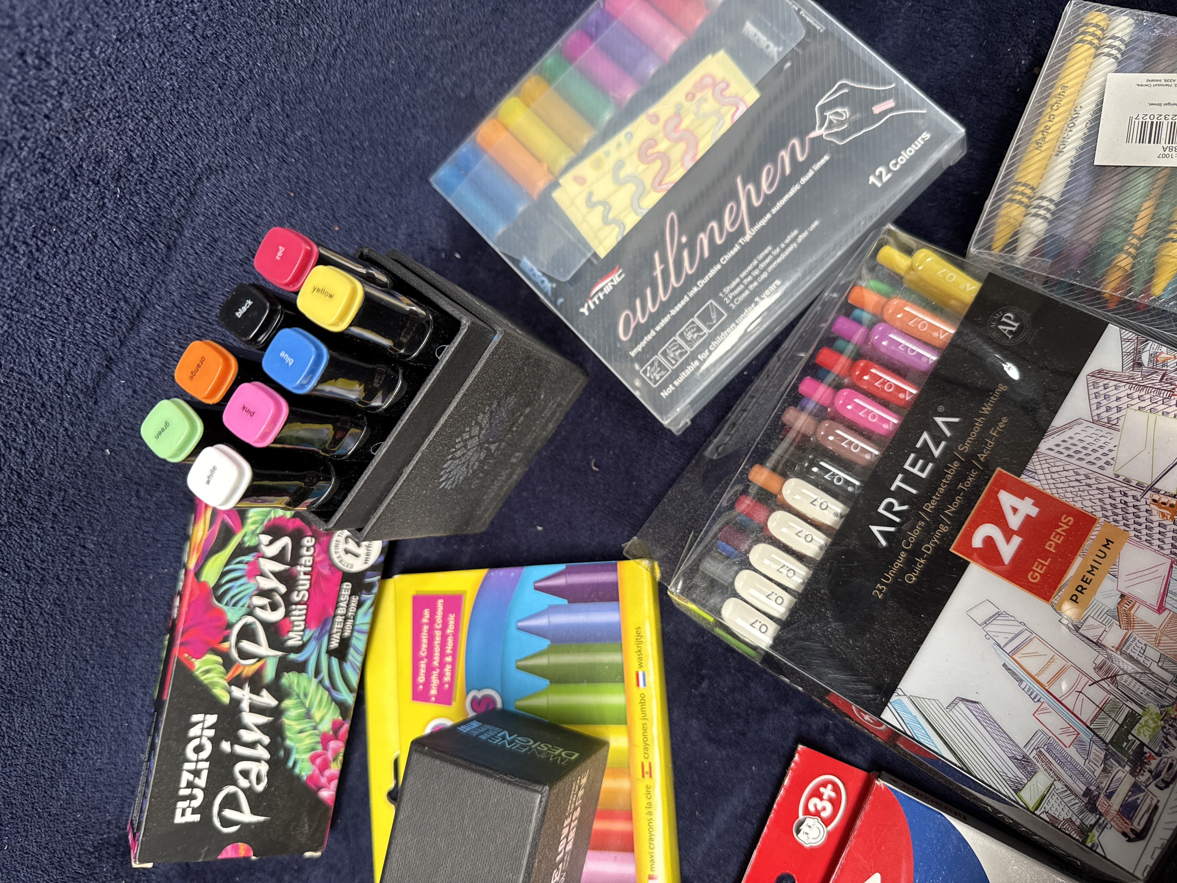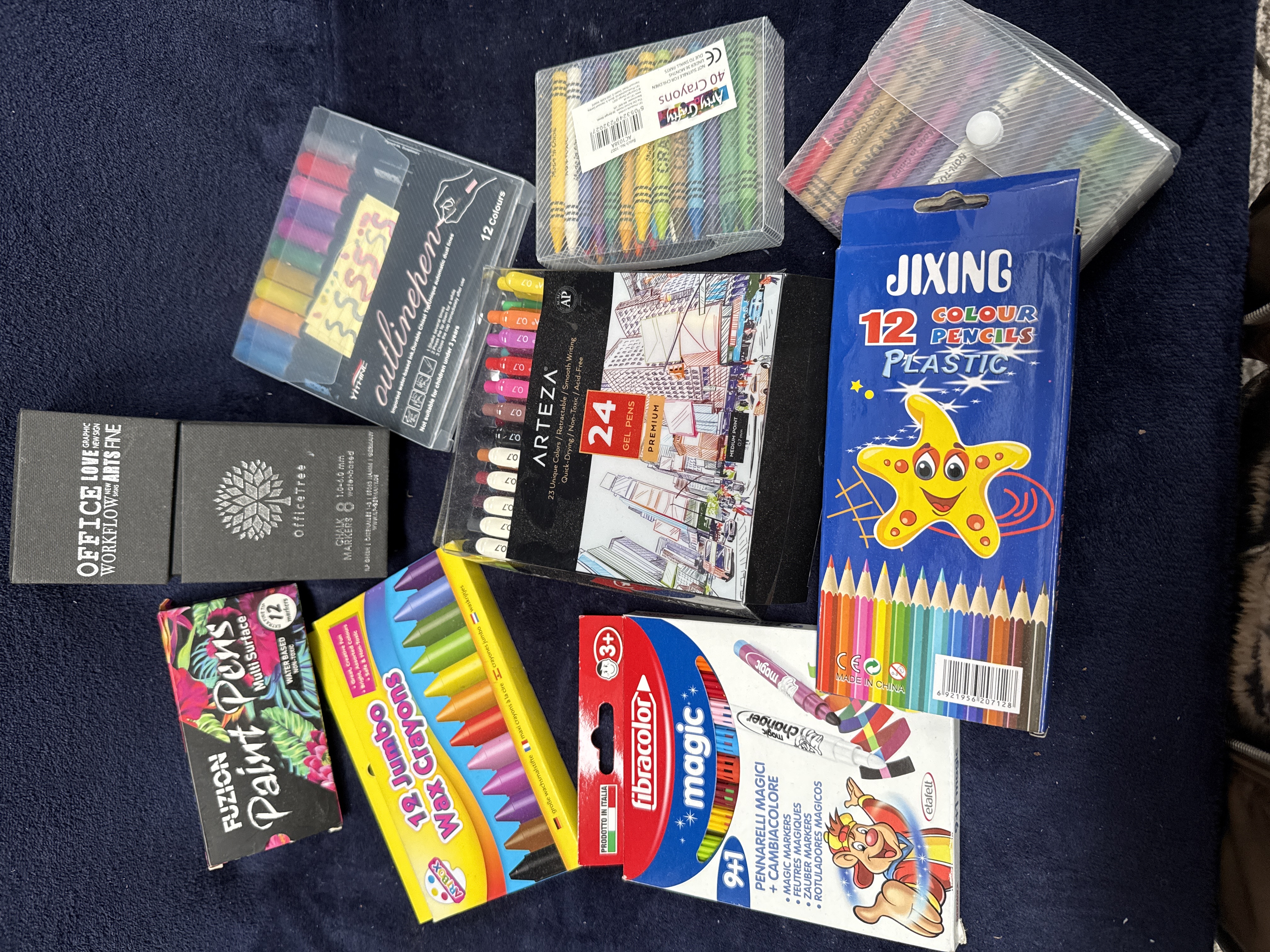 An assortment of stationery and art supplies comprising various sets of pens, markers, and crayons. The collection includes a box of 24 gel pens bearing the mark of Arteza, a pack of 12 plastic colour pencils bearing the mark of Jixing, and a set of 10 markers (9+1) bearing the mark of Fibracolor. The lot also contains a box of paint pens bearing the mark of Fuzion, a box of 12 jumbo wax crayons bearing the mark of Artbox, and a pack of 8 water-based chalk markers bearing the mark of OfficeTree. Additional sets include 12 outline pens in a clear case bearing the mark of YITHINC, a bulk pack of 40 crayons bearing the mark of Arty Crafty (barcode 5053249232027), and an open box of dual-tip markers bearing the marks of Office Love and Workflow Arts Fine. The items are housed in a mixture of original retail packaging, clear plastic cases, and pouches.
