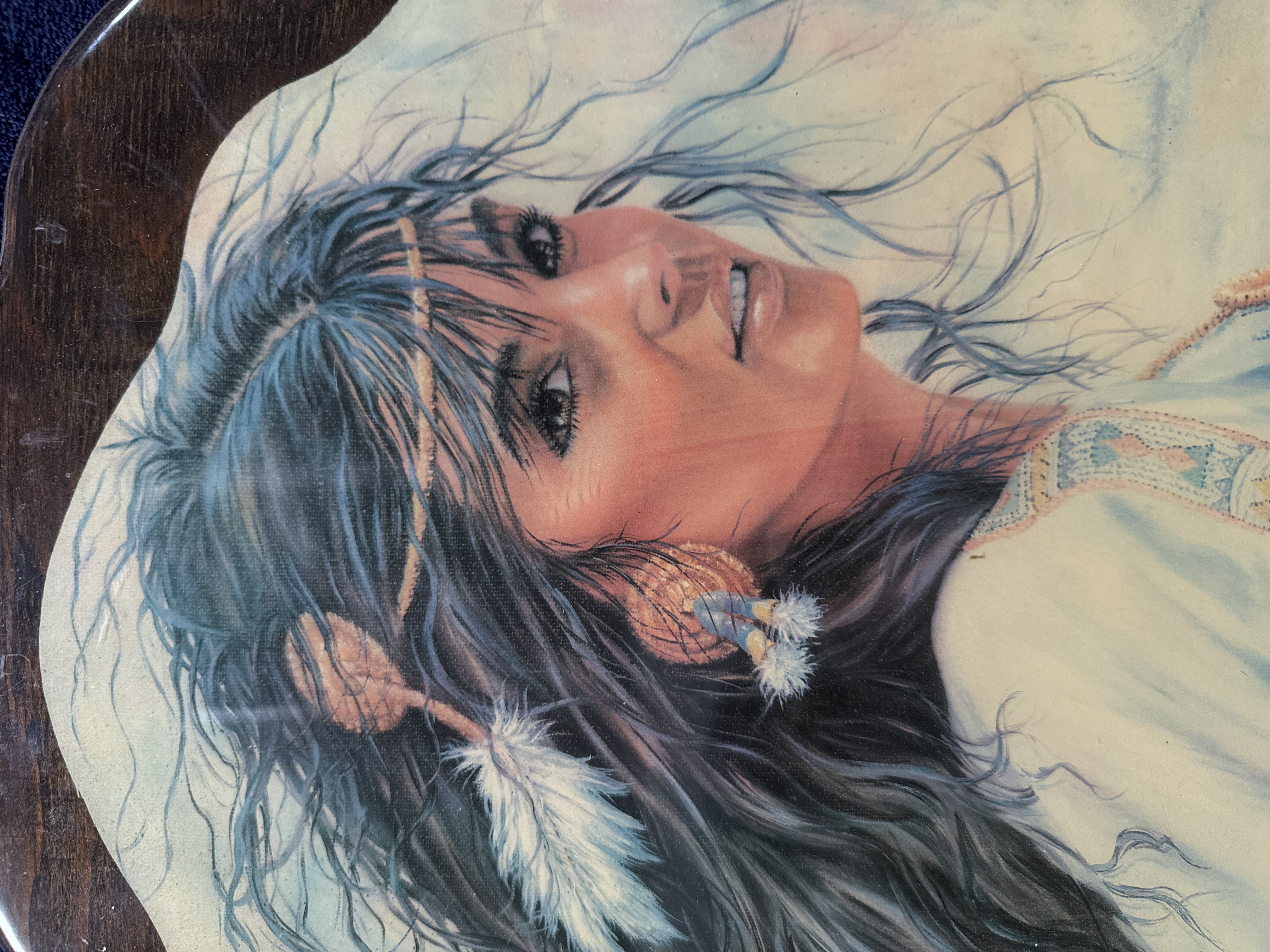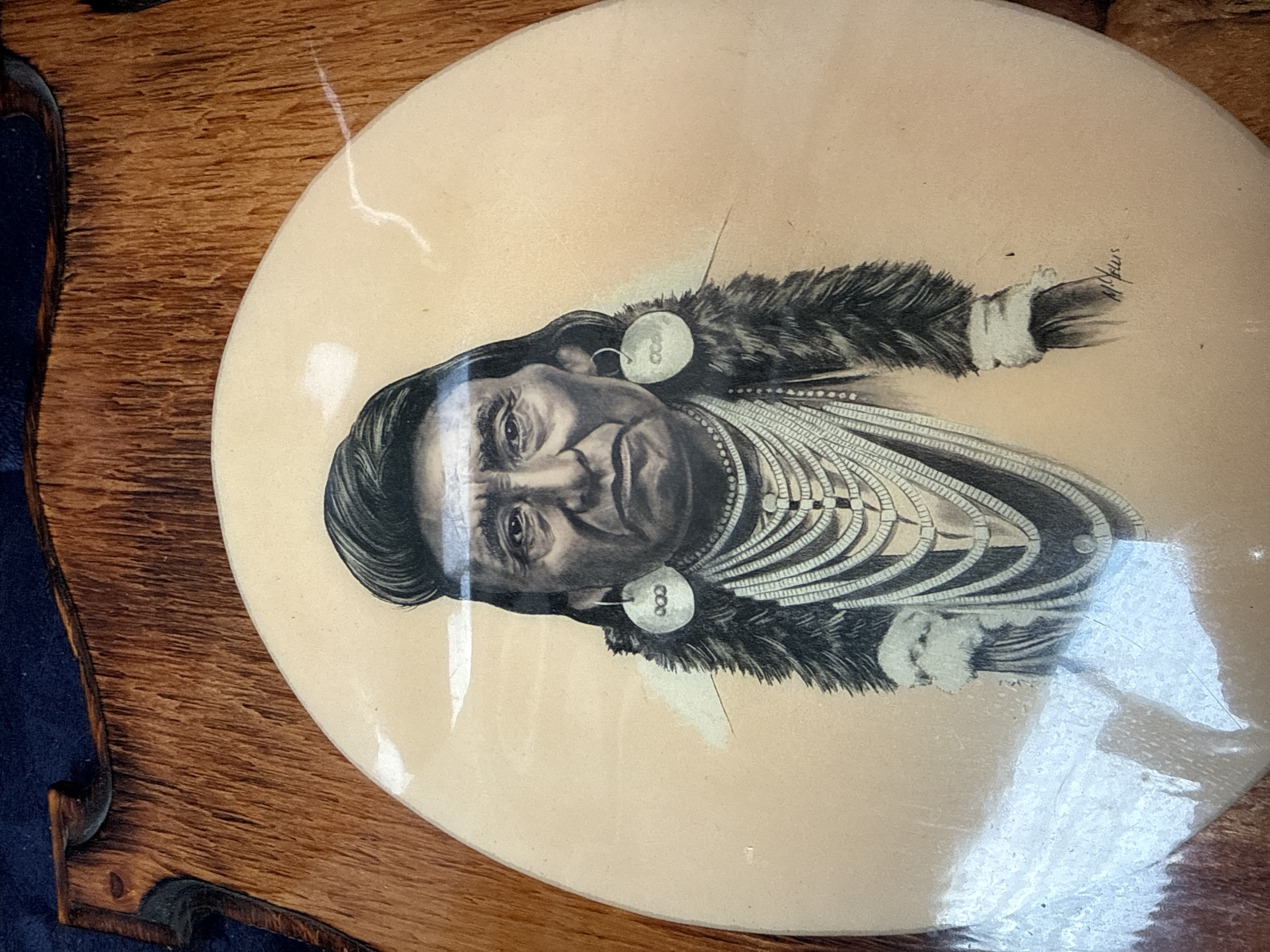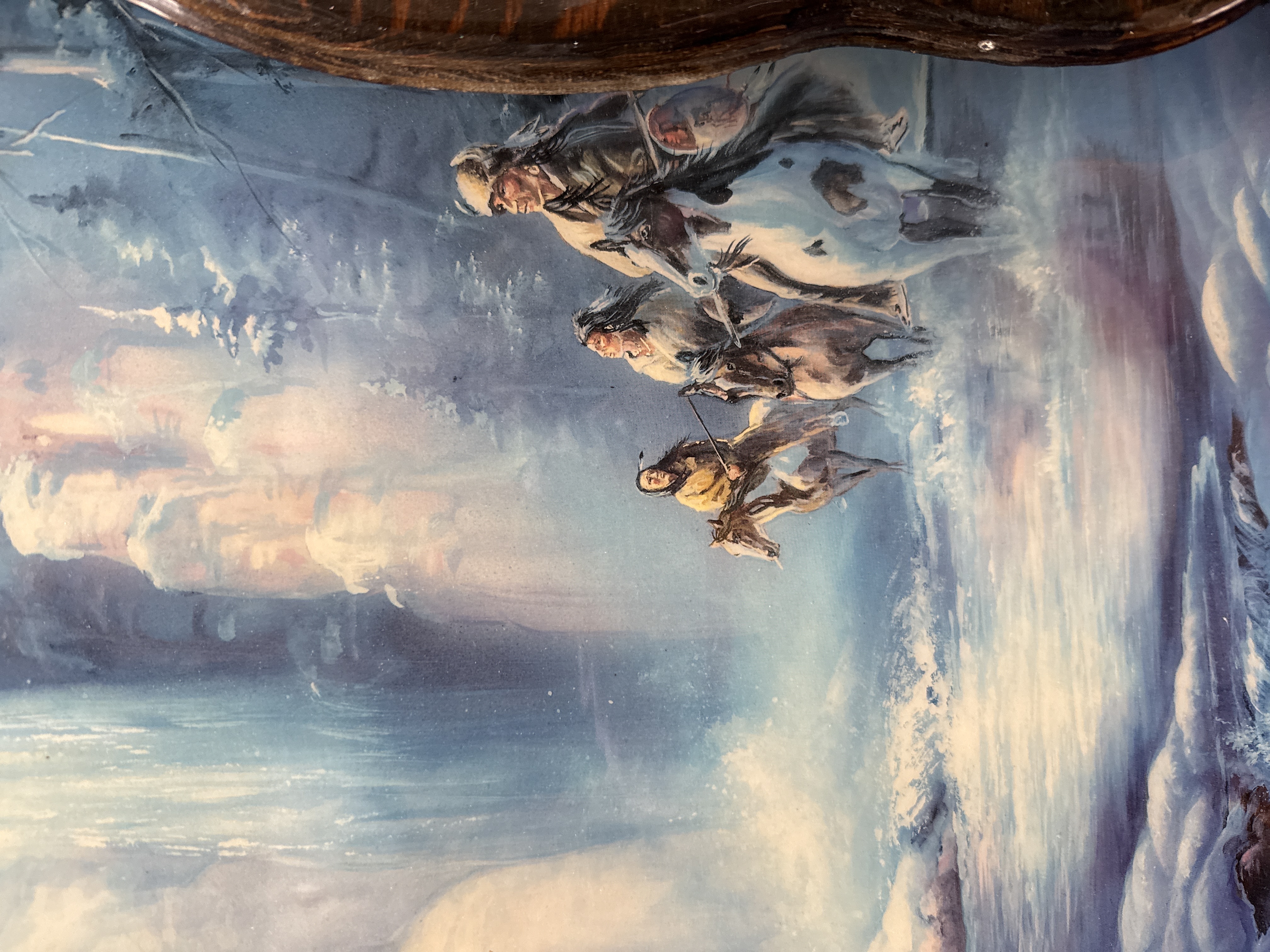A trio of decorative wall plaques comprising shaped and scalloped wooden boards with applied printed illustrations under a thick, high-gloss lacquer finish. The collection features Indigenous American-themed imagery, including a portrait of a woman with feathers in her hair, an oval portrait of a man in traditional dress, and a winter scene depicting figures on horseback in a snowy landscape. The oval portrait bears the printed signature M. Ellis in the upper right. These items are characteristic of decorative wood art produced during the 1970s, often associated with the Wisconsin Dells region.