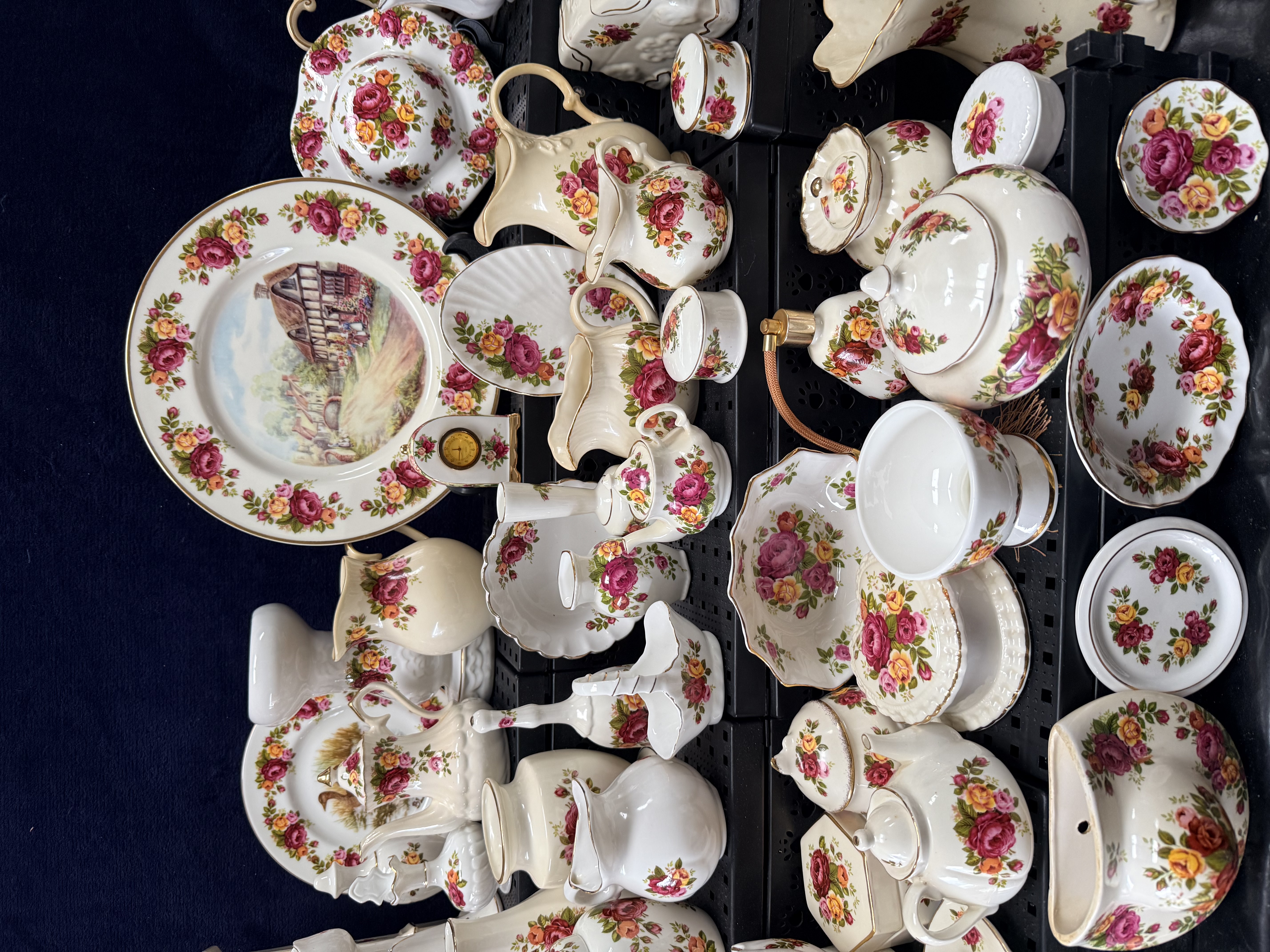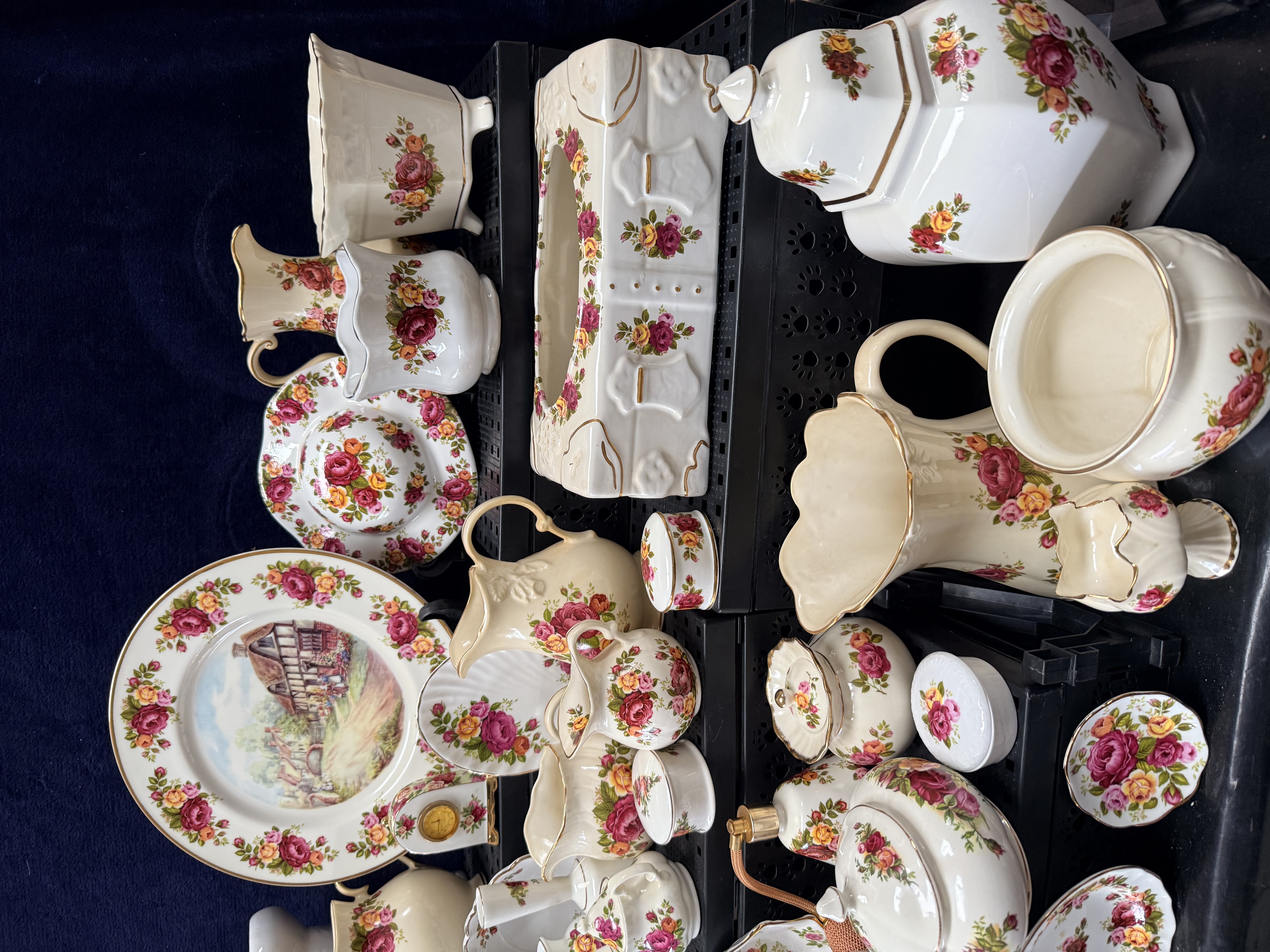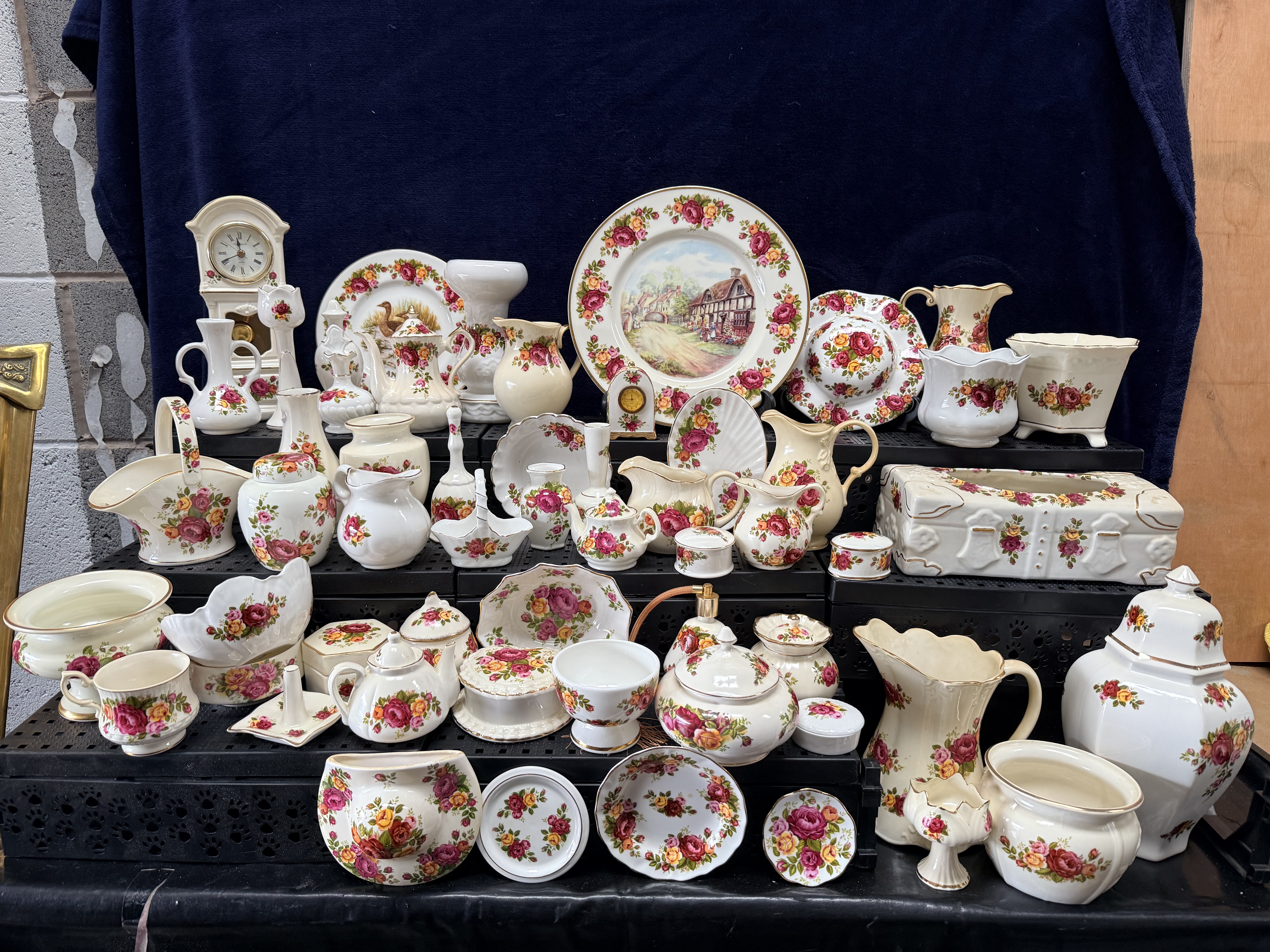 A collection of fine bone china table and giftware. The pieces feature a transfer-printed pattern of deep red, pink, and yellow roses with green foliage. Most items are finished with a characteristic sponged or brushed gold gilt rim on scalloped edges. The lot comprises a wide variety of functional and decorative forms, including a large mantel clock with a white dial and Roman numerals, a rectangular tissue box cover, and multiple lidded teapots and a coffee pot. Also included are various jugs and pitchers of graduating sizes, including creamers and large water jugs. One large decorative wall plate features a central polychrome pastoral scene depicting a traditional English half-timbered cottage. The assortment is further composed of small giftware including lidded trinket boxes, miniature vases, a small basket, an egg cup, a pedestal bowl, and various tea-related items such as teacups and saucers.