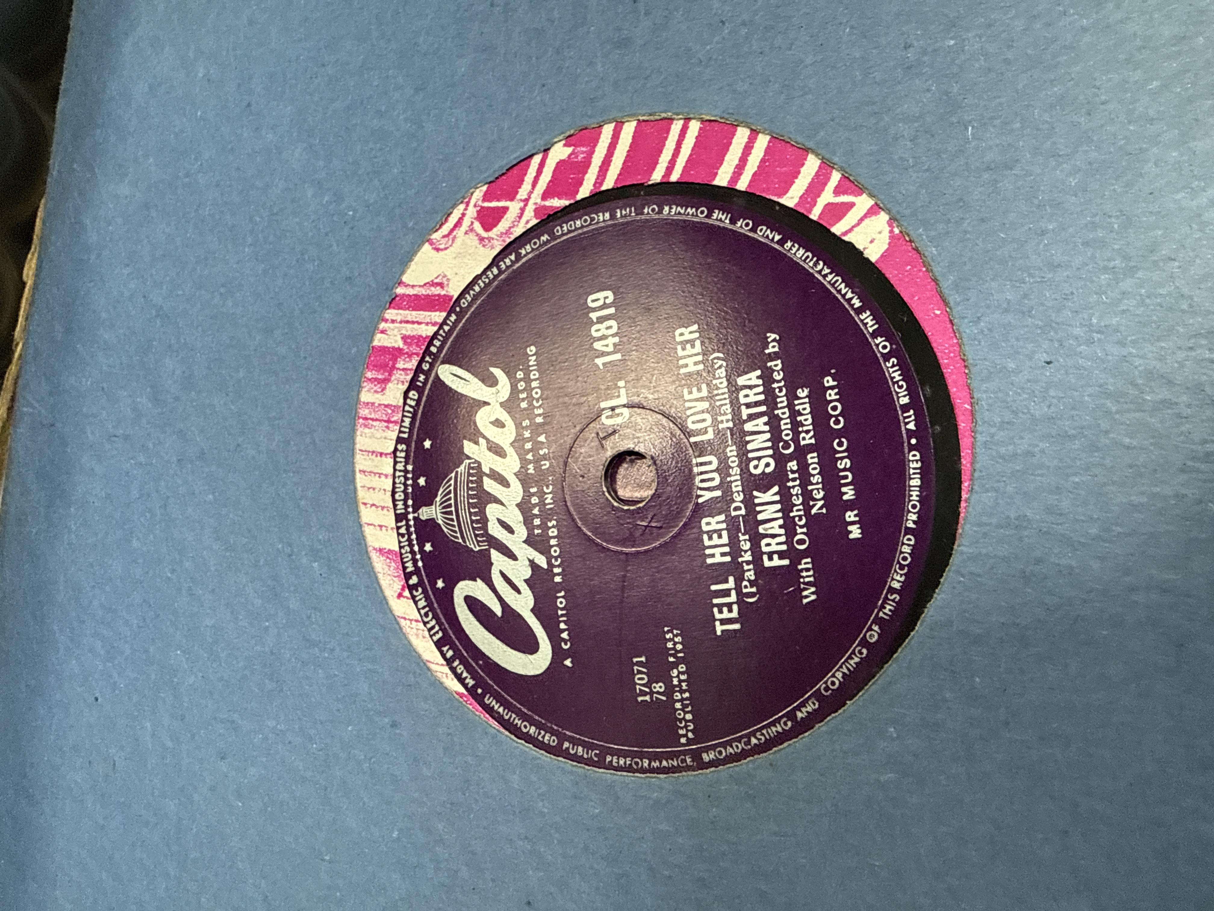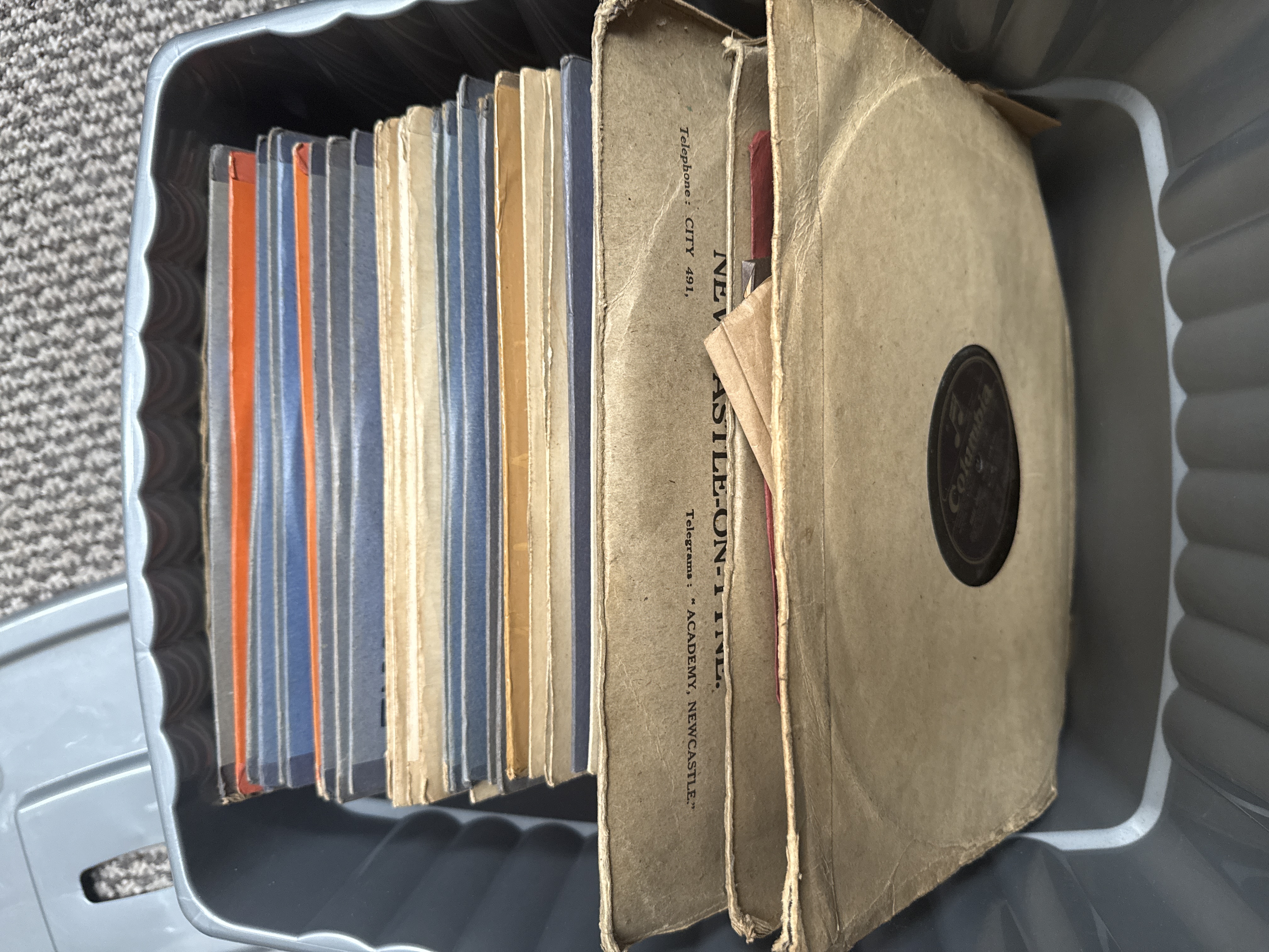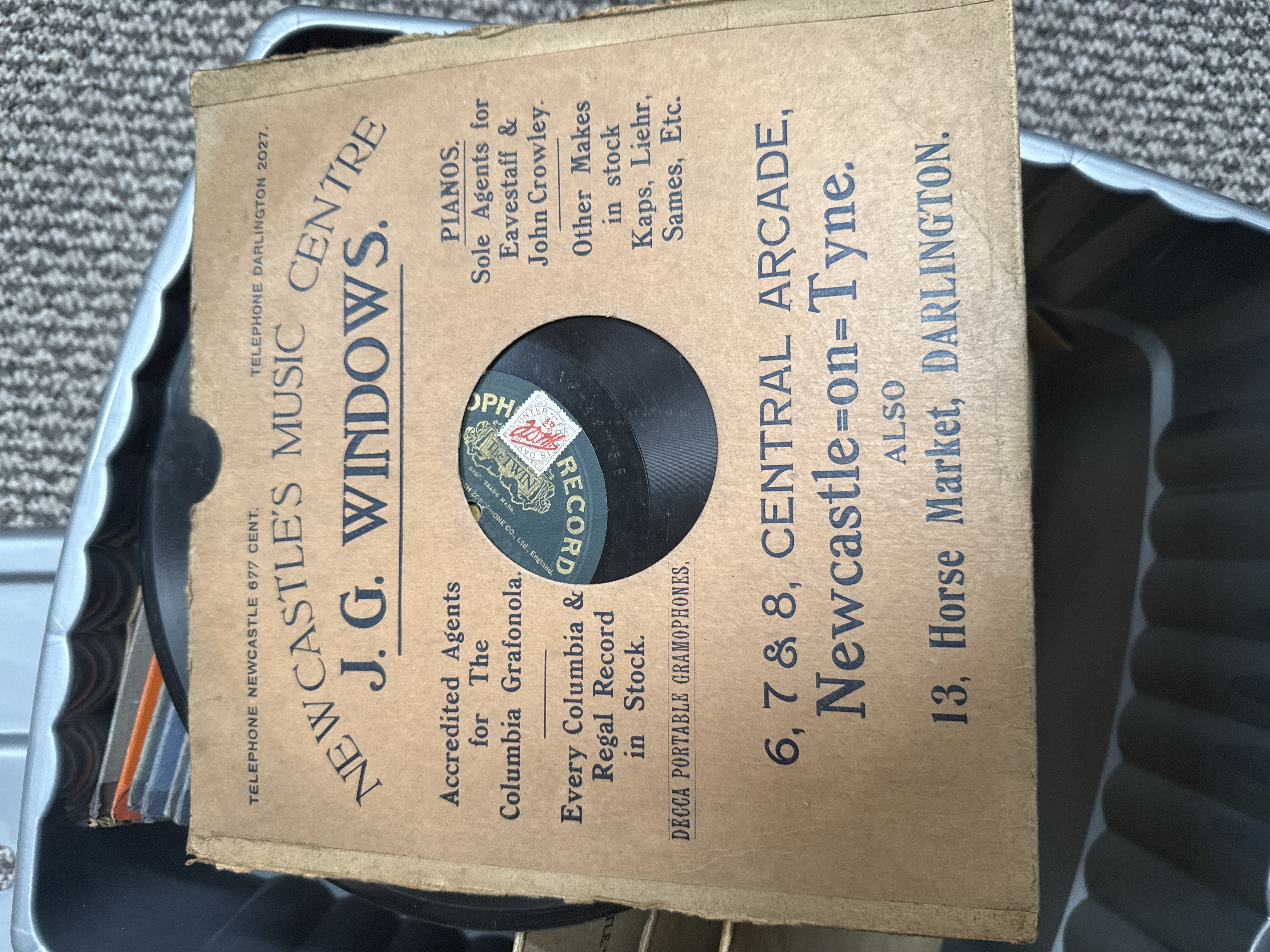A substantial collection of shellac 78 rpm gramophone records dating from the mid-20th century. The assortment includes a variety of artists and record labels. Notable items identified include a Frank Sinatra recording of Tell Her You Love Her (Parker-Denison-Halliday) with orchestra conducted by Nelson Riddle on a purple Capitol label, catalogue number CL. 14819, manufactured by Electric and Musical Industries Limited in Great Britain and dated 1957. Also present is a record on The Twin Record label, manufactured by the British Zonophone Company Limited, England, and several records bearing Columbia labels. A significant portion of the collection is housed in original paper retailer sleeves from J.G. Windows, Newcastle’s Music Centre, with addresses at 6, 7 and 8 Central Arcade, Newcastle-on-Tyne, and 13 Horse Market, Darlington. These sleeves feature period advertising for Eavestaff and John Crowley pianos and Decca portable gramophones, indicating a strong provenance from the North East of England. The collection is contained within a grey plastic storage tub with a lid.