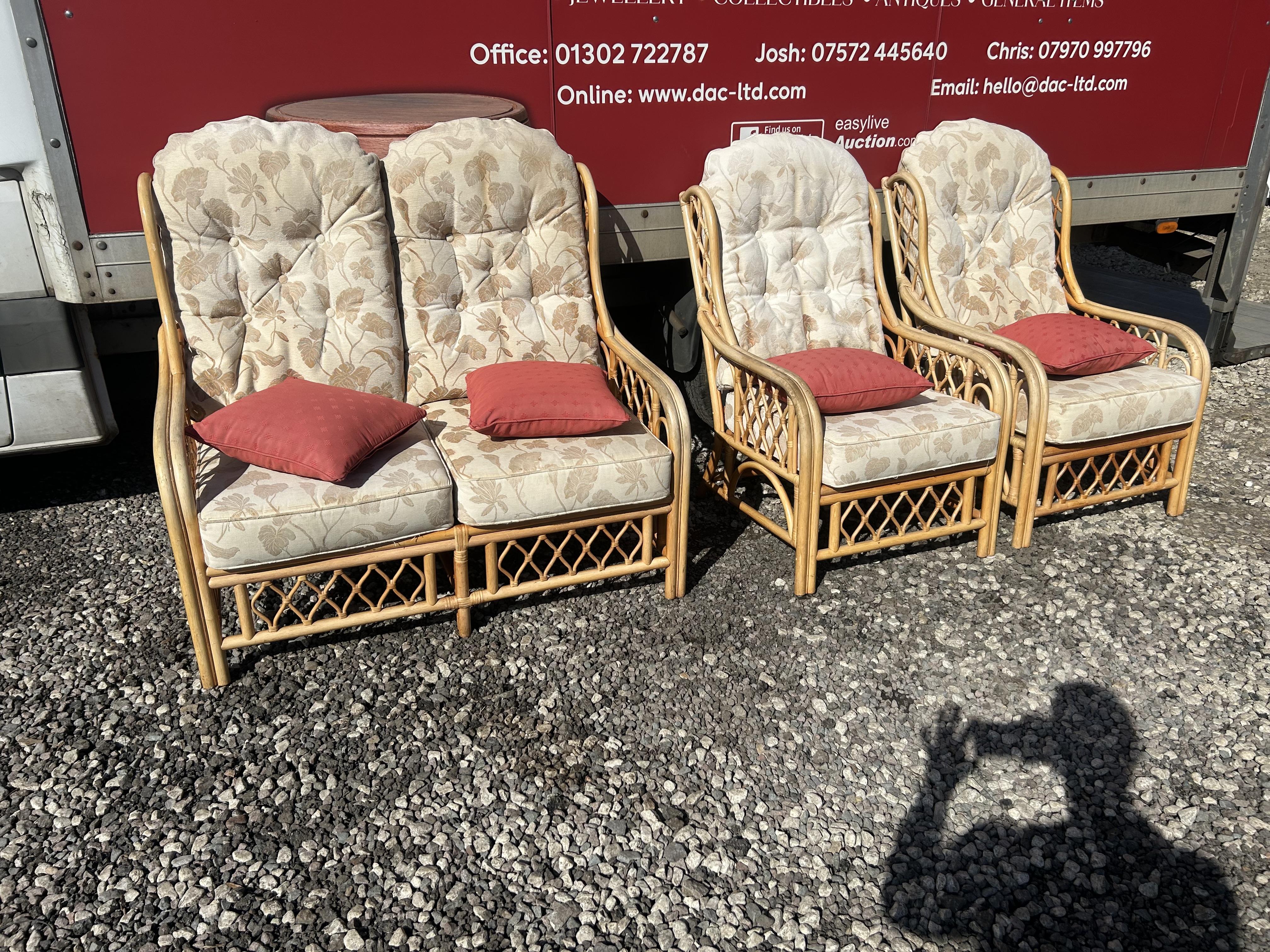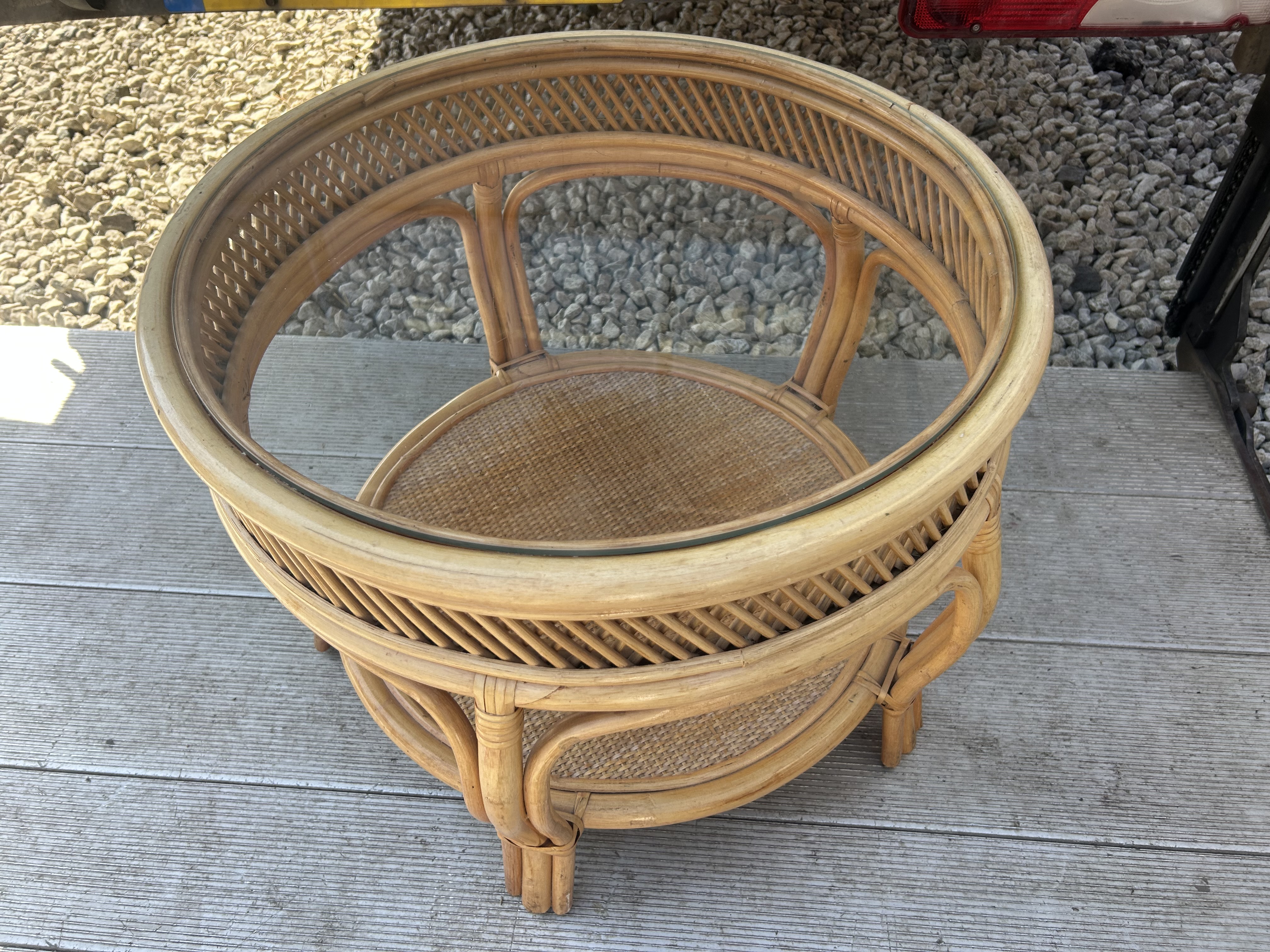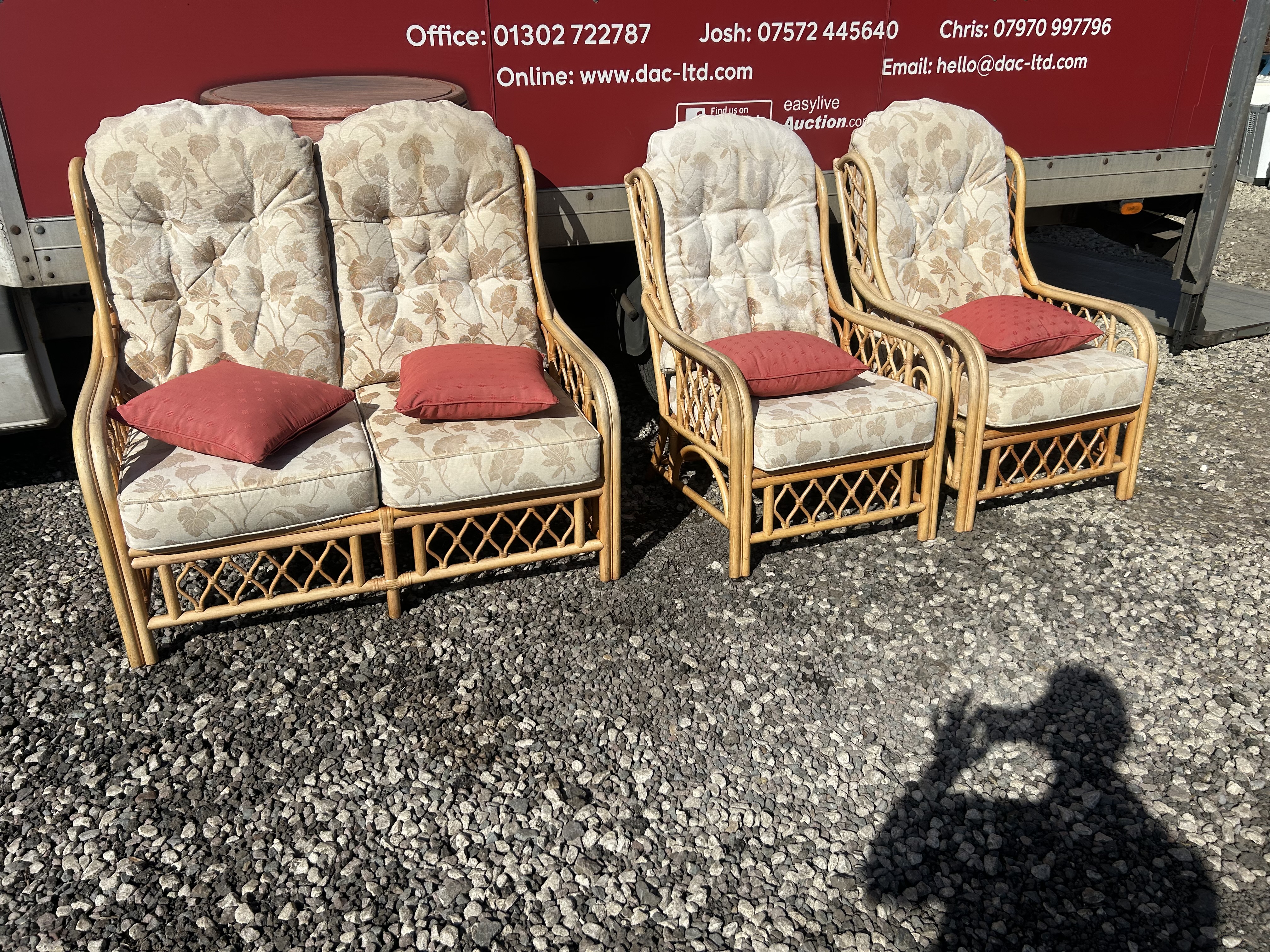 A conservatory furniture suite of late 20th-century design, comprising a two-seater sofa, two armchairs, and a matching coffee table. The frames are constructed from bentwood rattan and cane, featuring decorative diamond lattice-work wicker panelling to the sides and lower sections. The circular tiered coffee table features a glass top inset into a rattan frame over a woven cane lower shelf. The seating is fitted with removable high-back, button-tufted cushions and thick seat cushions upholstered in a cream-coloured fabric with a neutral floral leaf pattern. The suite is accompanied by four contrasting red scatter cushions. No maker’s marks are visible on the frames or upholstery.