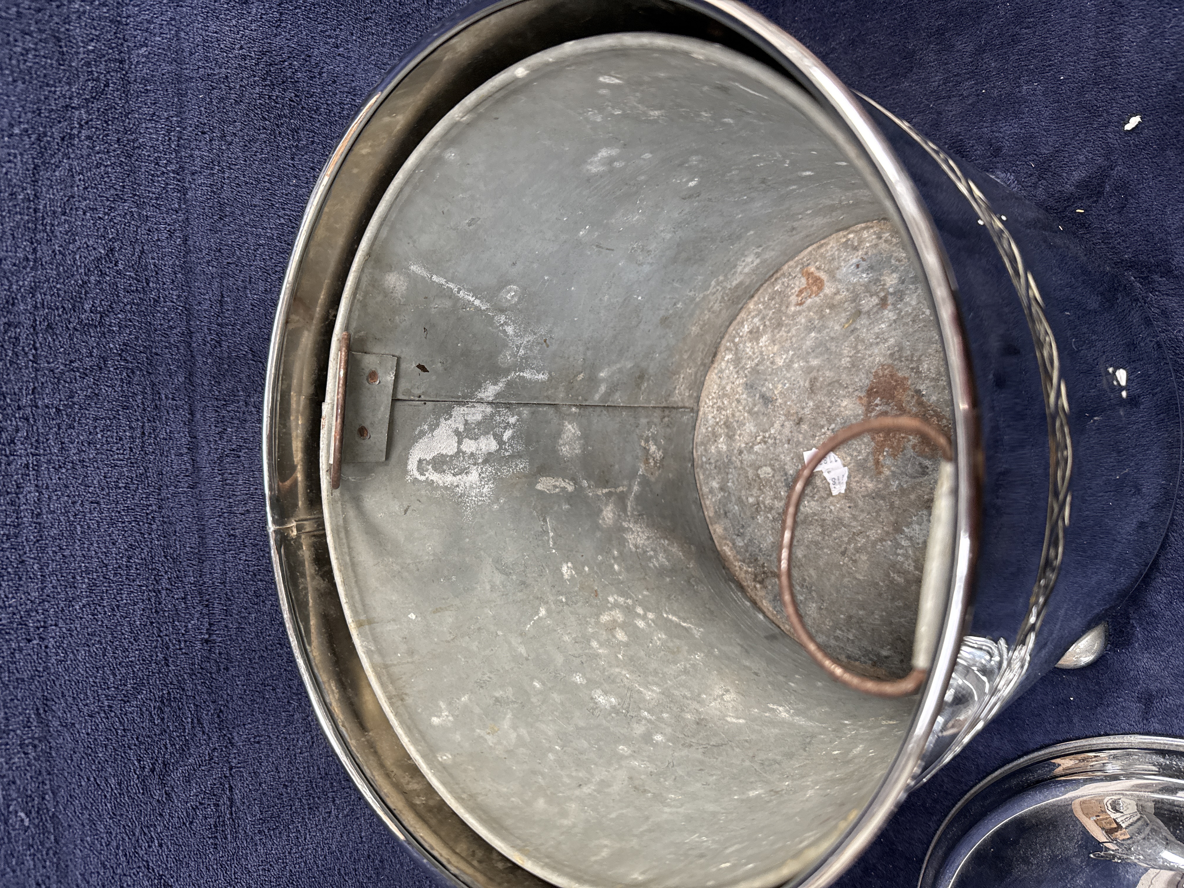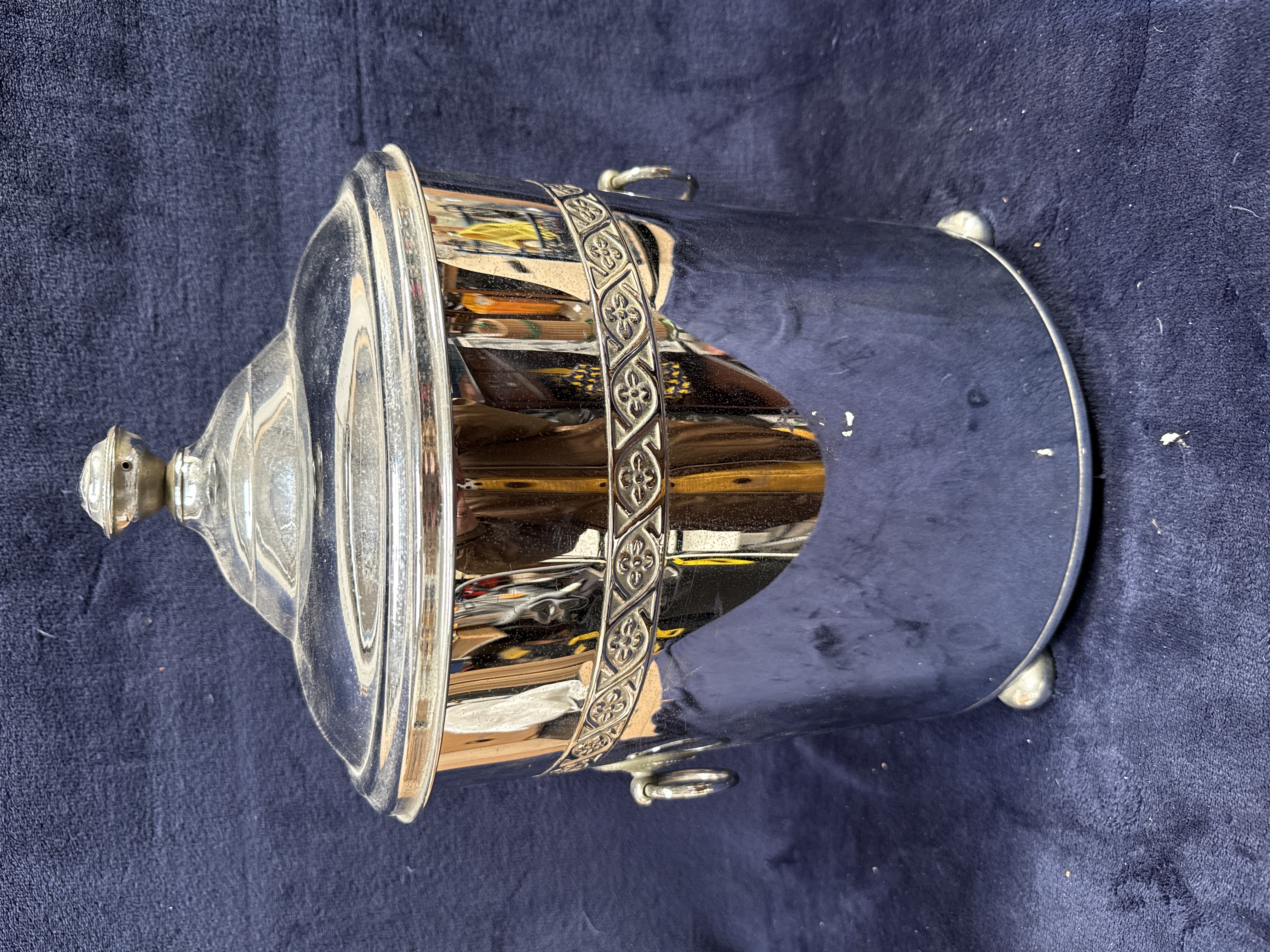 A chrome-plated bucket of cylindrical form, manufactured in England. The exterior body features a decorative horizontal band near the rim with a repeating pattern of stylized floral motifs within a geometric, interlocking frame. The vessel is raised on three small ball feet and is equipped with two circular drop handles on either side. It is topped with a tiered, domed lid finished with a simple round finial. The interior contains a removable galvanized metal liner with a wire swing handle. The base is stamped PLATED and MADE IN ENGLAND, with a maker’s mark likely for I. S. Greenberg and Co (ISG). There are hand-inscribed numbers 26458 and 3/8.