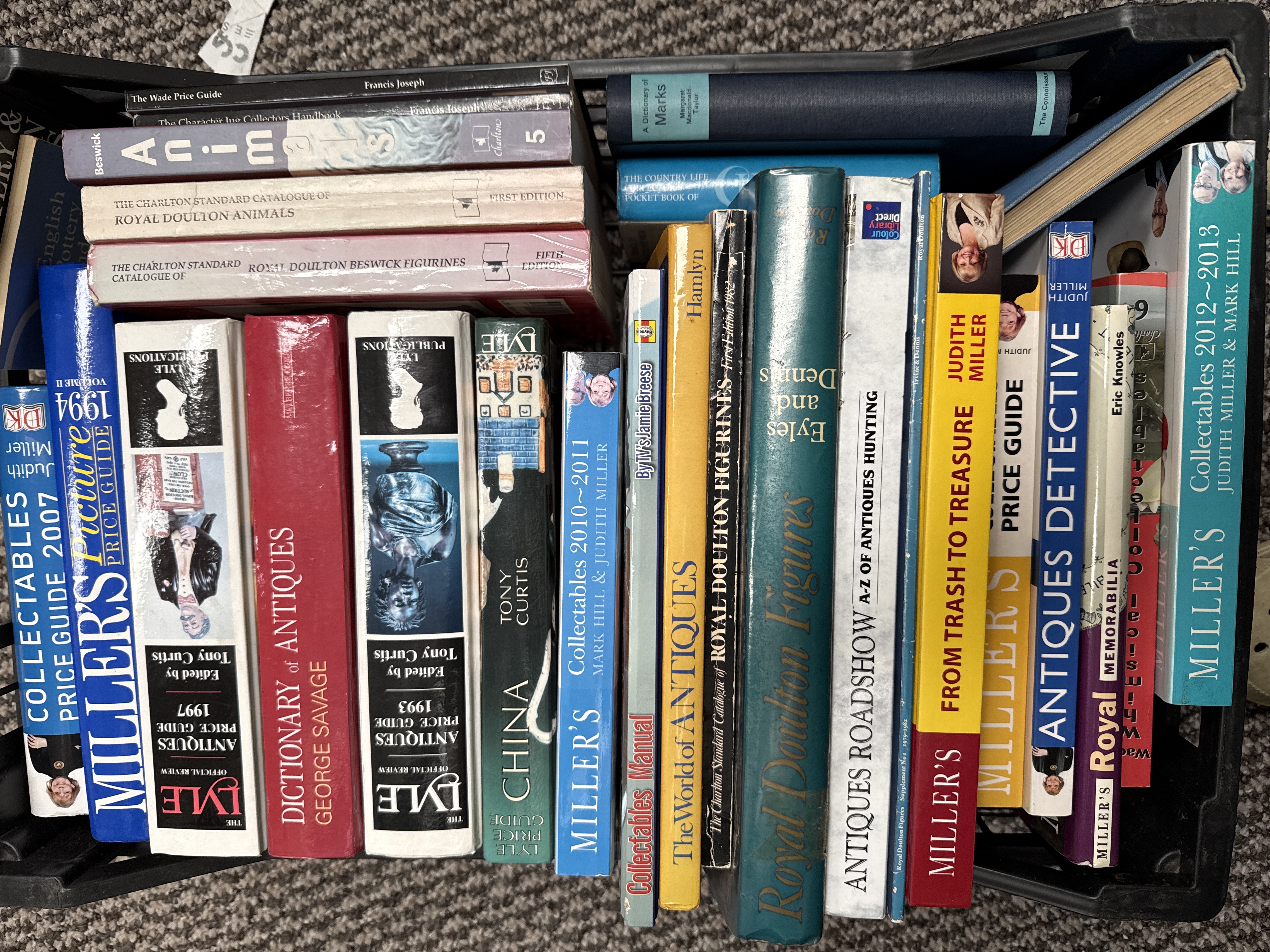 A collection of reference works and price catalogues primarily focused on British ceramics and general antiques. The group includes several volumes from the Miller’s series, such as Collectables Price Guides (2007, 2010-2011, 2012-2013), Miller’s Picture Price Guide 1994, and specialised titles like Royal Memorabilia by Eric Knowles and Antiques Detective by Judith Miller. Specialist ceramic references include The Charlton Standard Catalogue of Royal Doulton Figurines (First Edition, 1982), Royal Doulton Animals (First Edition), and Beswick Animals (Fifth Edition). Also present are Lyle Official Review Antiques Price Guides (1993, 1997) and the Lyle China Price Guide by Tony Curtis. Other notable titles include Royal Doulton Figures by Eyles and Dennis, A Dictionary of Marks by Margaret Macdonald-Taylor, and George Savage’s Dictionary of Antiques. The books are a mix of hardcover and softcover formats, mostly octavo or small quarto.