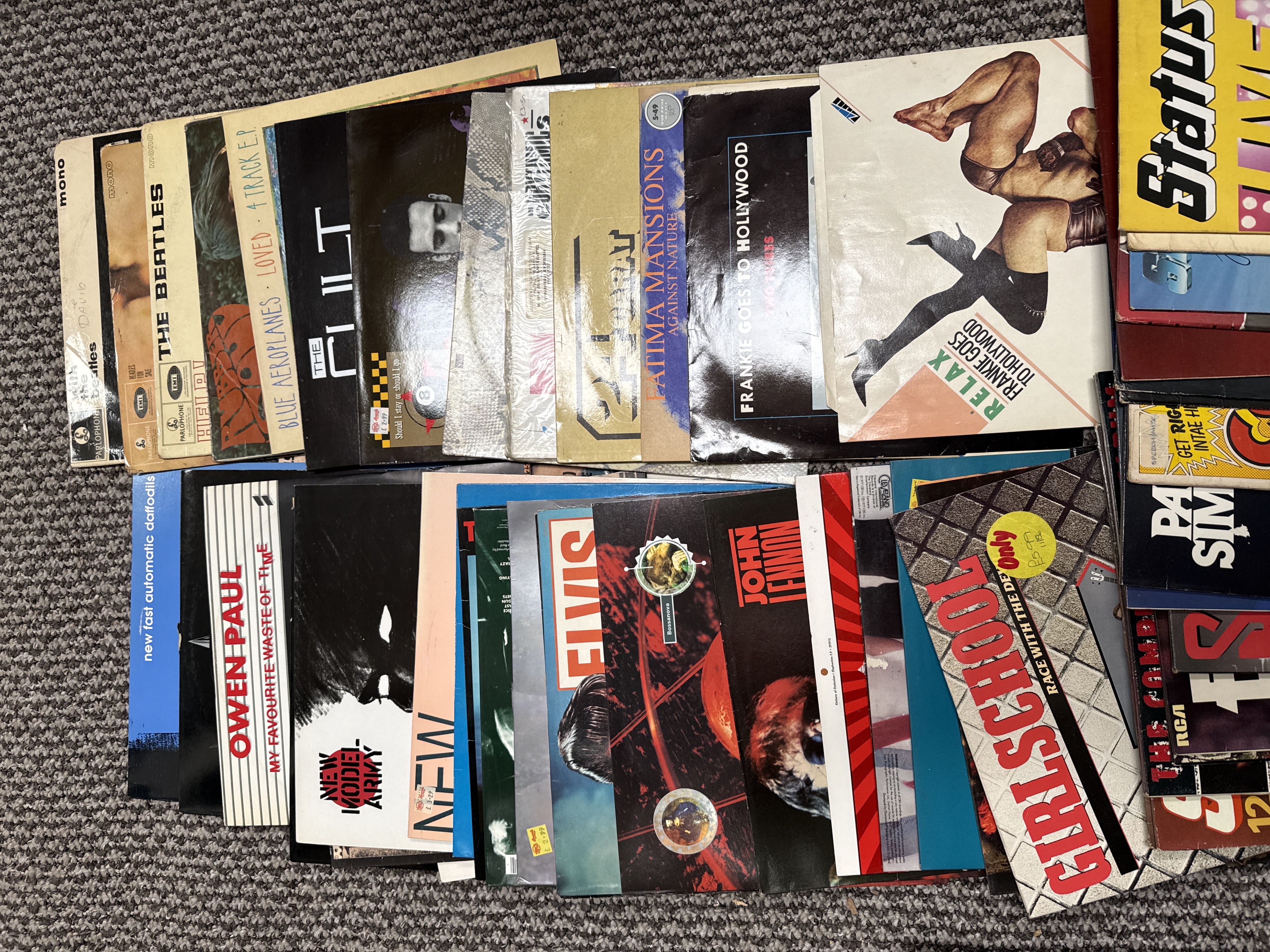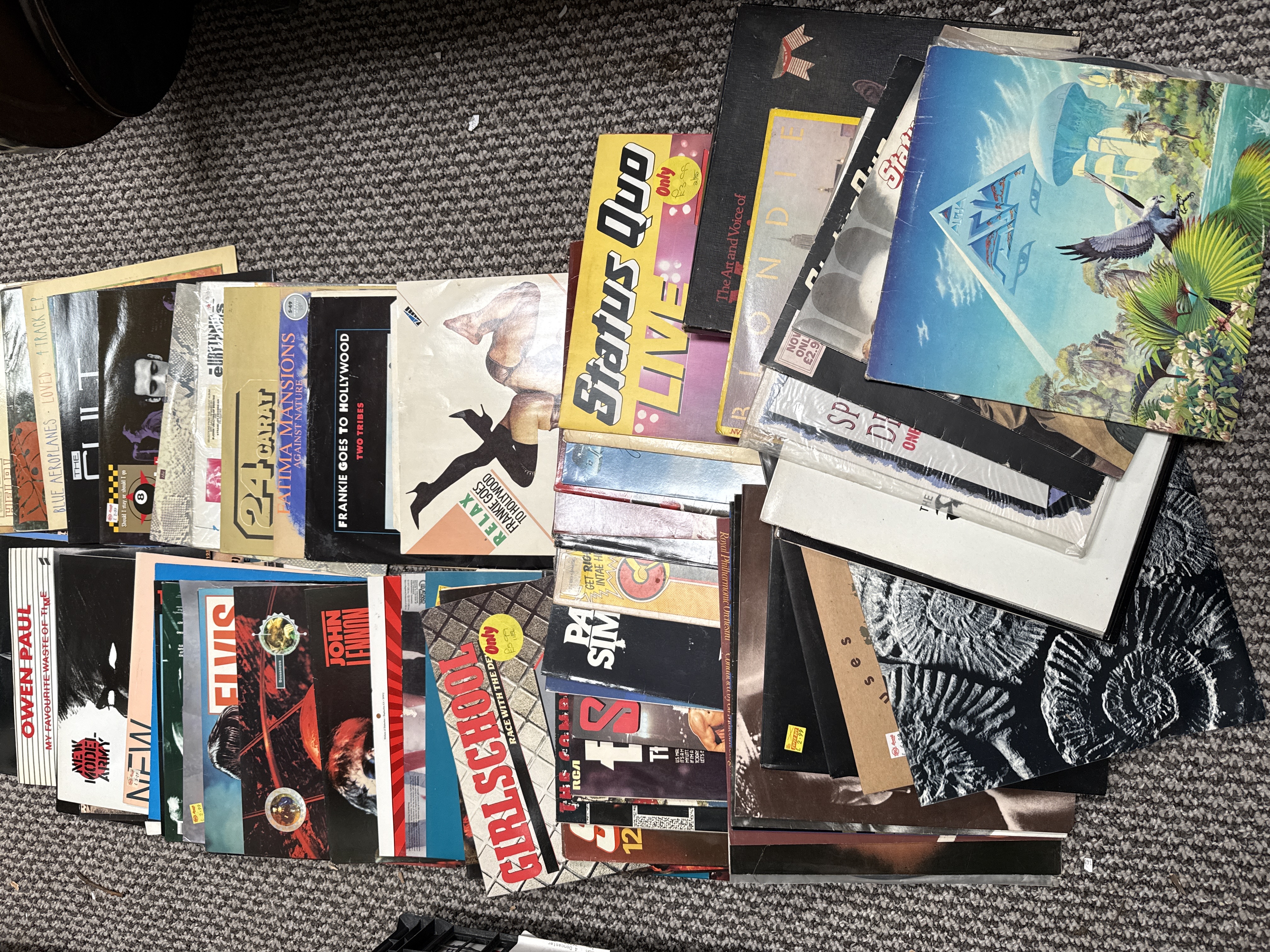 A collection of approximately 40 vinyl records, comprising 12-inch Long Play (LP) albums and 12-inch singles. The lot includes a variety of genres spanning the 1960s to the 1980s, including beat, pop, rock, new wave, and heavy metal. Identified items include two early United Kingdom mono pressings by The Beatles on the Parlophone label, titled With The Beatles and Help!. Other identified titles include Asia – Alpha, Status Quo – Live, and Girlschool – Race With The Devil. The collection features several 12-inch singles by Frankie Goes To Hollywood, including Relax and Two Tribes. Other artists visible within the lot include Blondie, The Cult, New Model Army, Elvis Presley, John Lennon, Owen Paul, Fatima Mansions, Spandau Ballet, and The Blue Aeroplanes. The items are primarily housed in printed cardboard sleeves, some of which are contained within protective plastic outers.