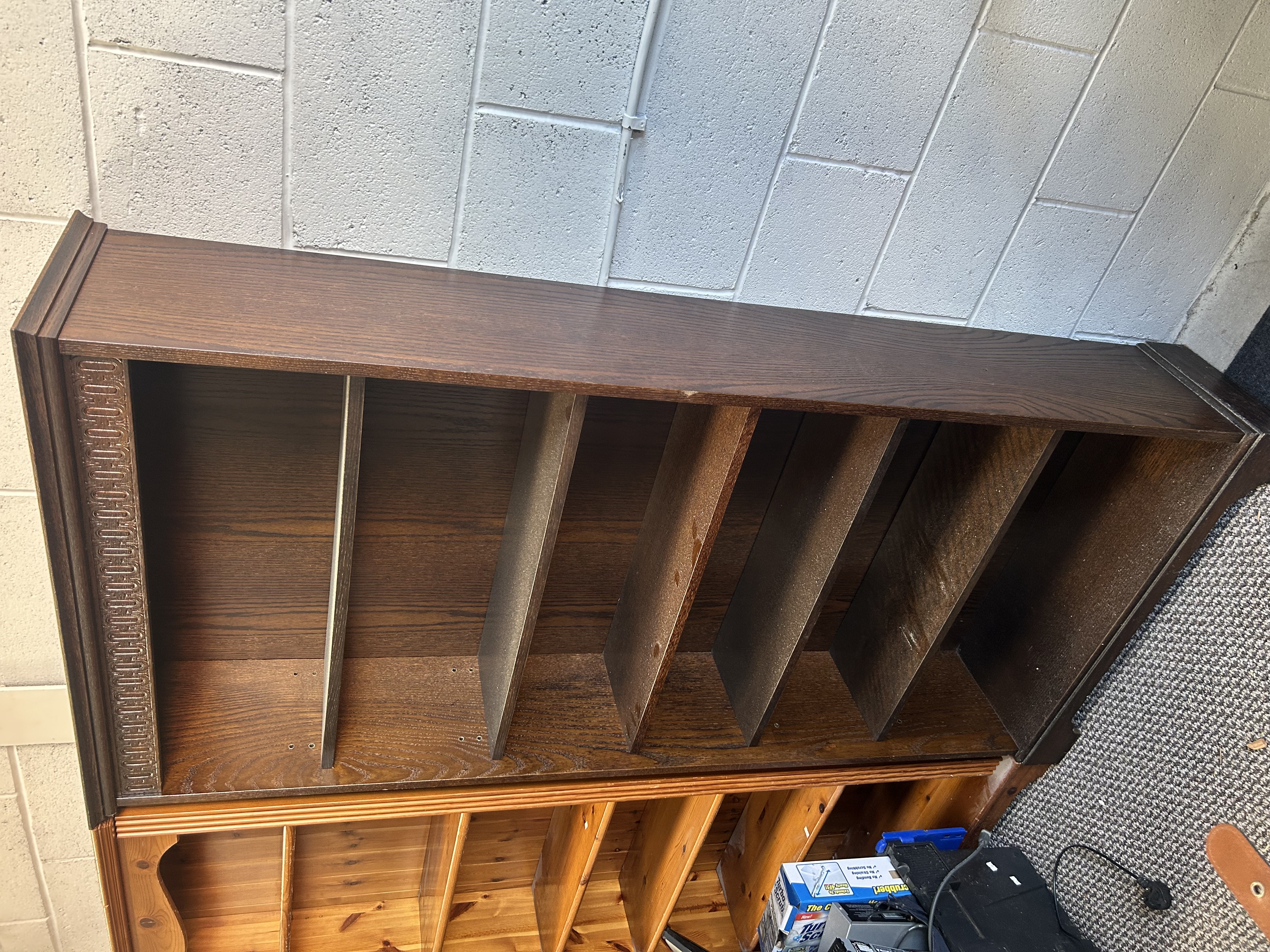 A contemporary open-fronted shelf unit, likely designed as the upper section of a modular bookcase or dresser. The piece is constructed from dark-stained wood veneer over a composite core, showing a prominent grain. It features a moulded cornice at the top and five fixed vertical dividers that create six open storage compartments. The side panels are decorated with a carved geometric pattern of repeating recessed oval motifs. The unit is currently shown resting on an unrelated knotty pine base.